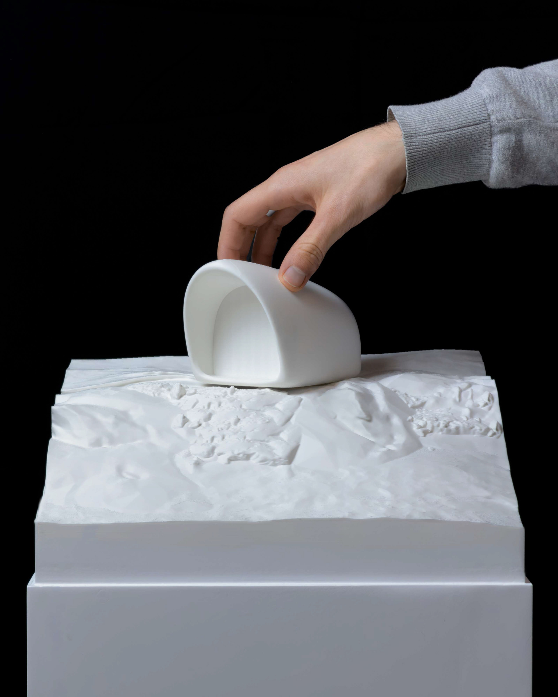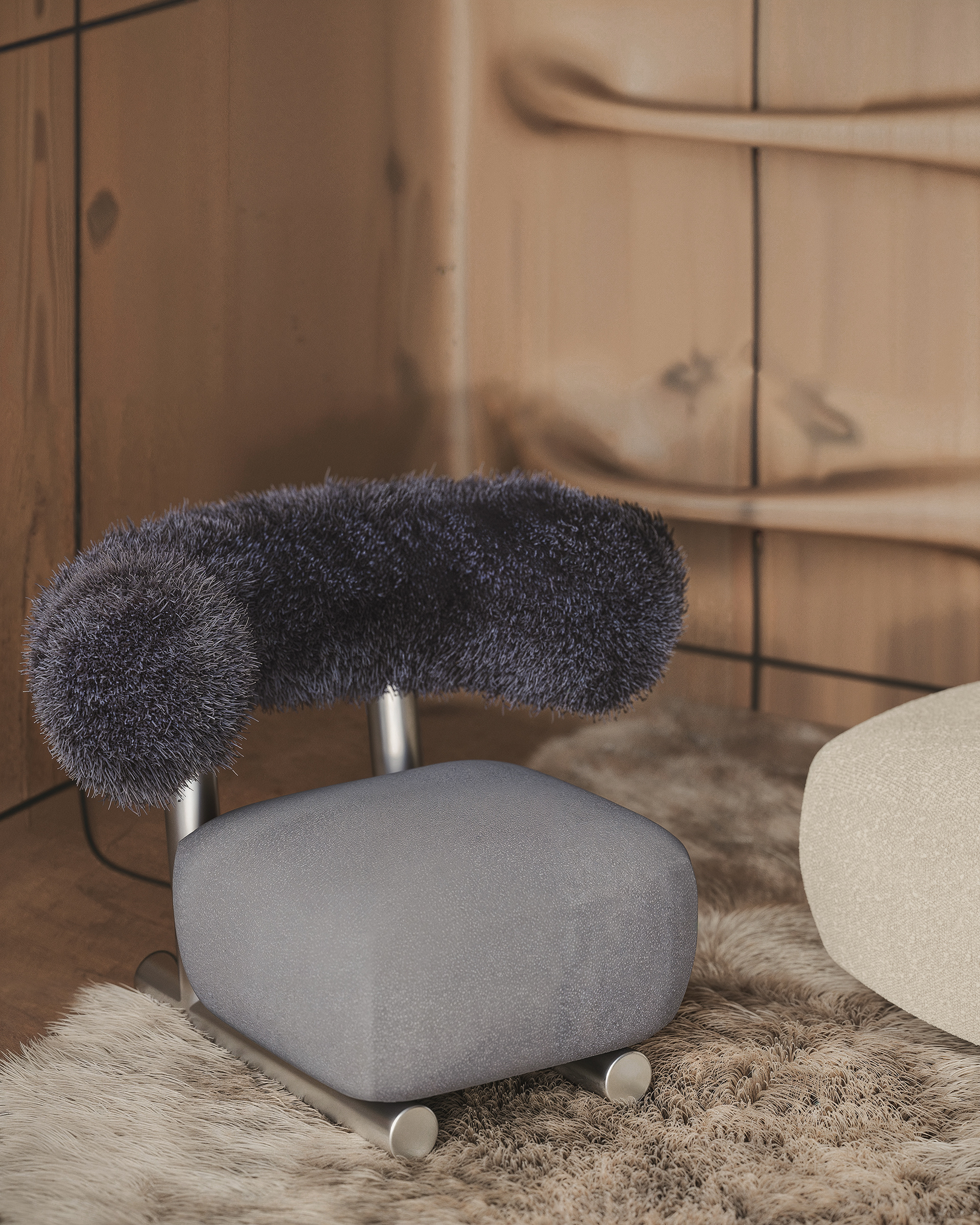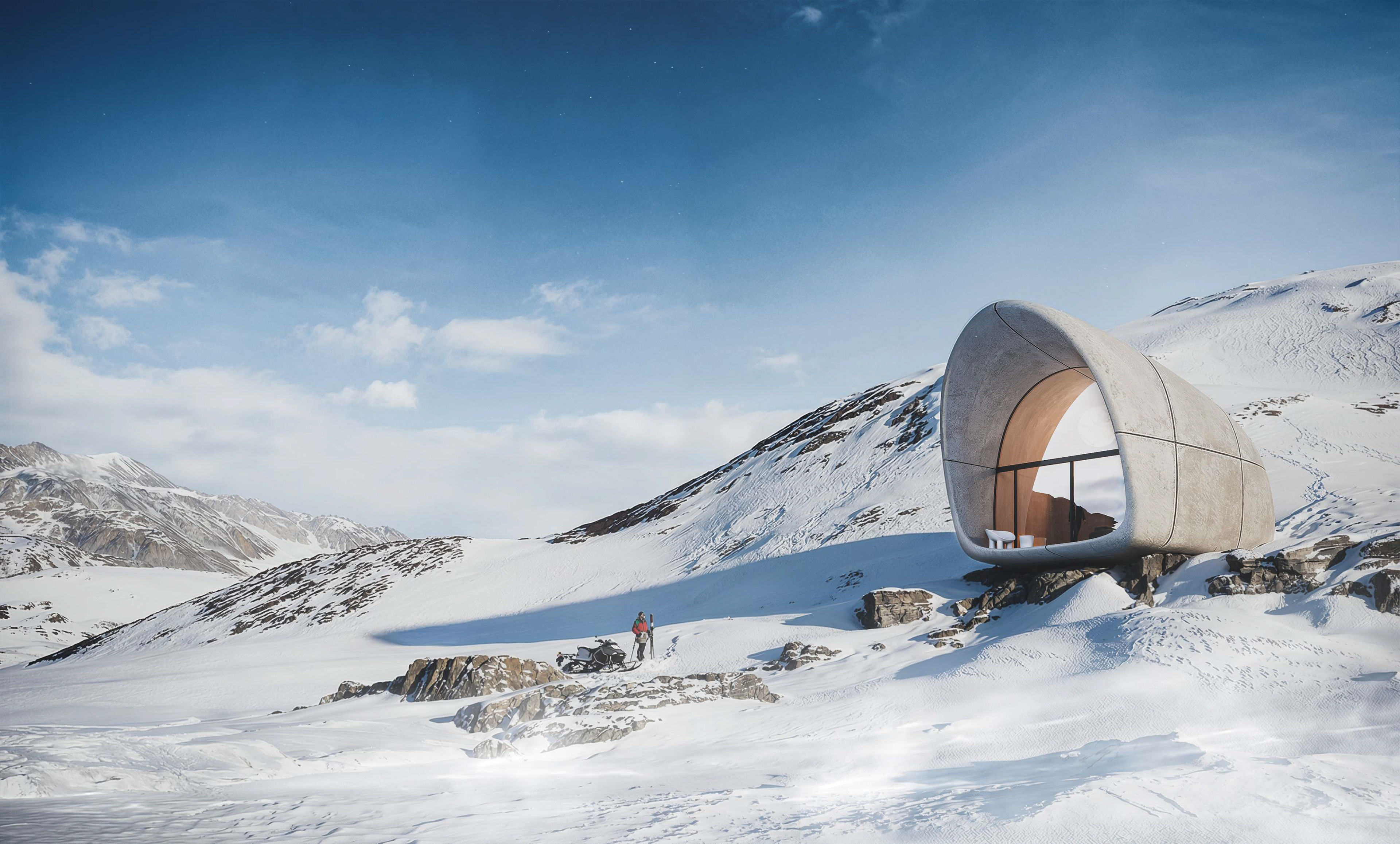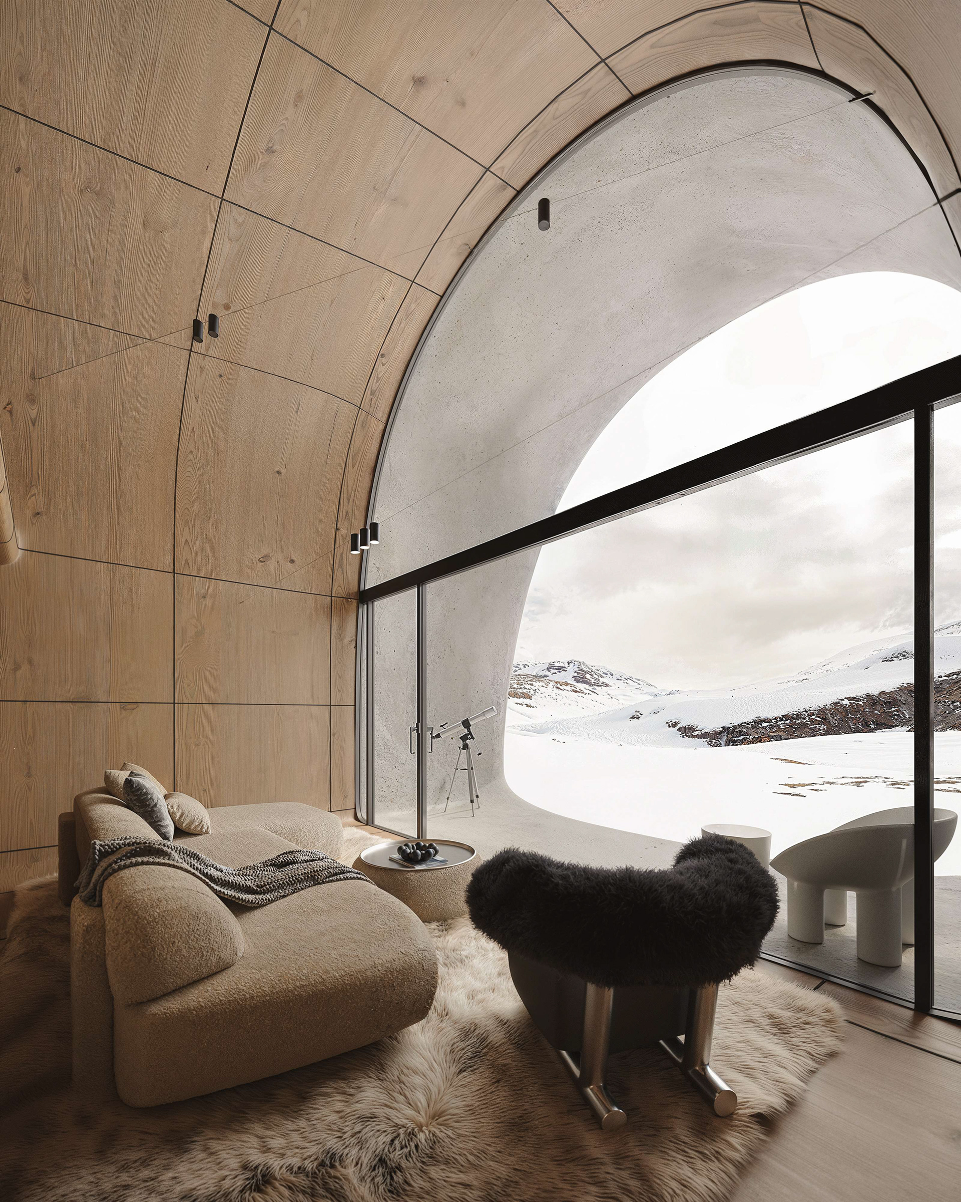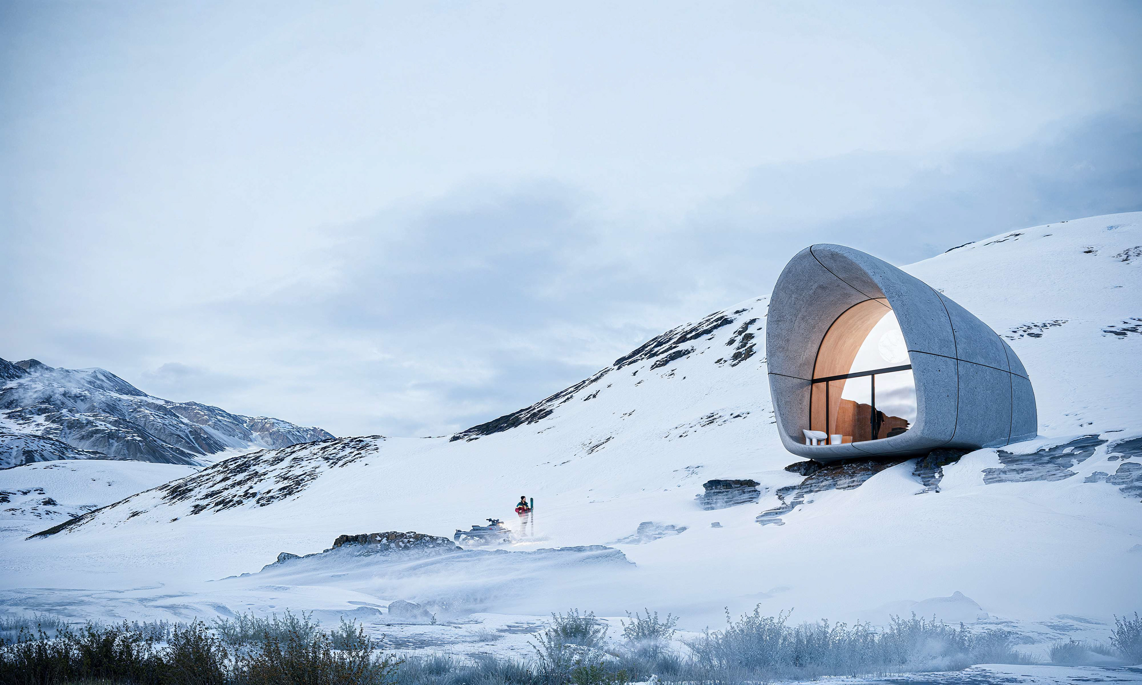 Each cottage is conceived as a continuation of nature rather than an object placed within it. The fiber concrete exterior will age and merge with the terrain, while the interior remains calm and enduring. The result is a space that fades into its surroundings, offering a rare kind of silence and clarity, where architecture serves only to frame the presence of the mountain itself.