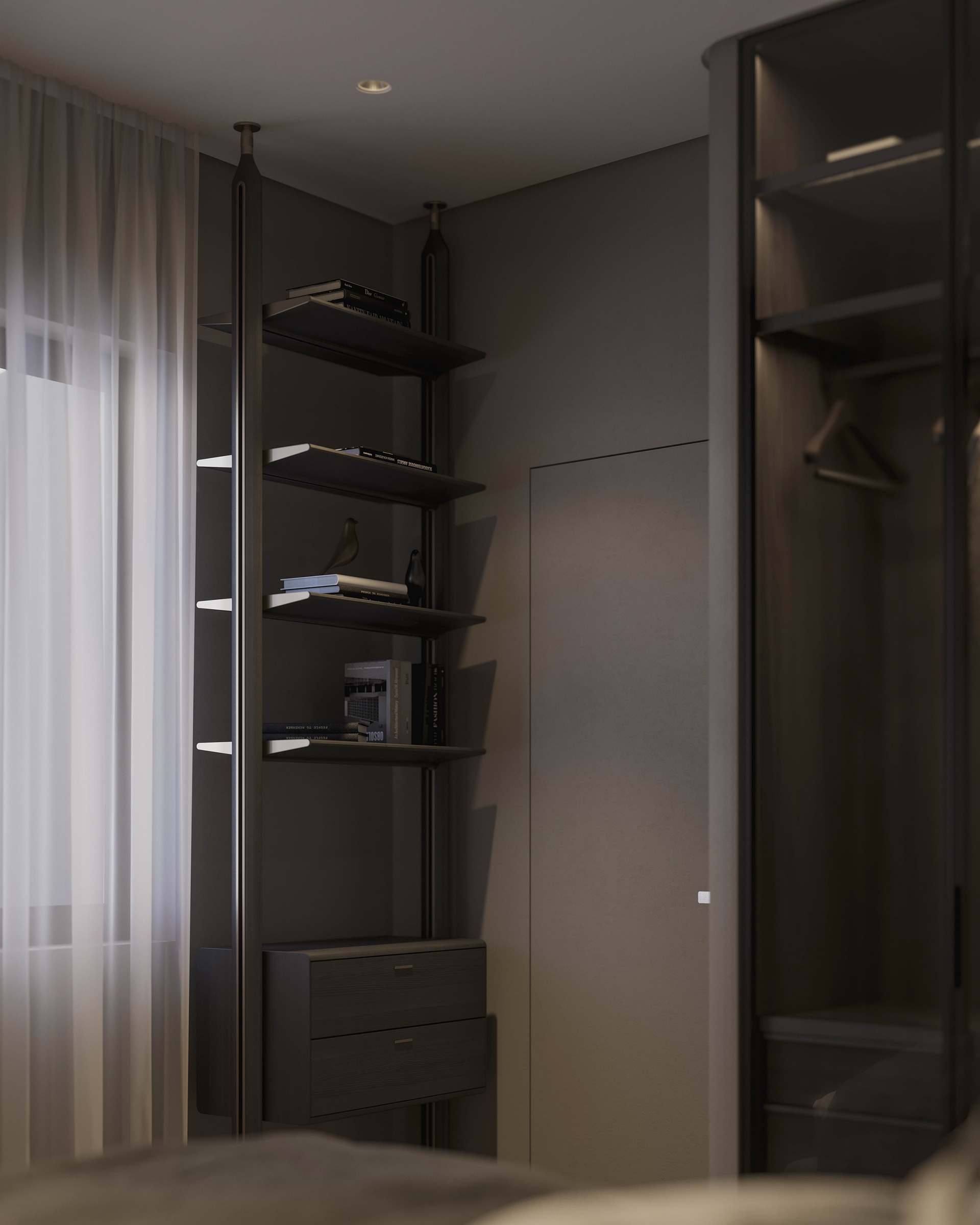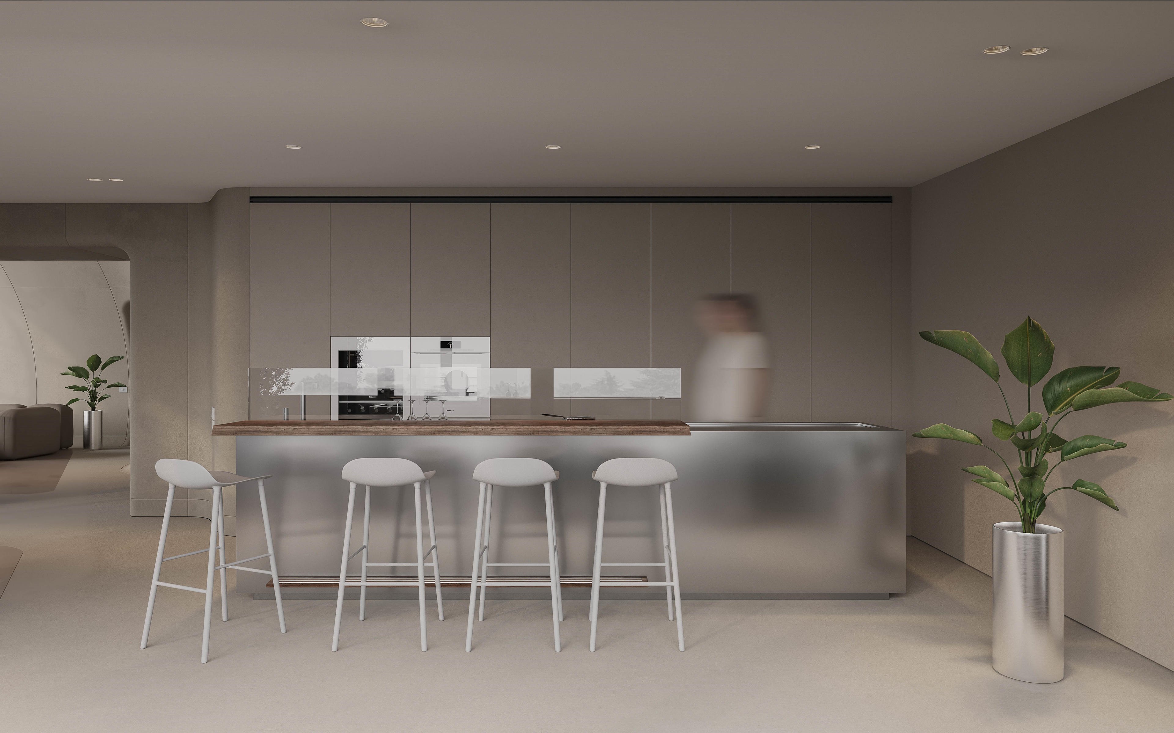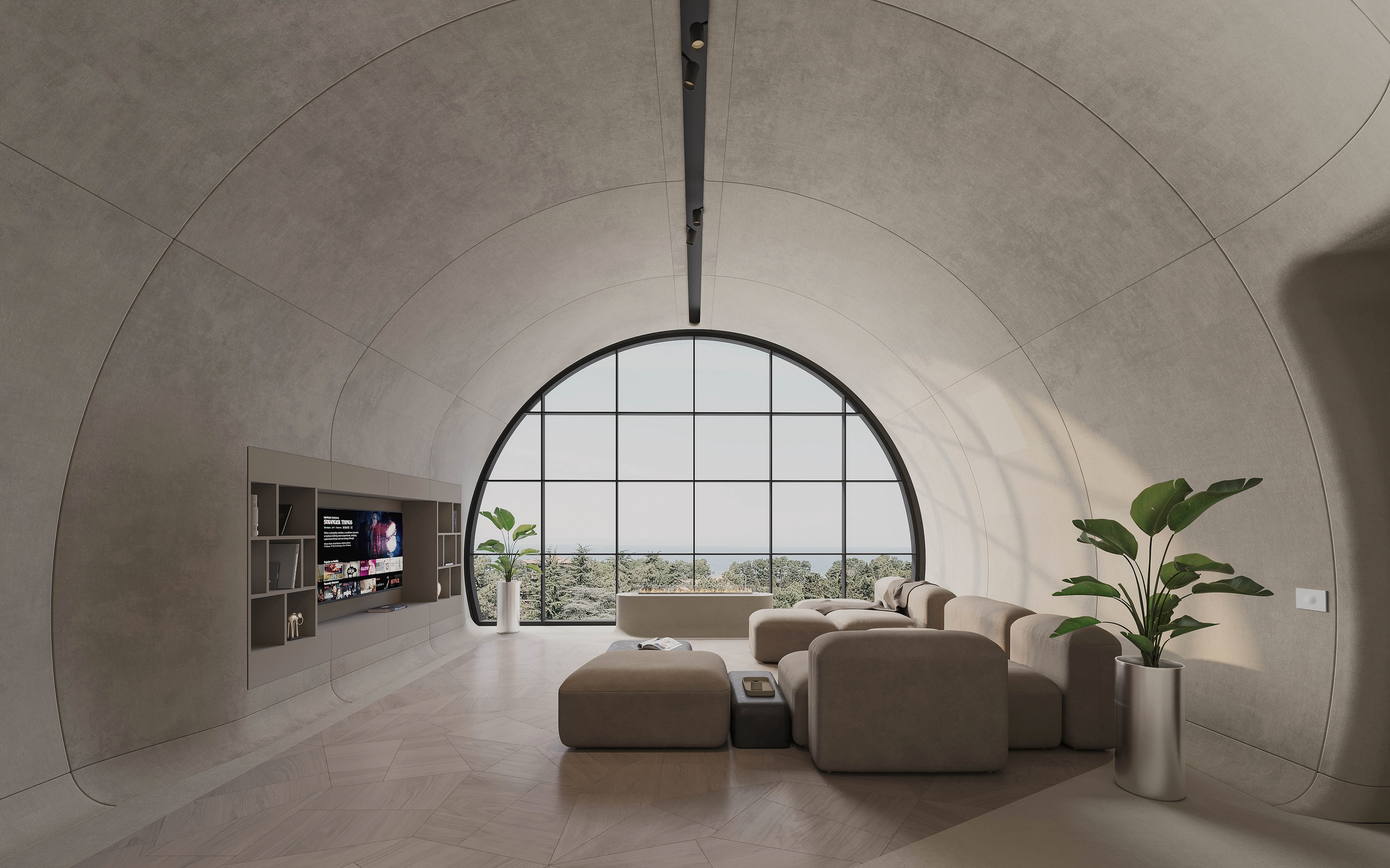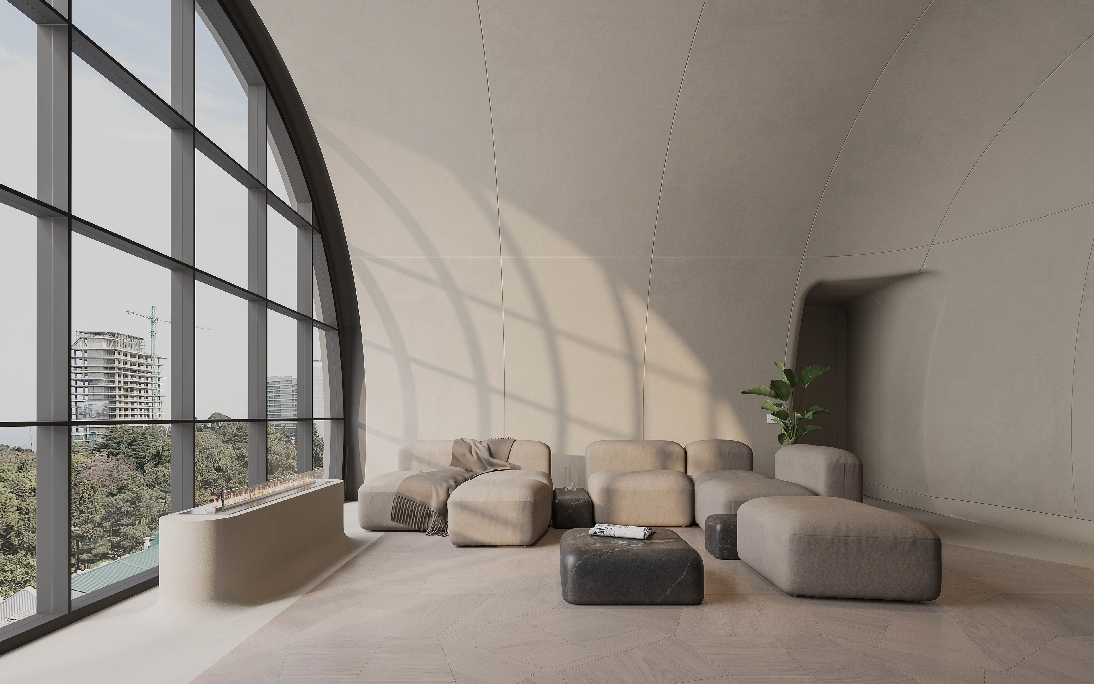 Staying true to the minimalist essence, the raw fiber-concrete backdrop lets biophilic design elements stand out. Lush green plants enhance the space, linking the interior to the scenic views of the boulevard framed by a sizable arched window.