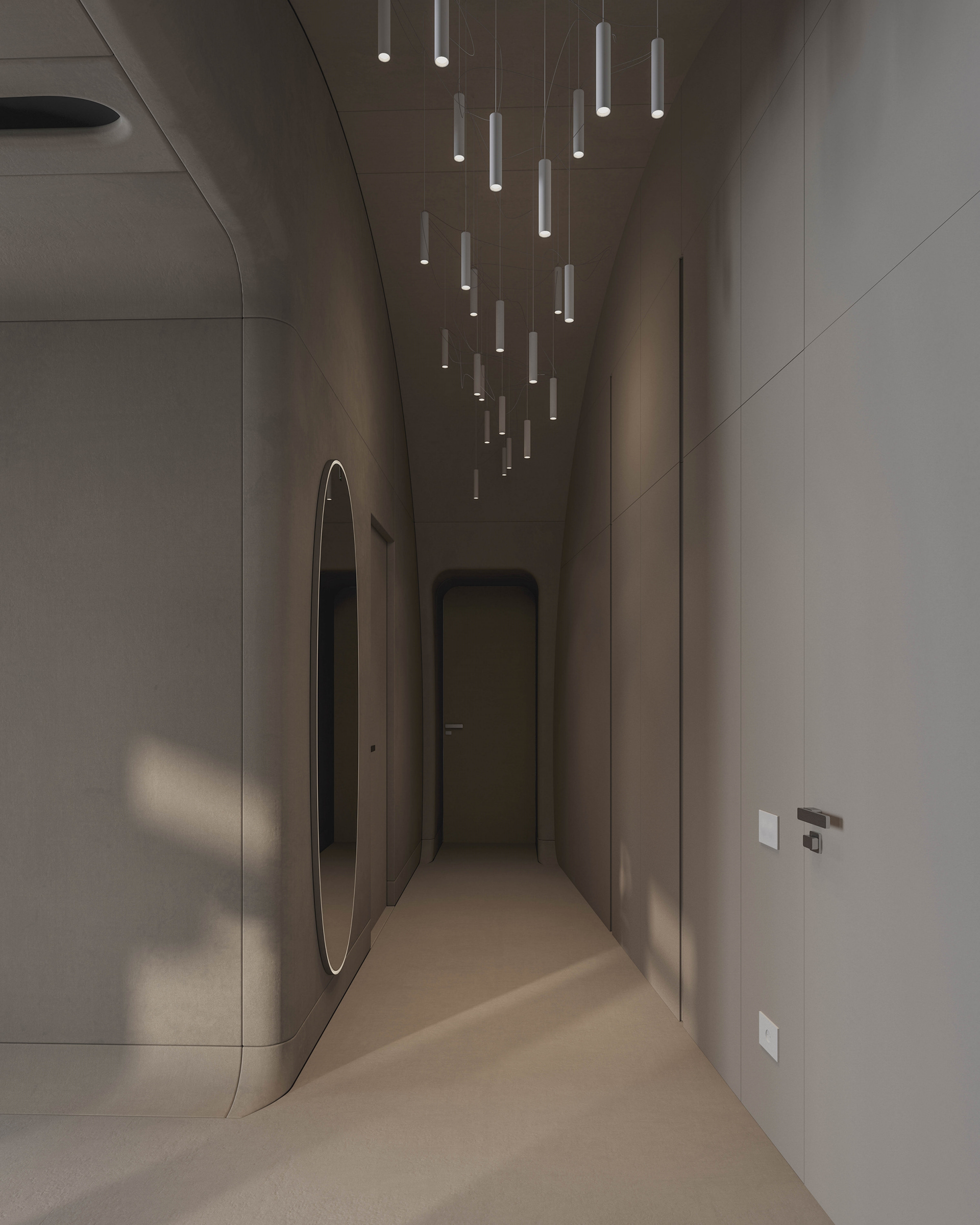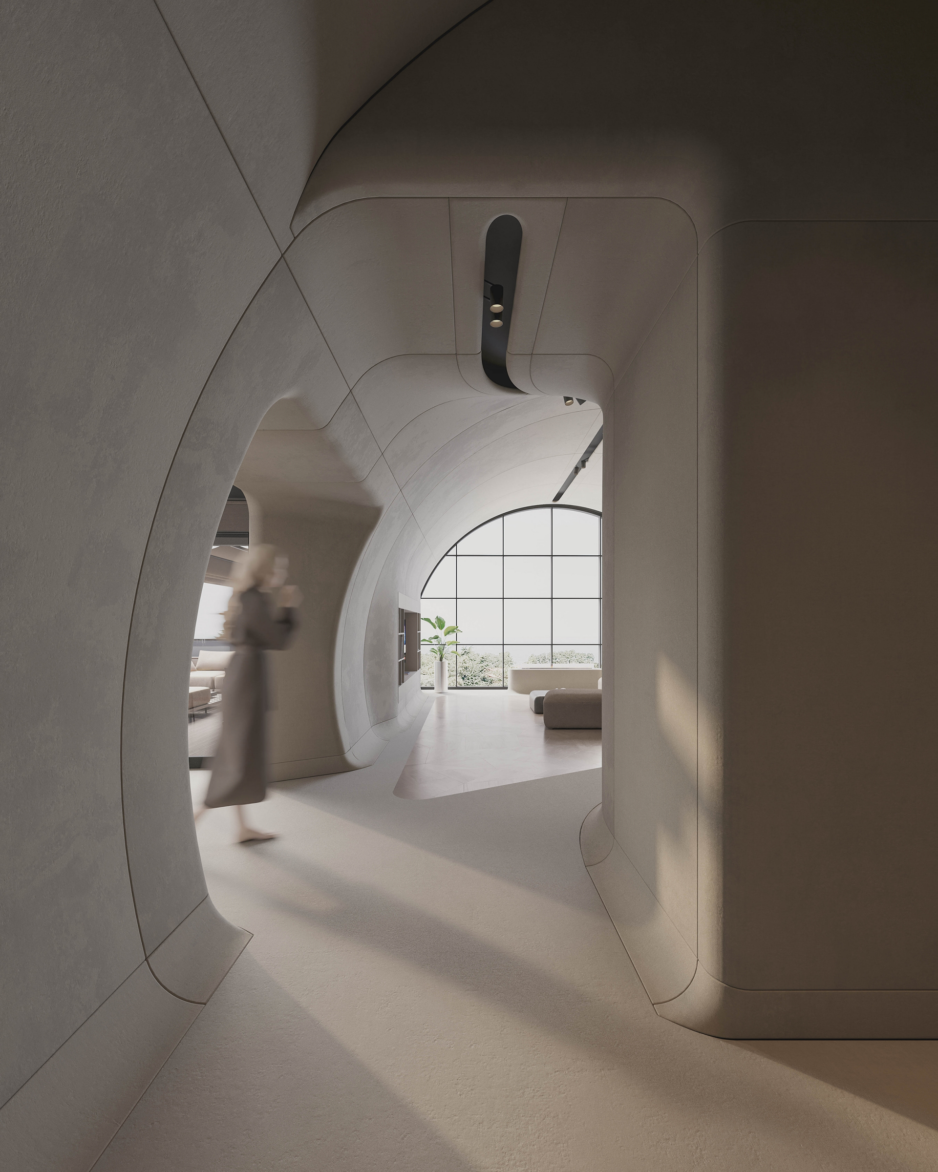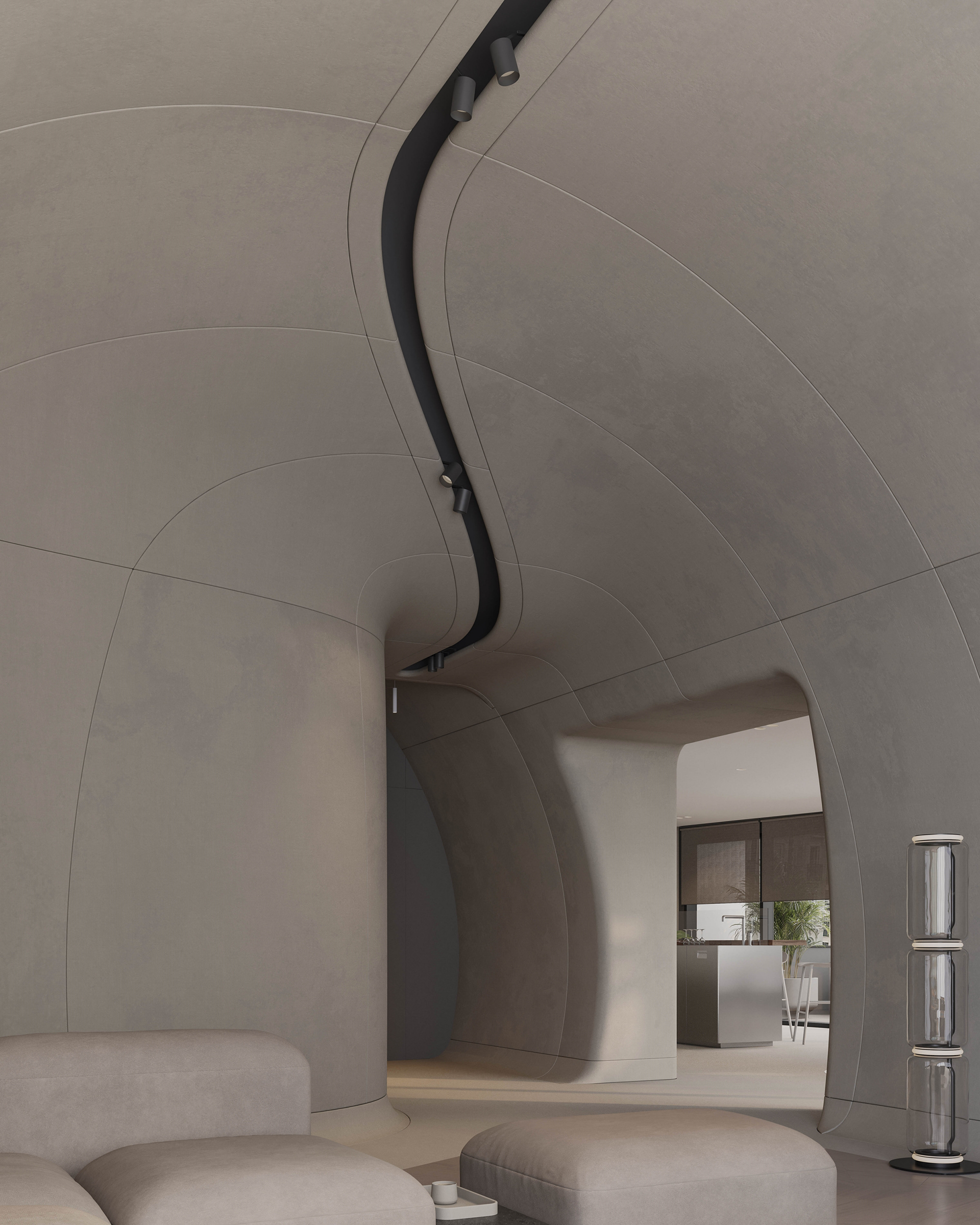 The apartment's distinctive layout features a central tunnel flanked by two flat-ceilinged wings, sparking a design intent to harmonize these contrasting spaces. This was achieved by cladding the main tunnel with a biomorphic shell of fiber-concrete panels, which augments the sense of spatial continuity, guiding visitors from a compressed corridor to a radiant expanse.