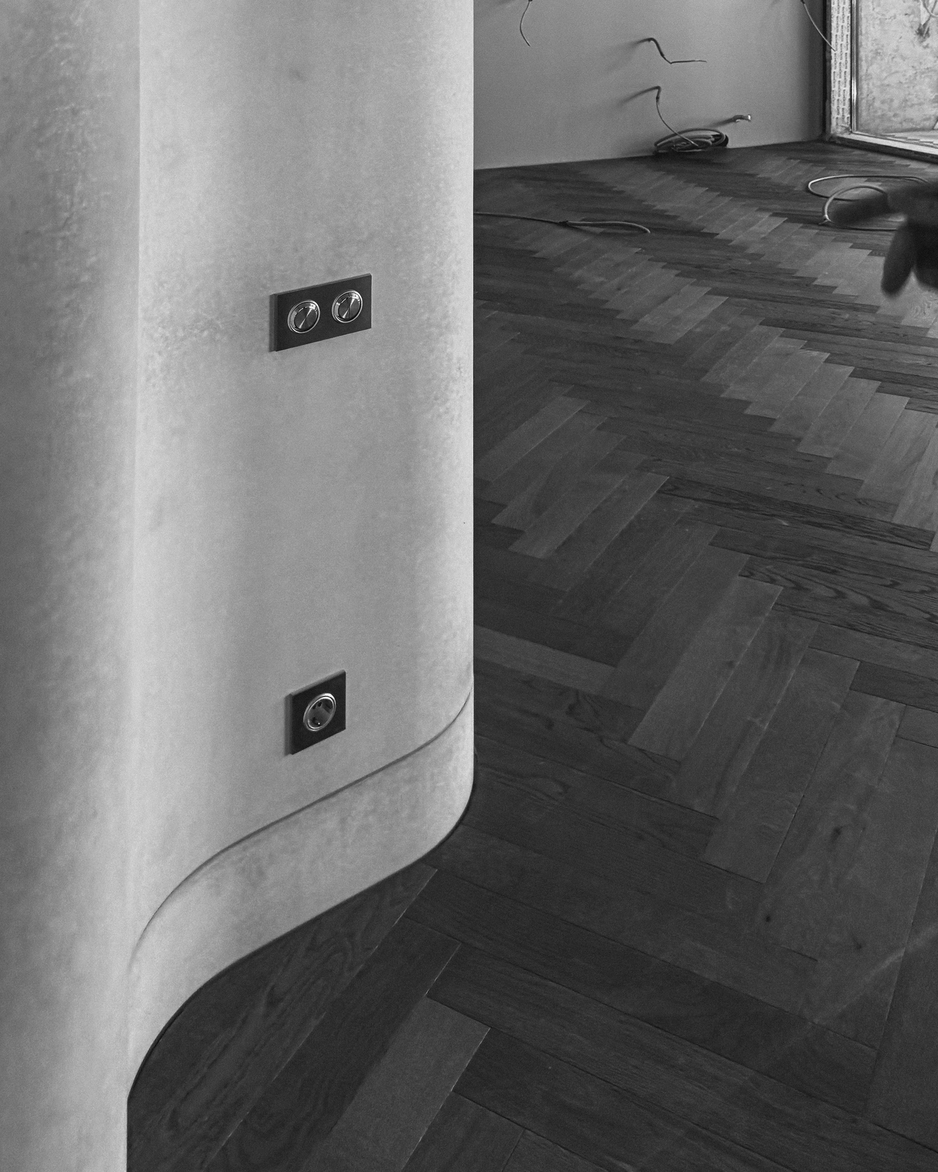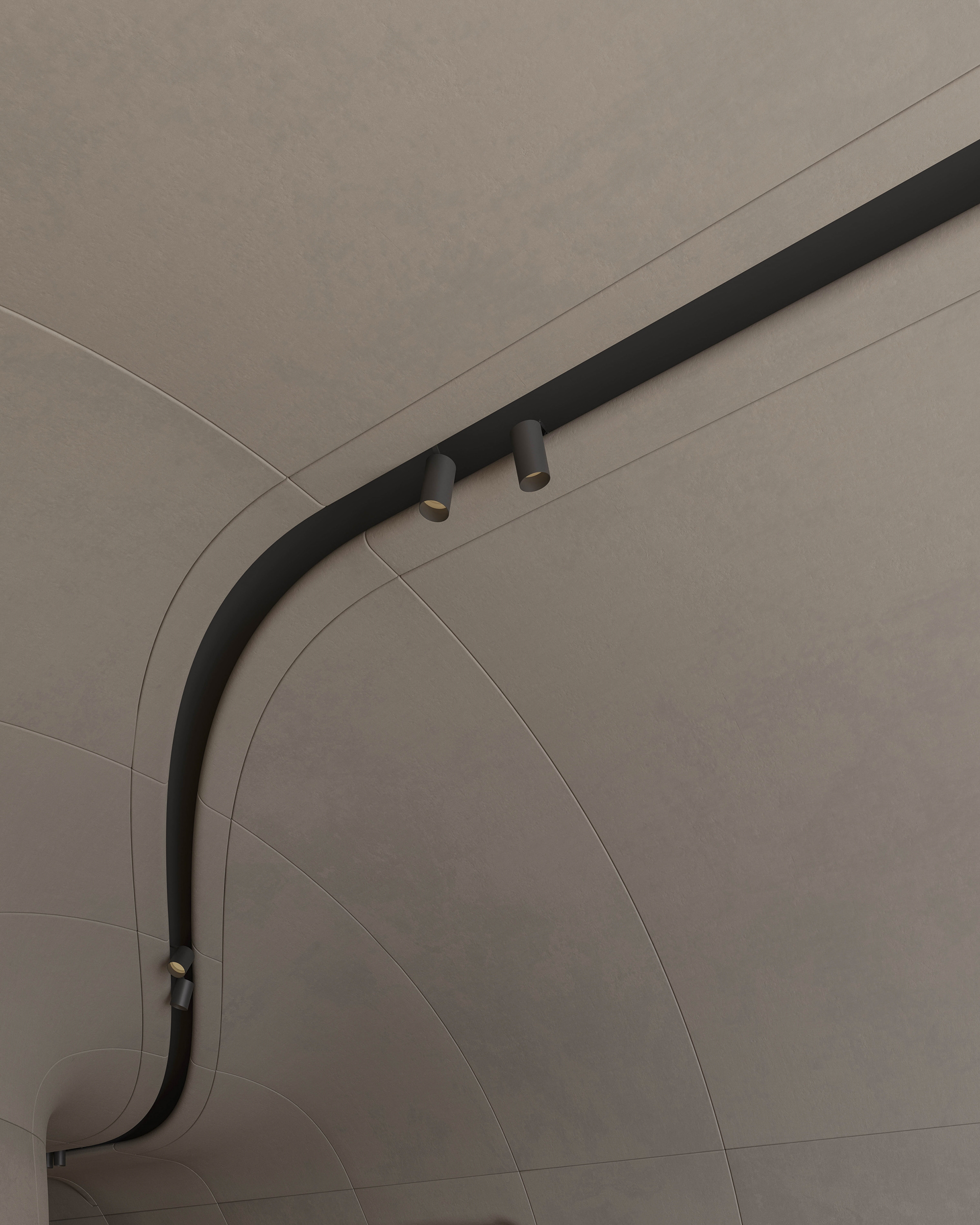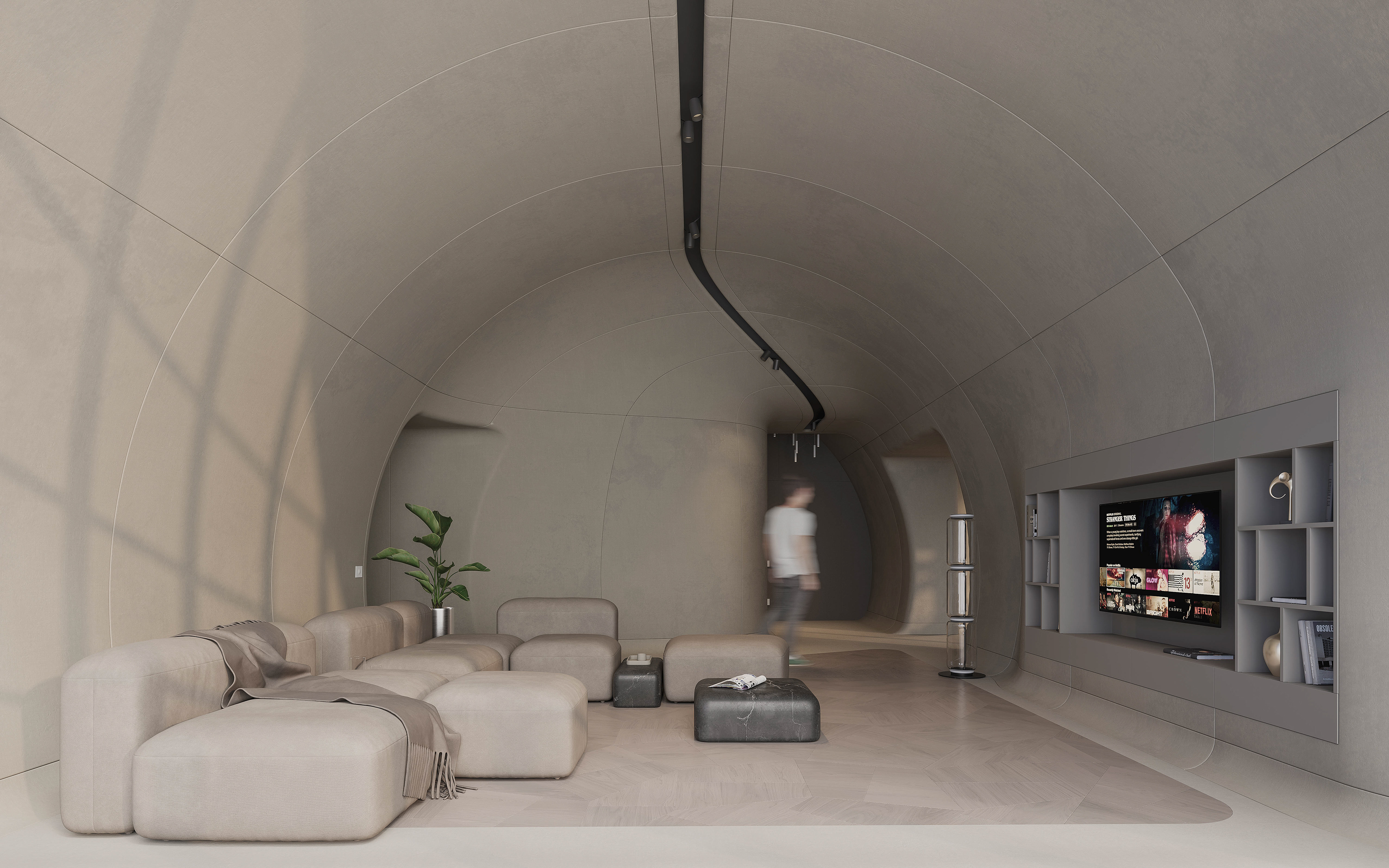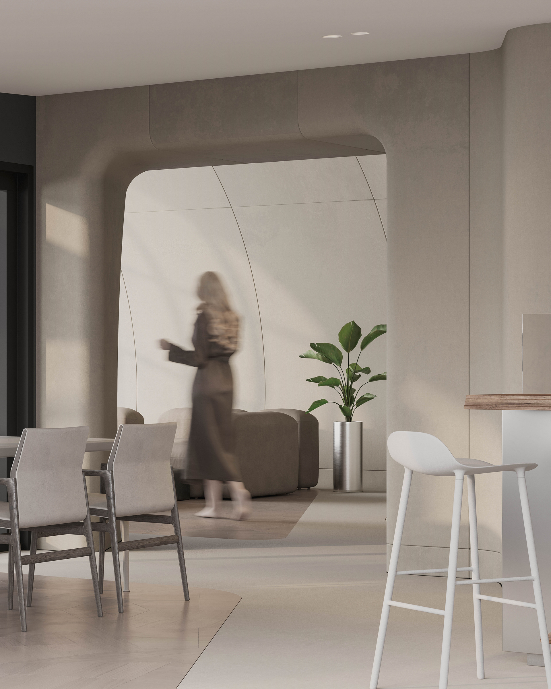 The apartment's distinctive layout features a central tunnel flanked by two flat-ceilinged wings, sparking a design intent to harmonize these contrasting spaces. This was achieved by cladding the main tunnel with a biomorphic shell of fiber-concrete panels, which augments the sense of spatial continuity, guiding visitors from a compressed corridor to a radiant expanse.