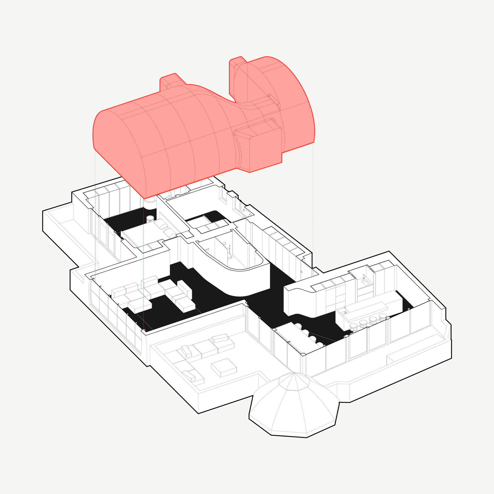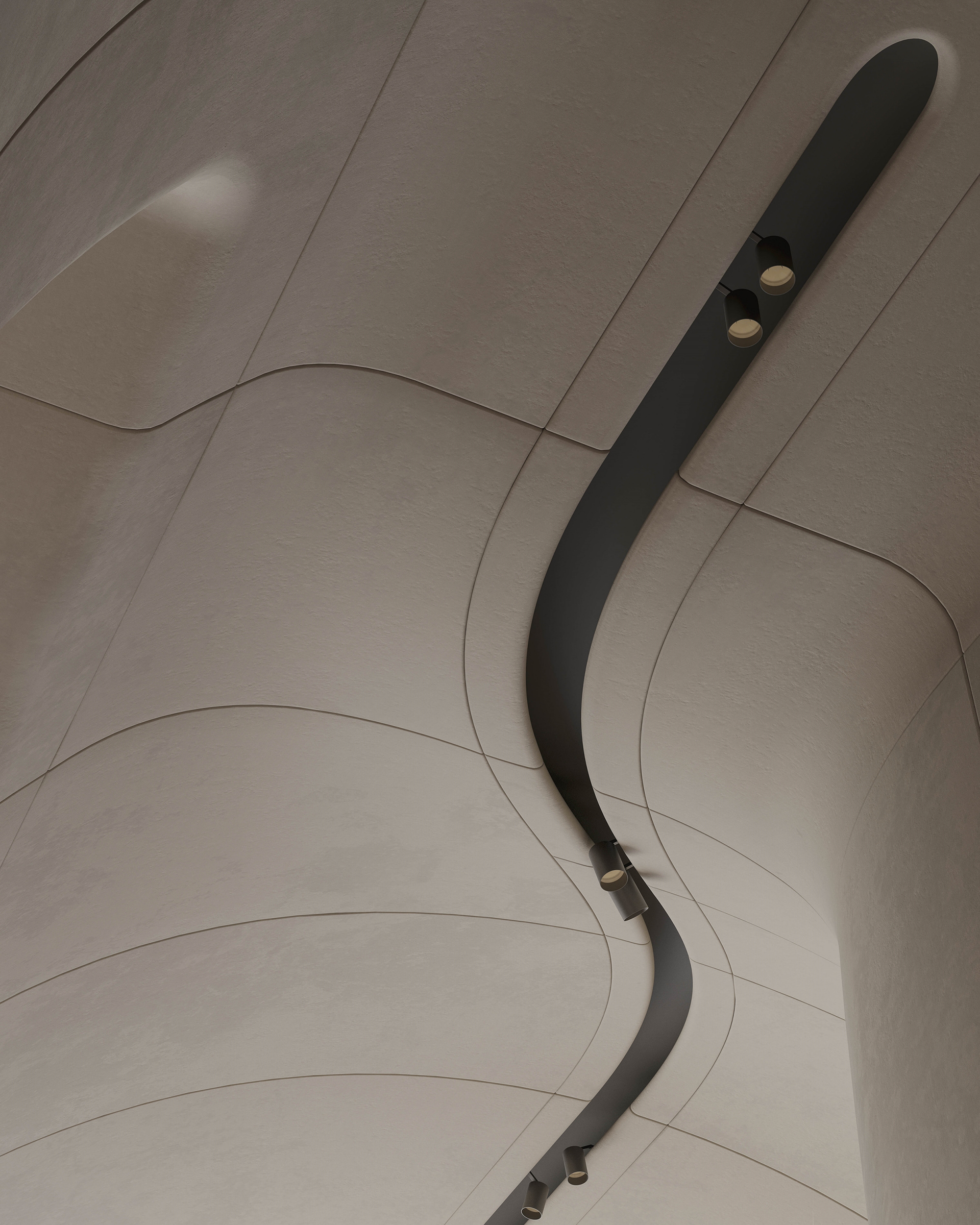 Biomorphic shell of fiber-concrete panels augments the sense of spatial continuity, guiding visitors from a compressed corridor to a radiant expanse.