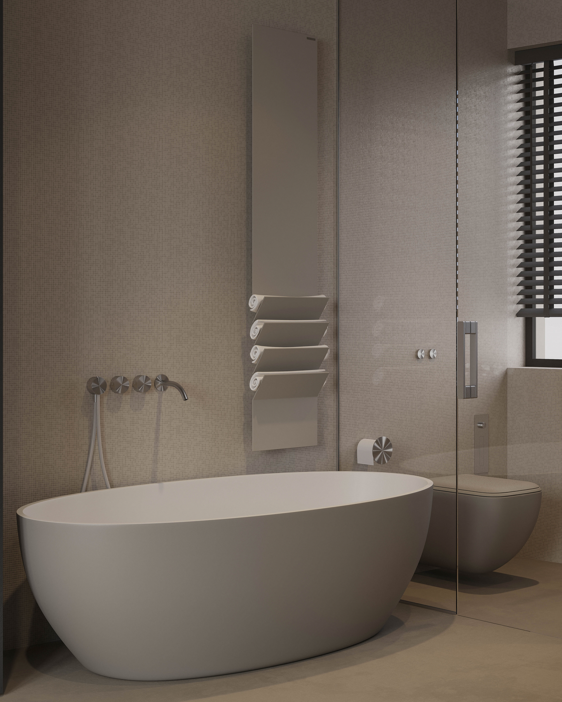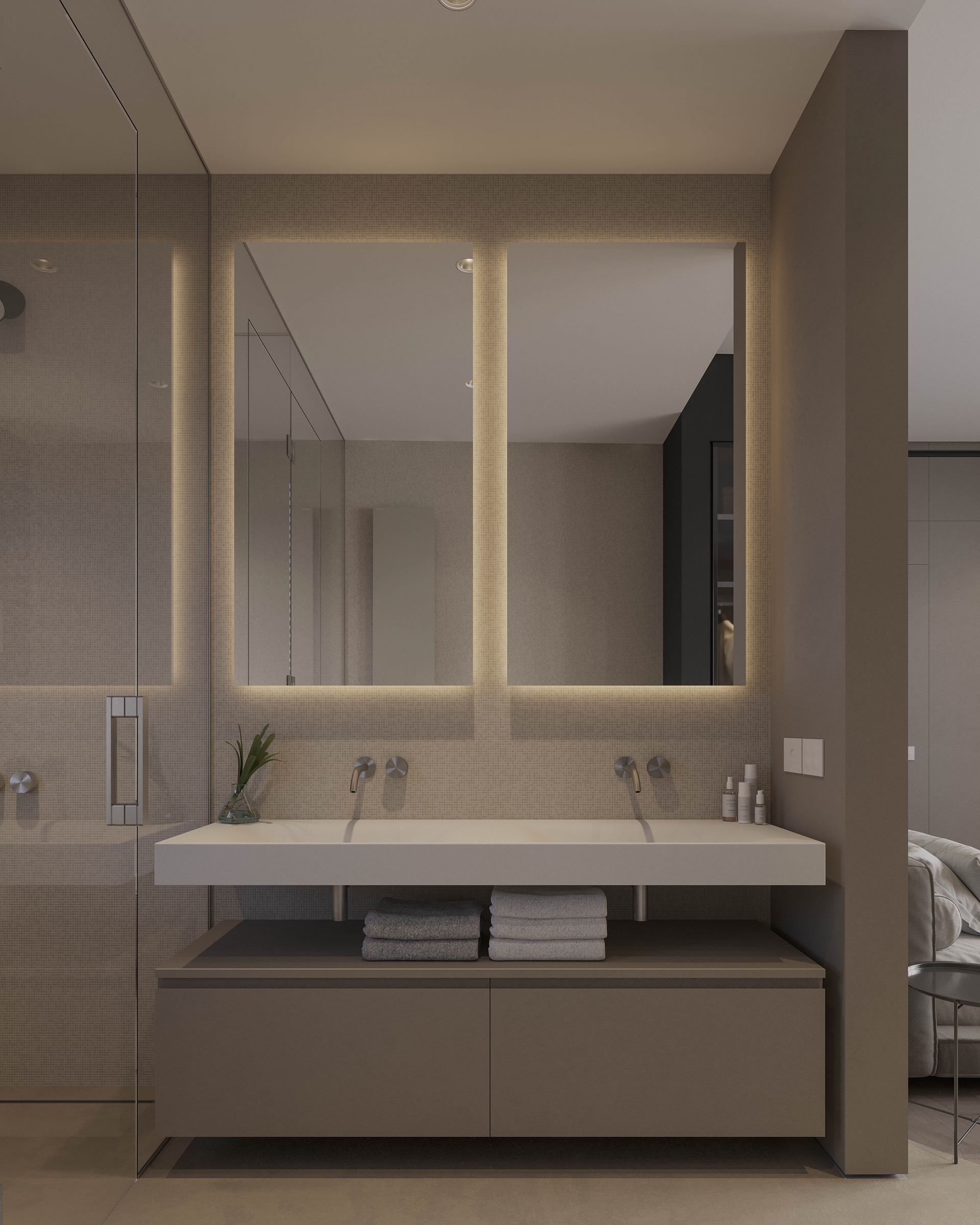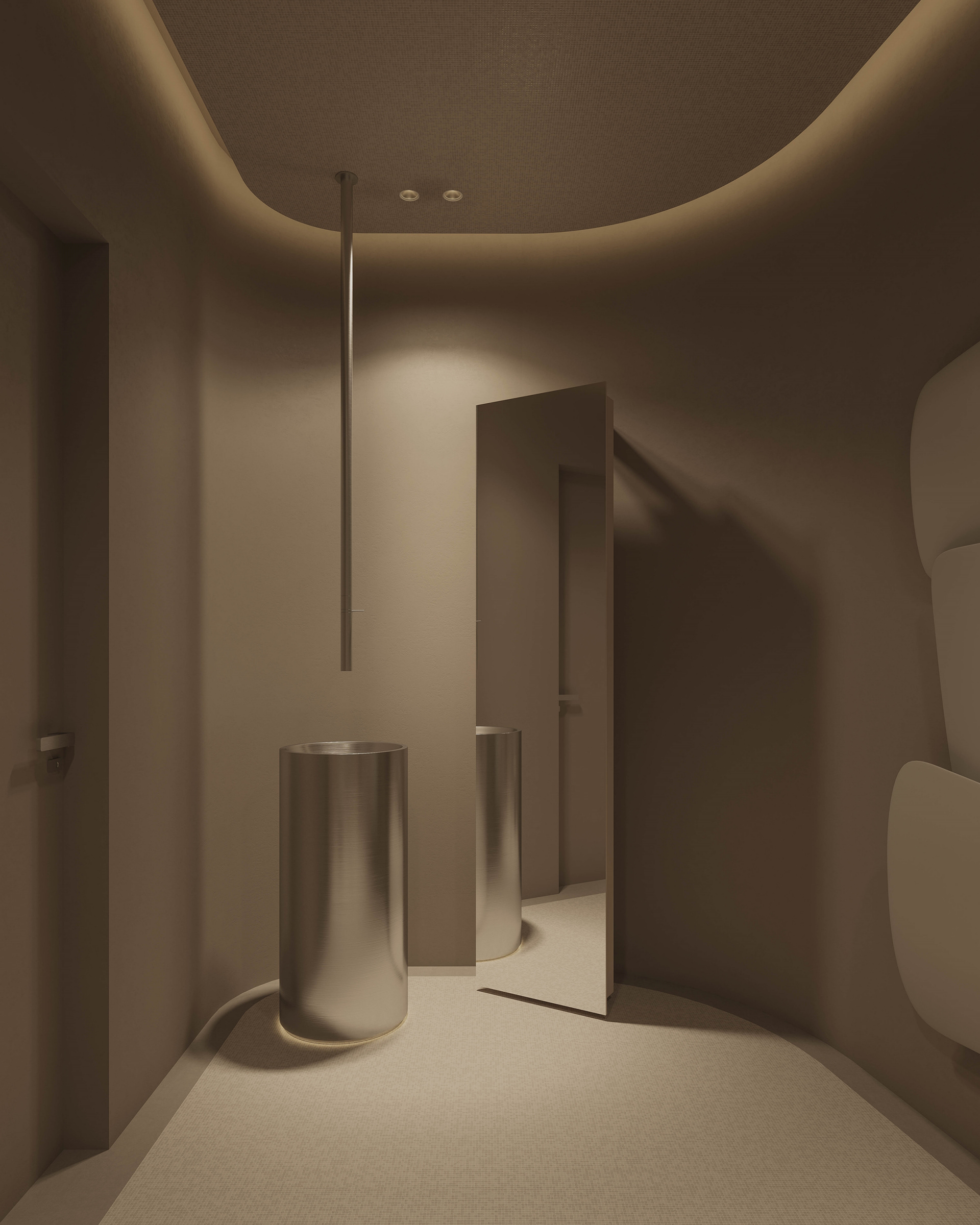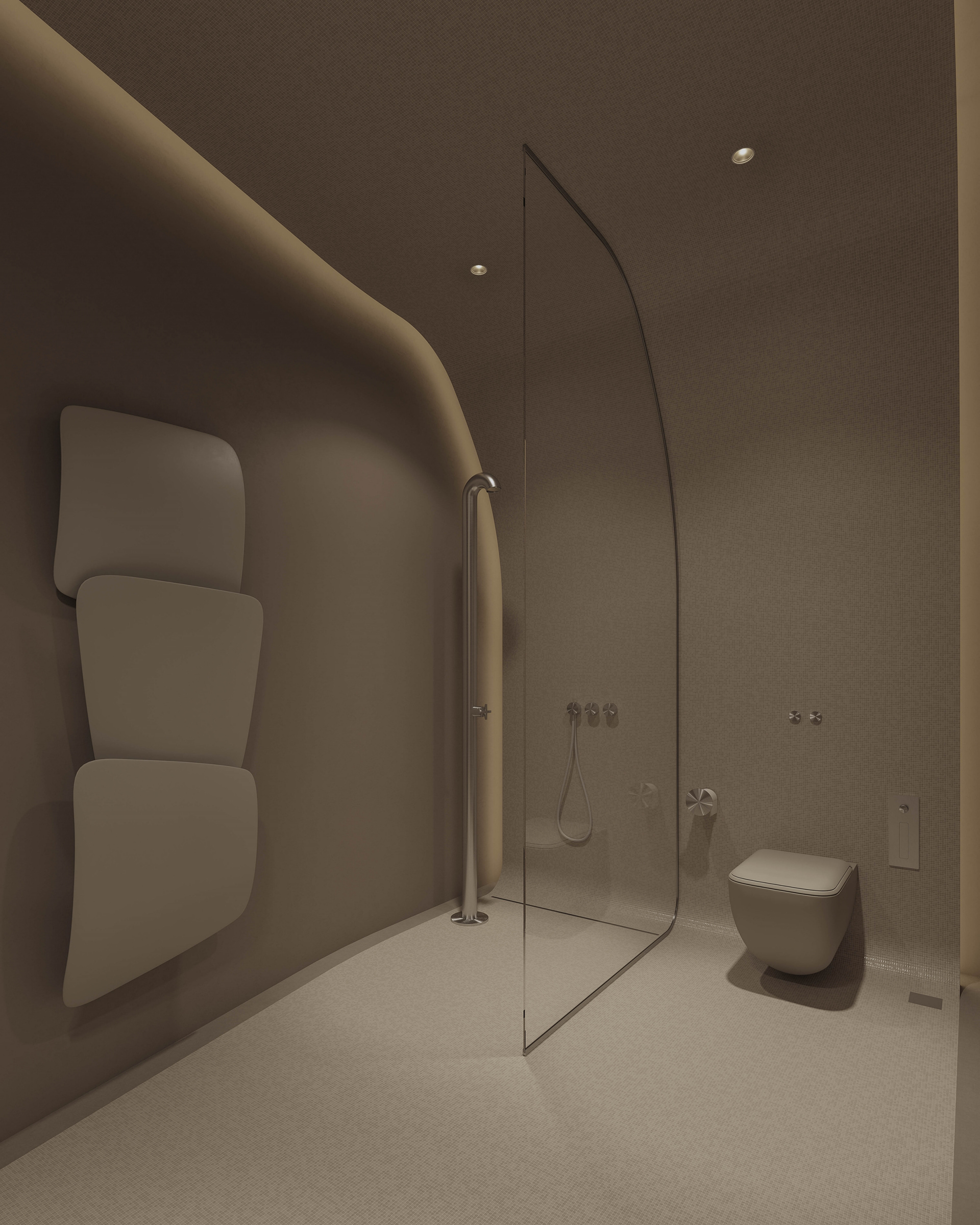 The guest bathroom echoes this design narrative, with micro mosaics tracing a path from the floor, melding into the walls and culminating at the ceiling, showcasing design coherence throughout.