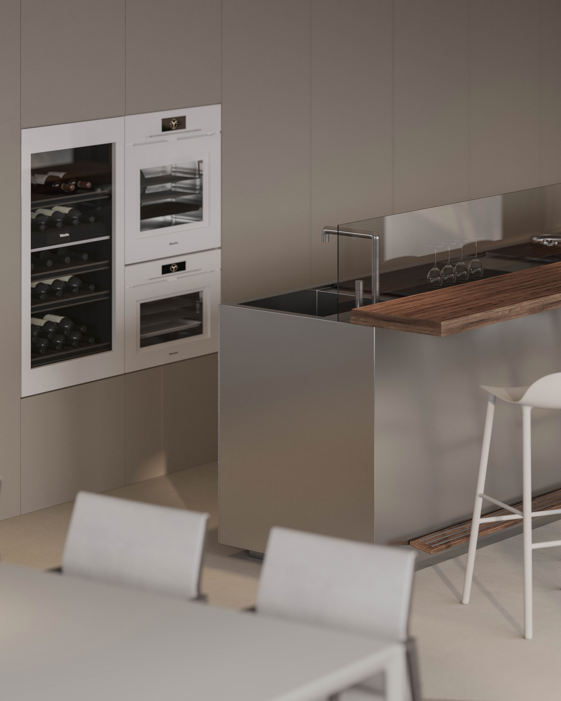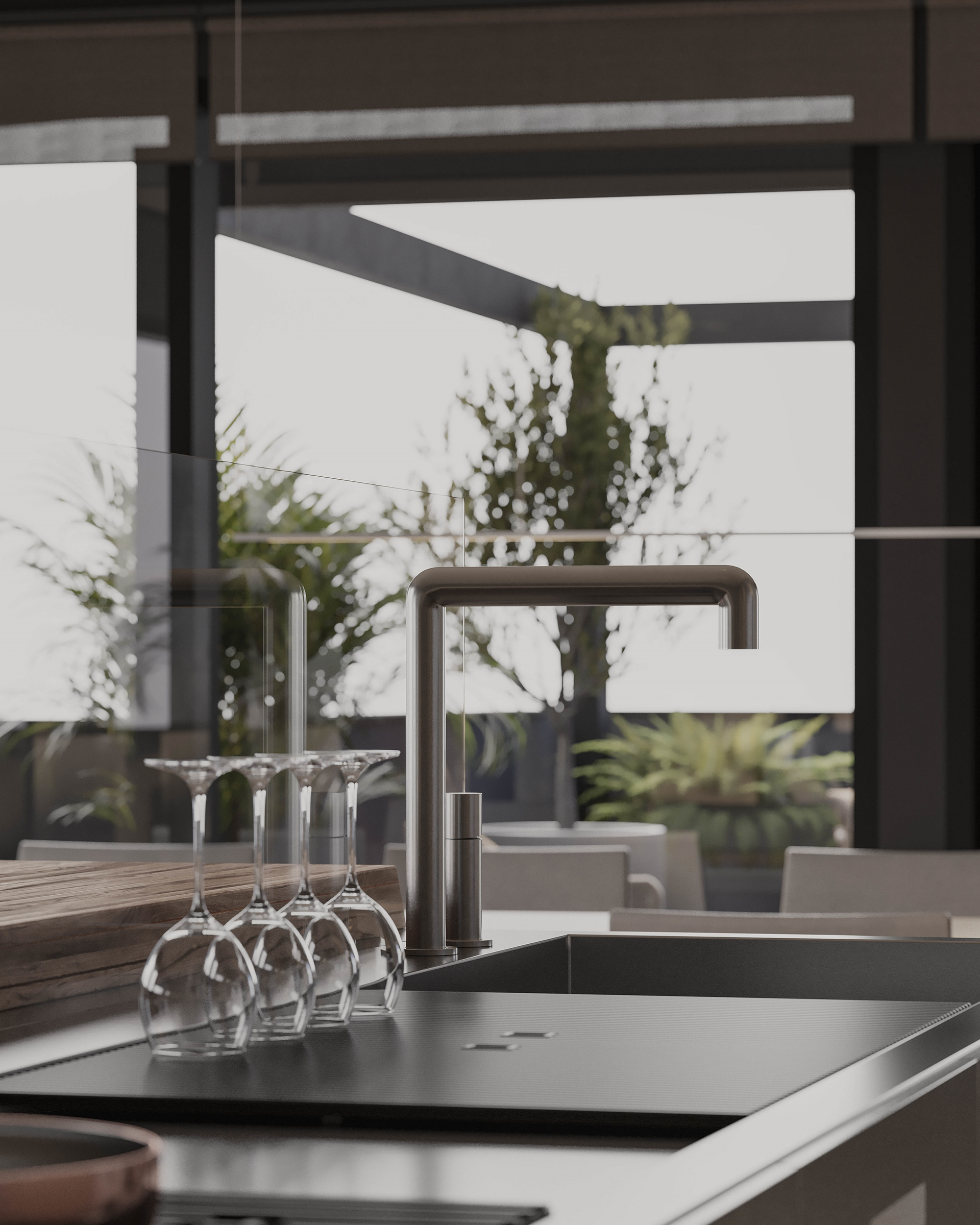 Staying true to the minimalist essence, the raw fiber-concrete backdrop lets biophilic design elements stand out.