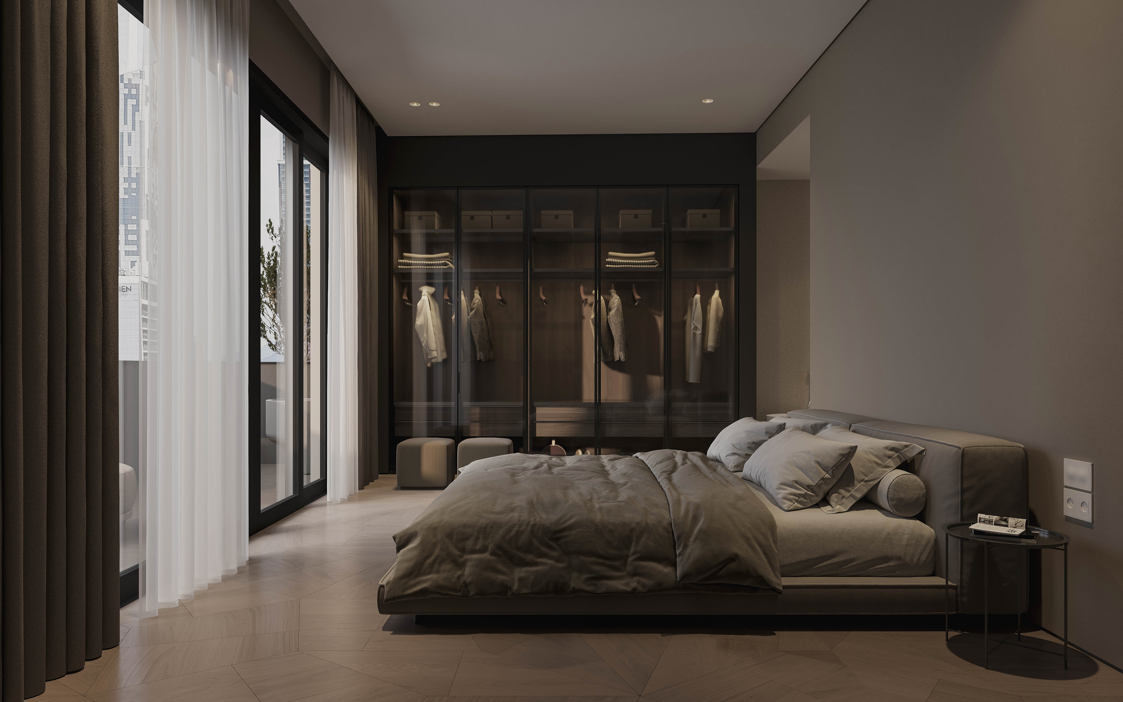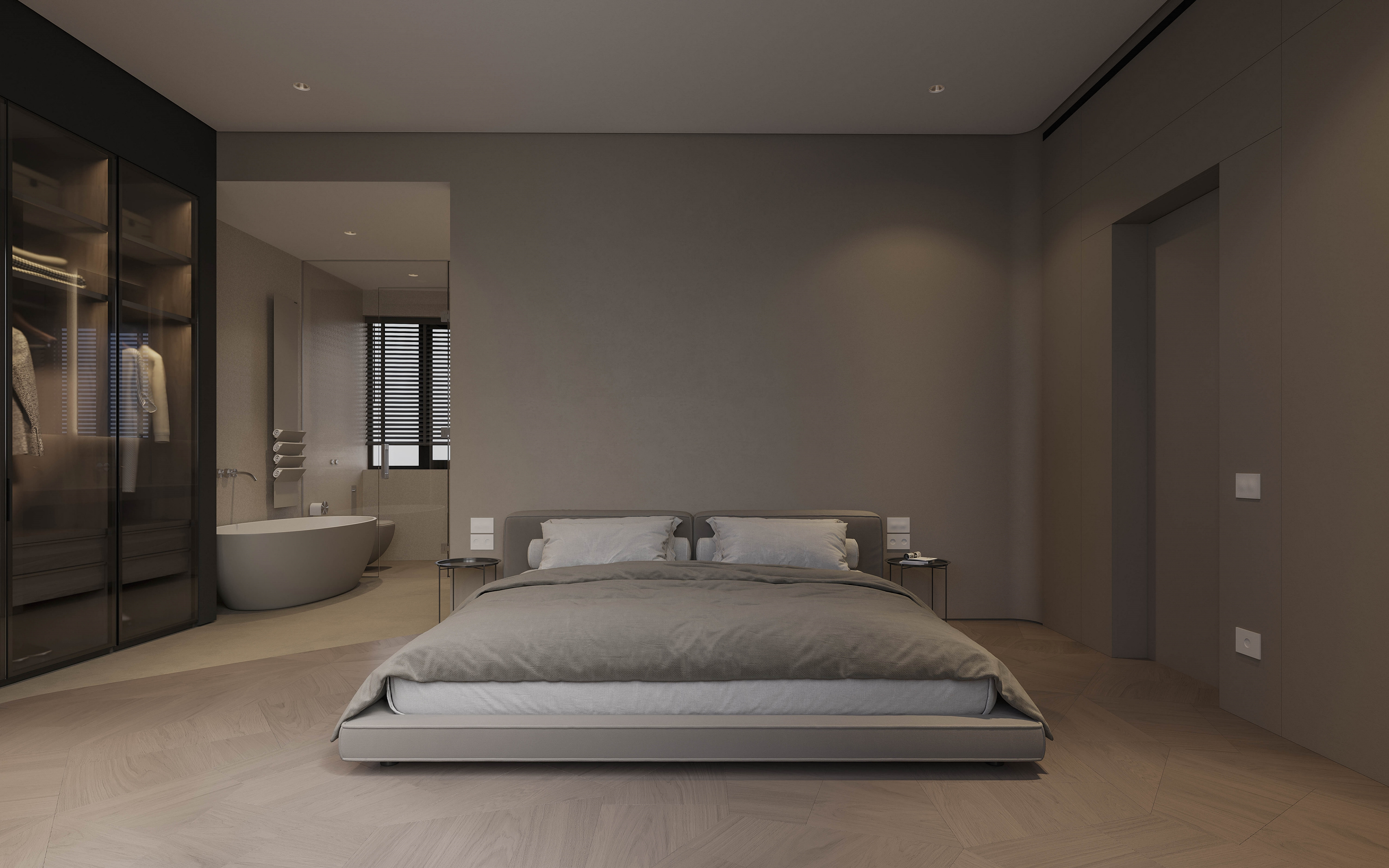 This design fluidity is accentuated as the concrete seamlessly flows from walls to the floor. To offset the starkness of concrete and add warmth, parquet islands are thoughtfully positioned in the dining, lounge, and bedroom zones.