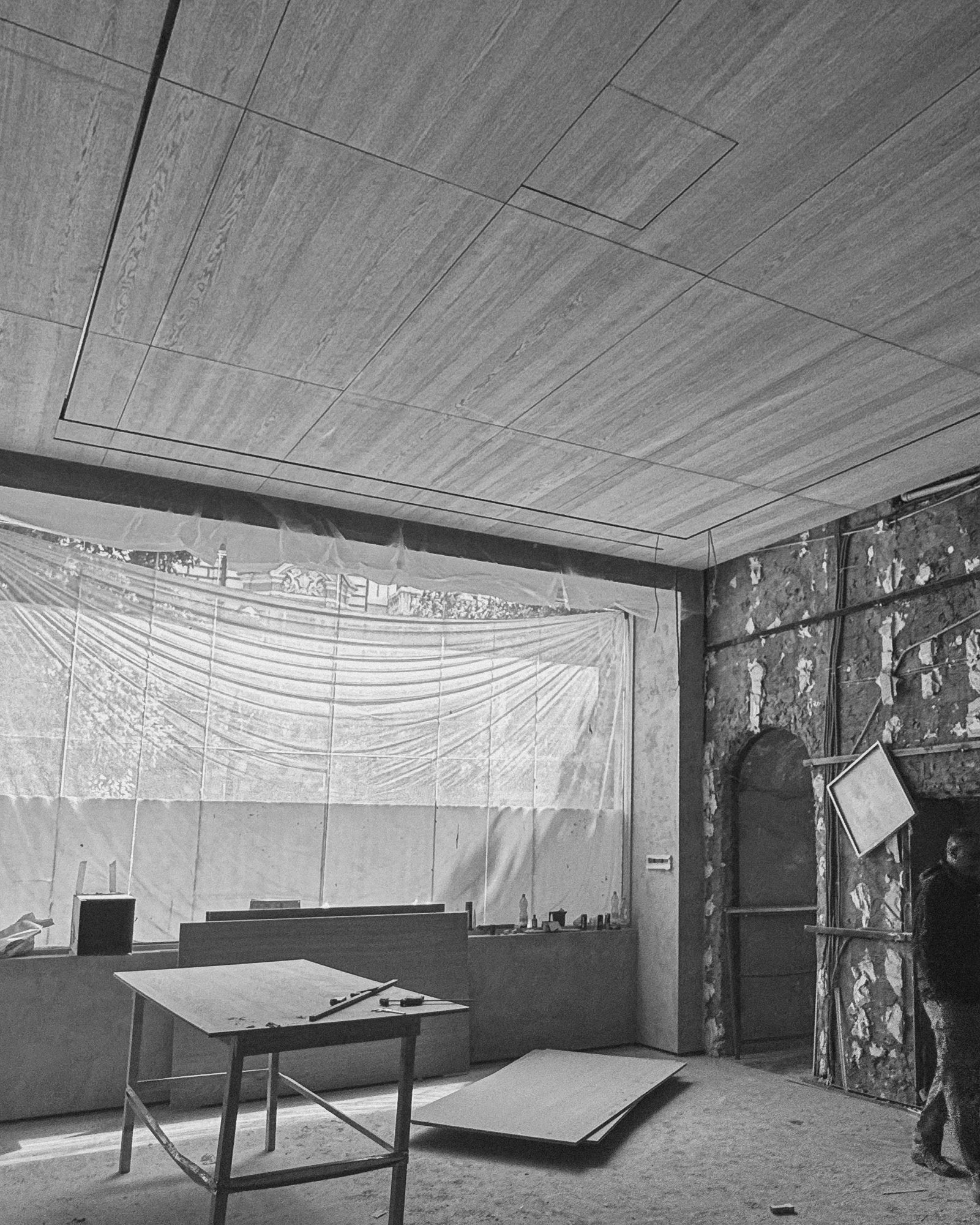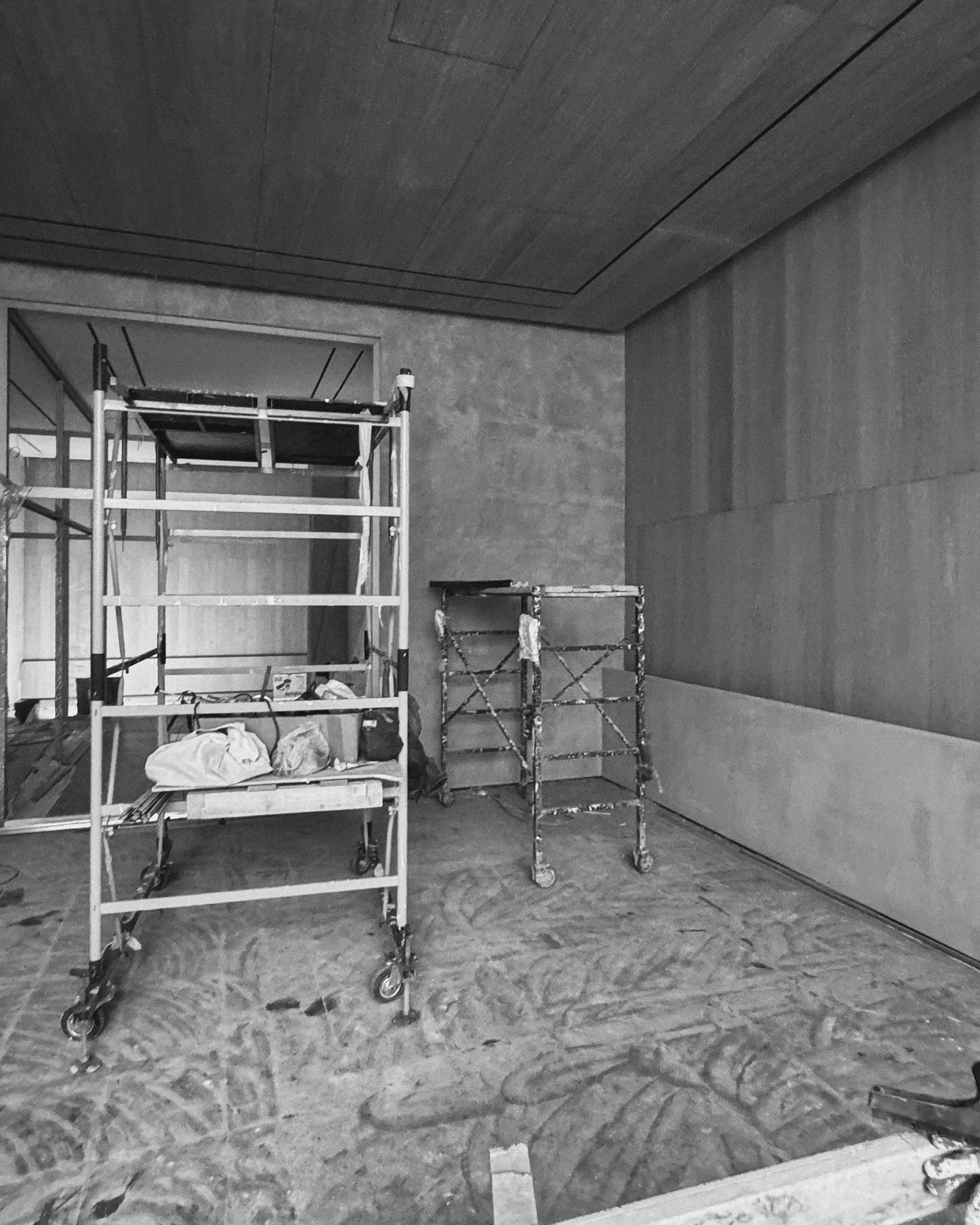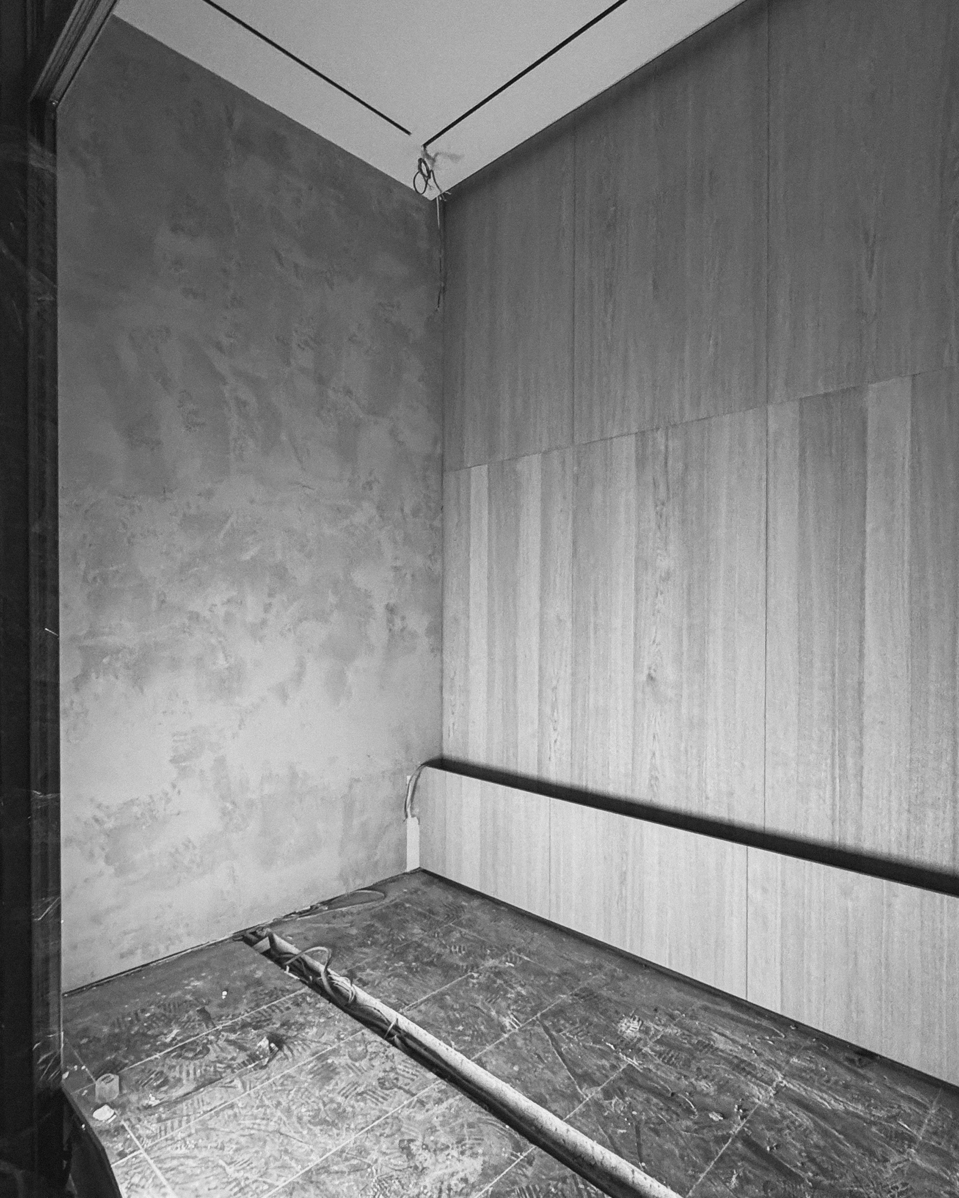 The material palette is kept sharp and focused — oak veneer and light grey ceramic stone tiles define the space. These surfaces wrap walls, ceilings, and built-in furniture, creating a calm, tactile rhythm. Lush plants and warm lighting soften the architecture, bringing a touch of the forest setting where the residences will eventually be built.