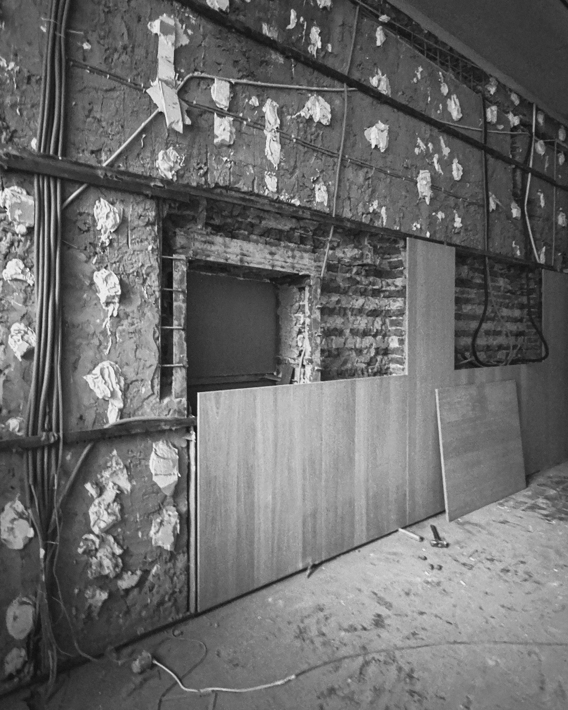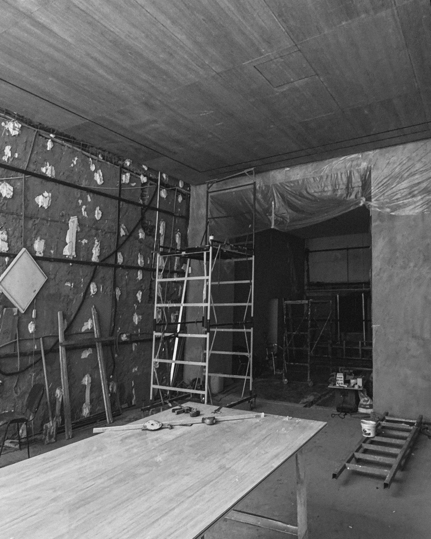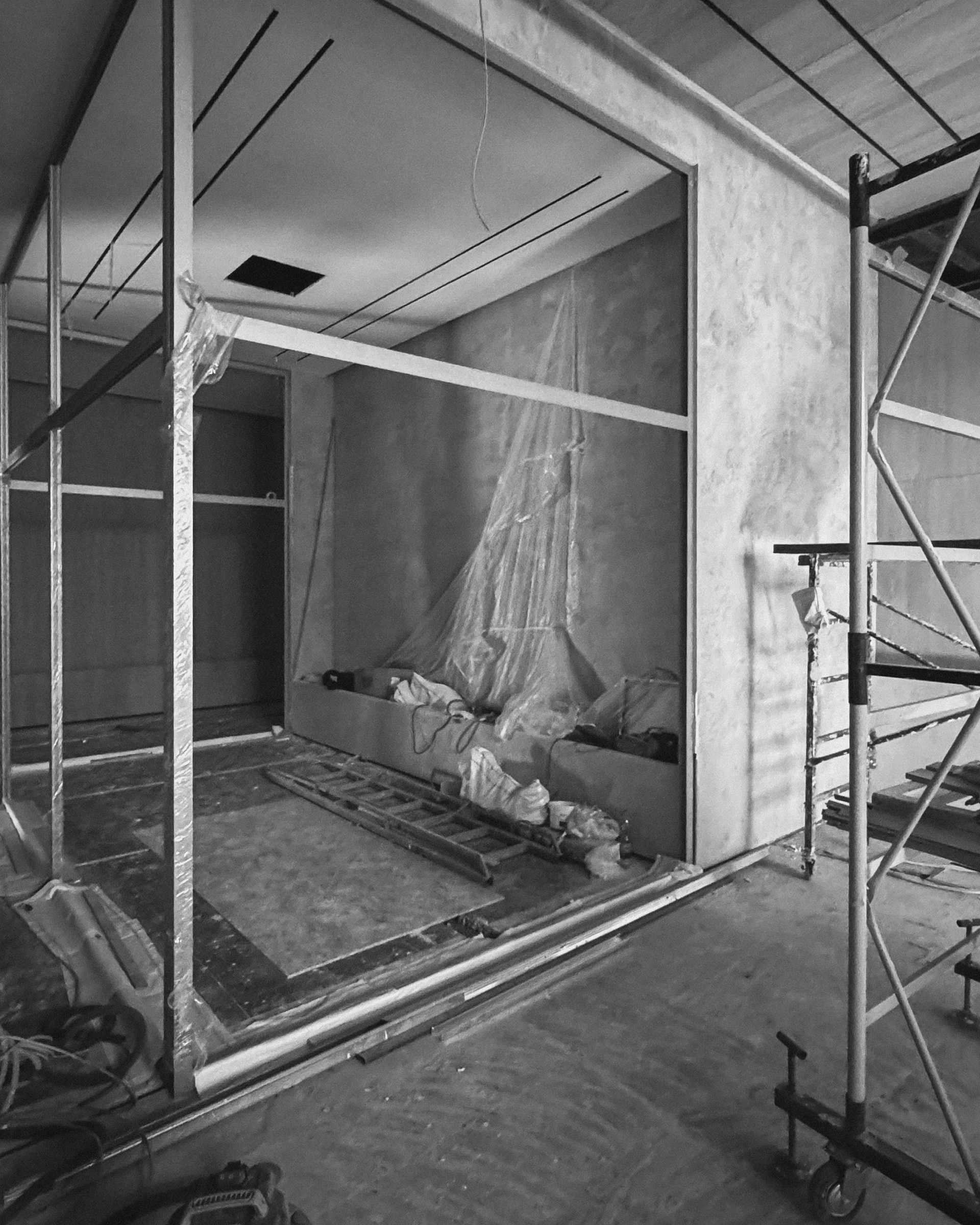 The material palette is kept sharp and focused — oak veneer and light grey ceramic stone tiles define the space. These surfaces wrap walls, ceilings, and built-in furniture, creating a calm, tactile rhythm. Lush plants and warm lighting soften the architecture, bringing a touch of the forest setting where the residences will eventually be built.