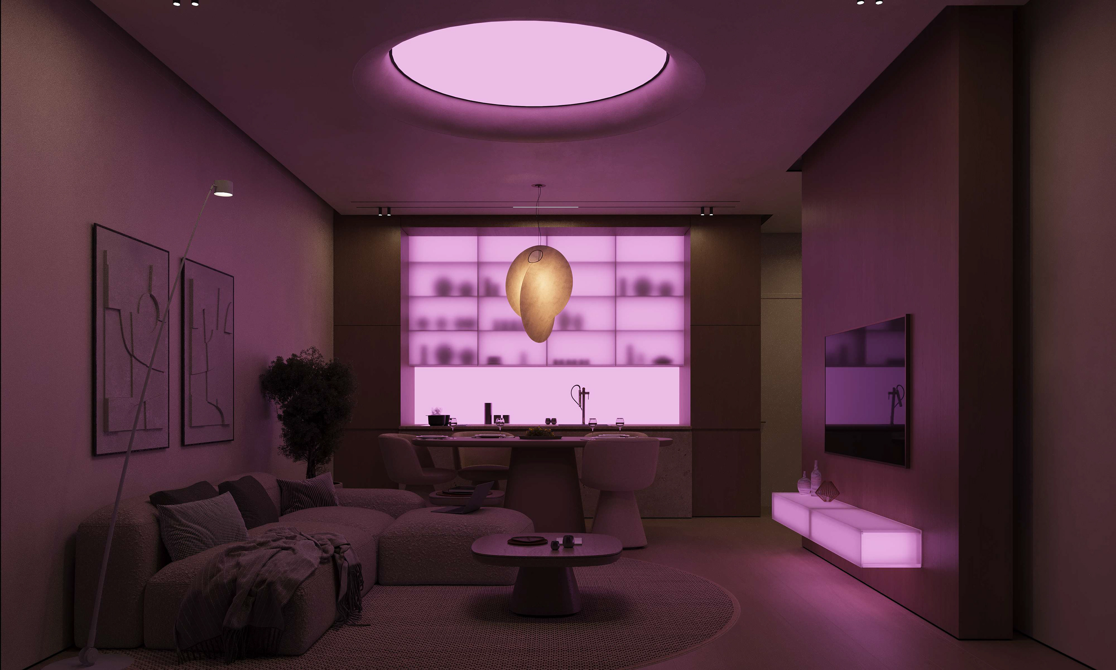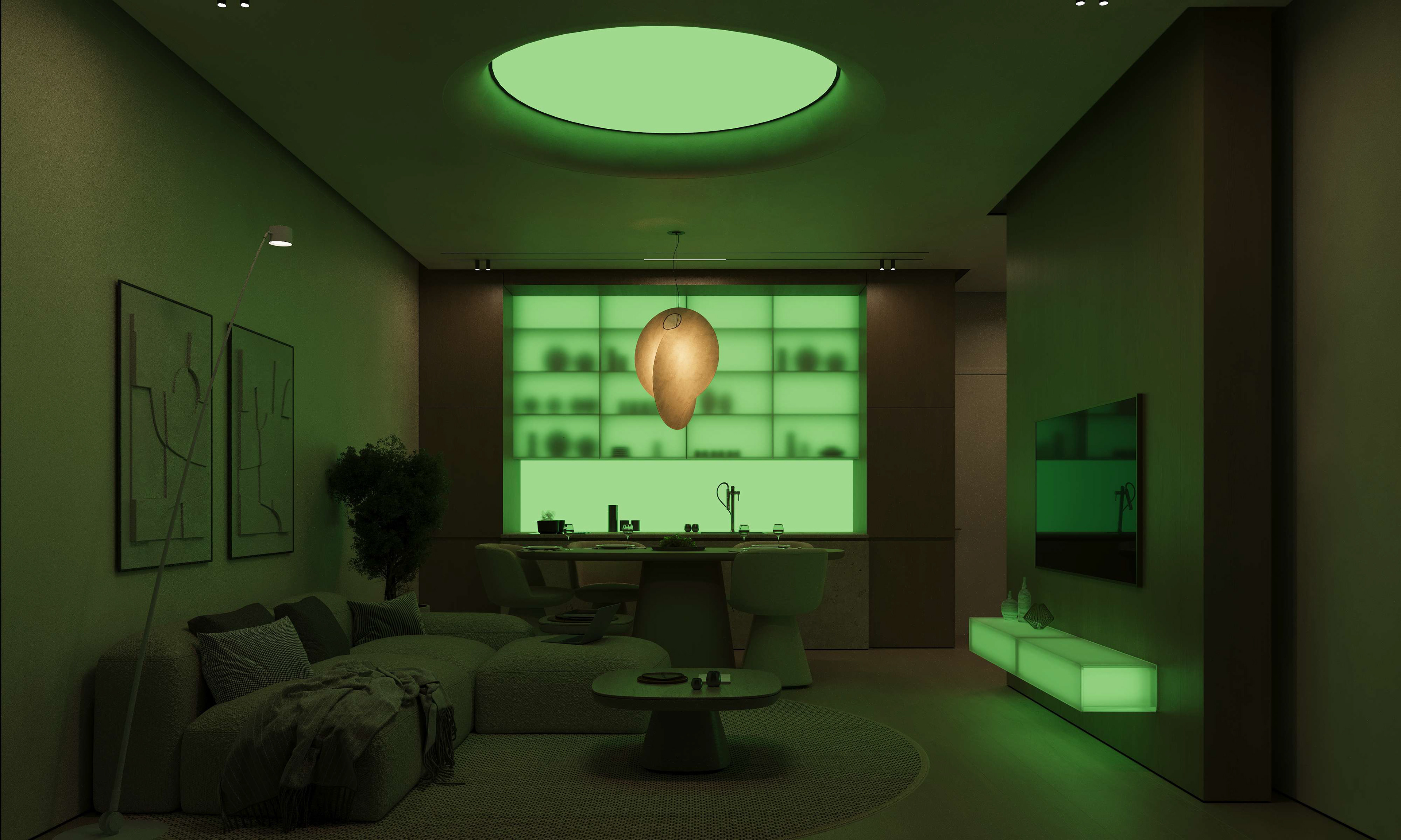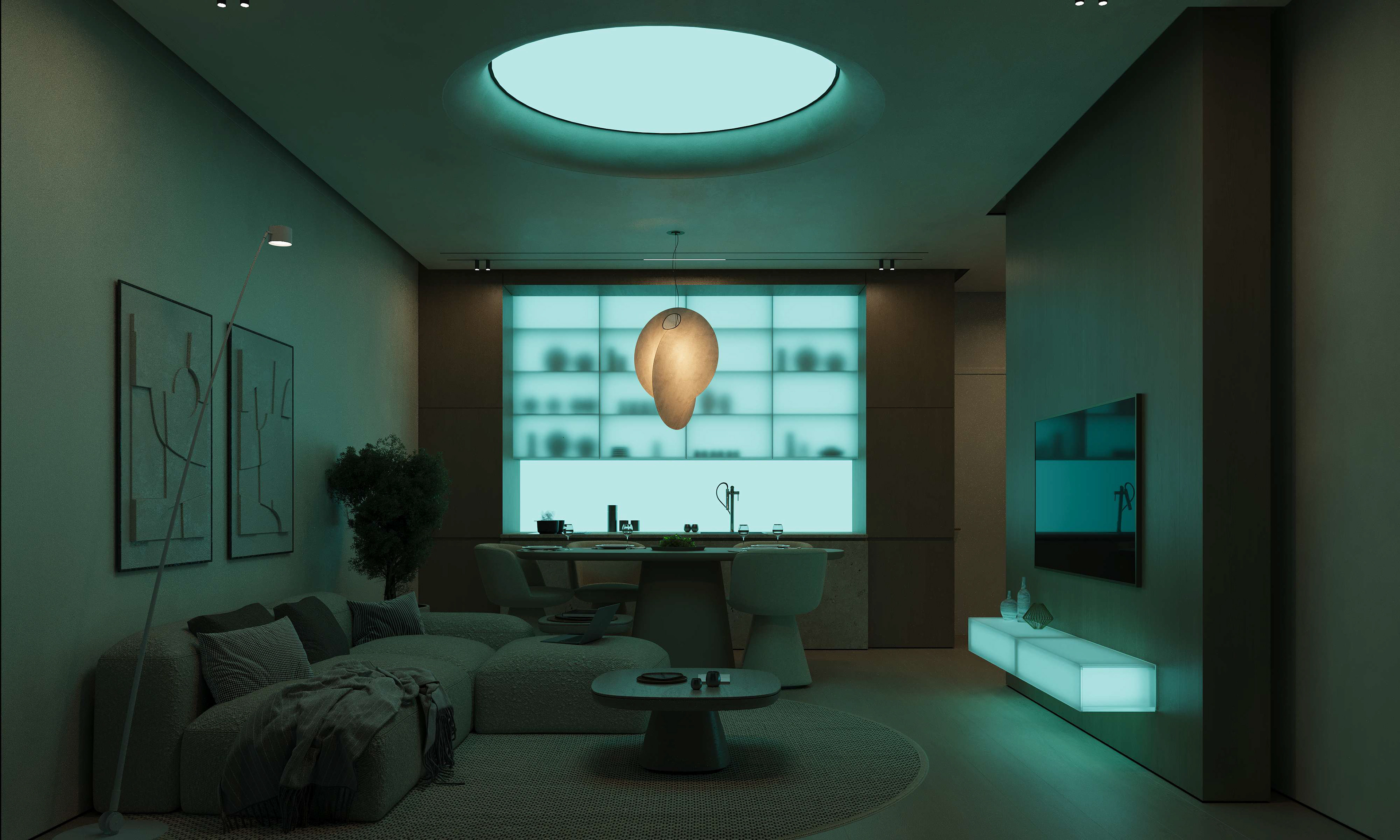 The core idea of LUMMO is that individuality is created through atmosphere rather than through layout changes. Integrated LED lighting allows each apartment to change color and mood, giving every unit a different character while the architectural interior remains the same. Additional variation is introduced through interchangeable textile colors on sofas and dining chairs, allowing personalization without changing the furniture system.