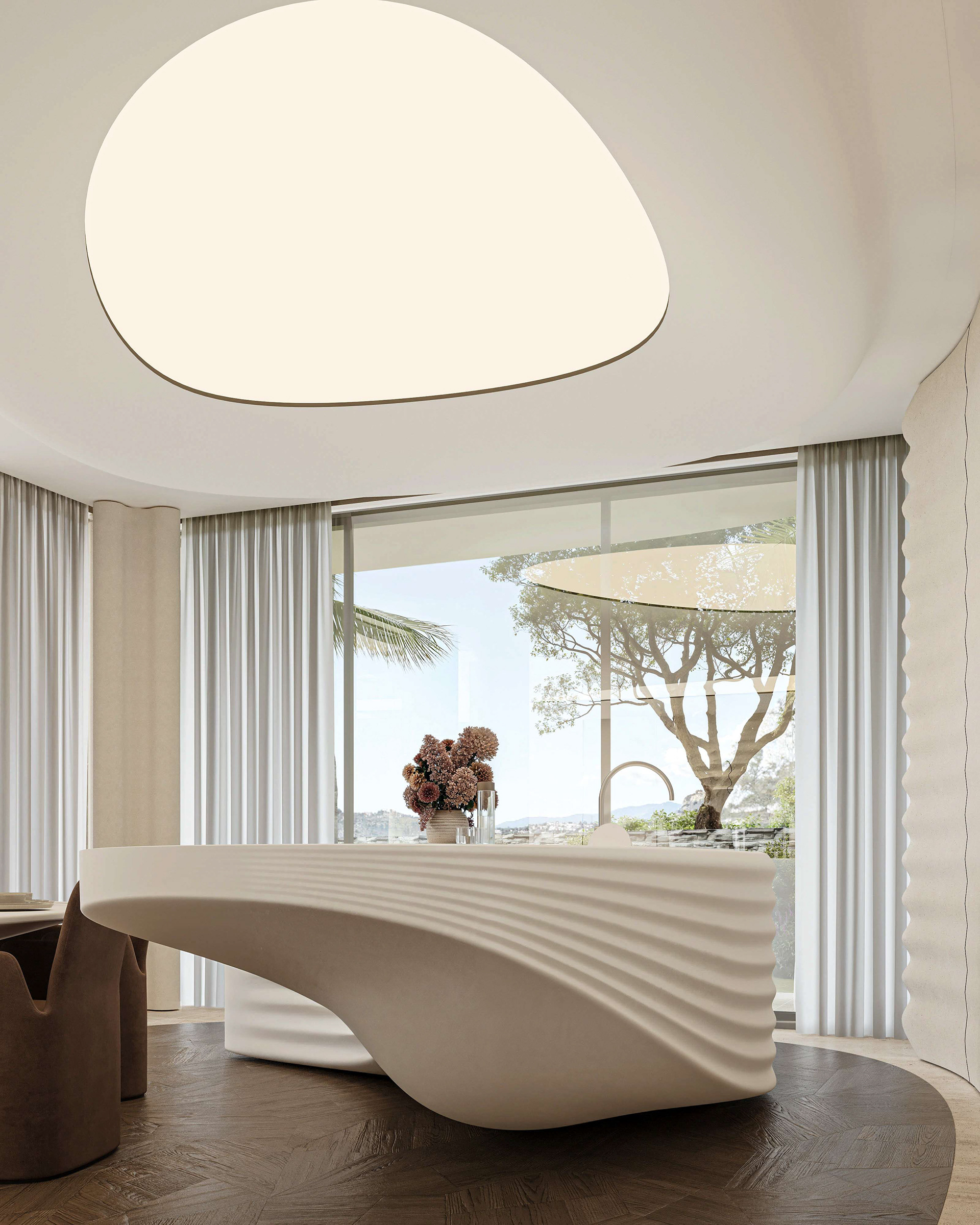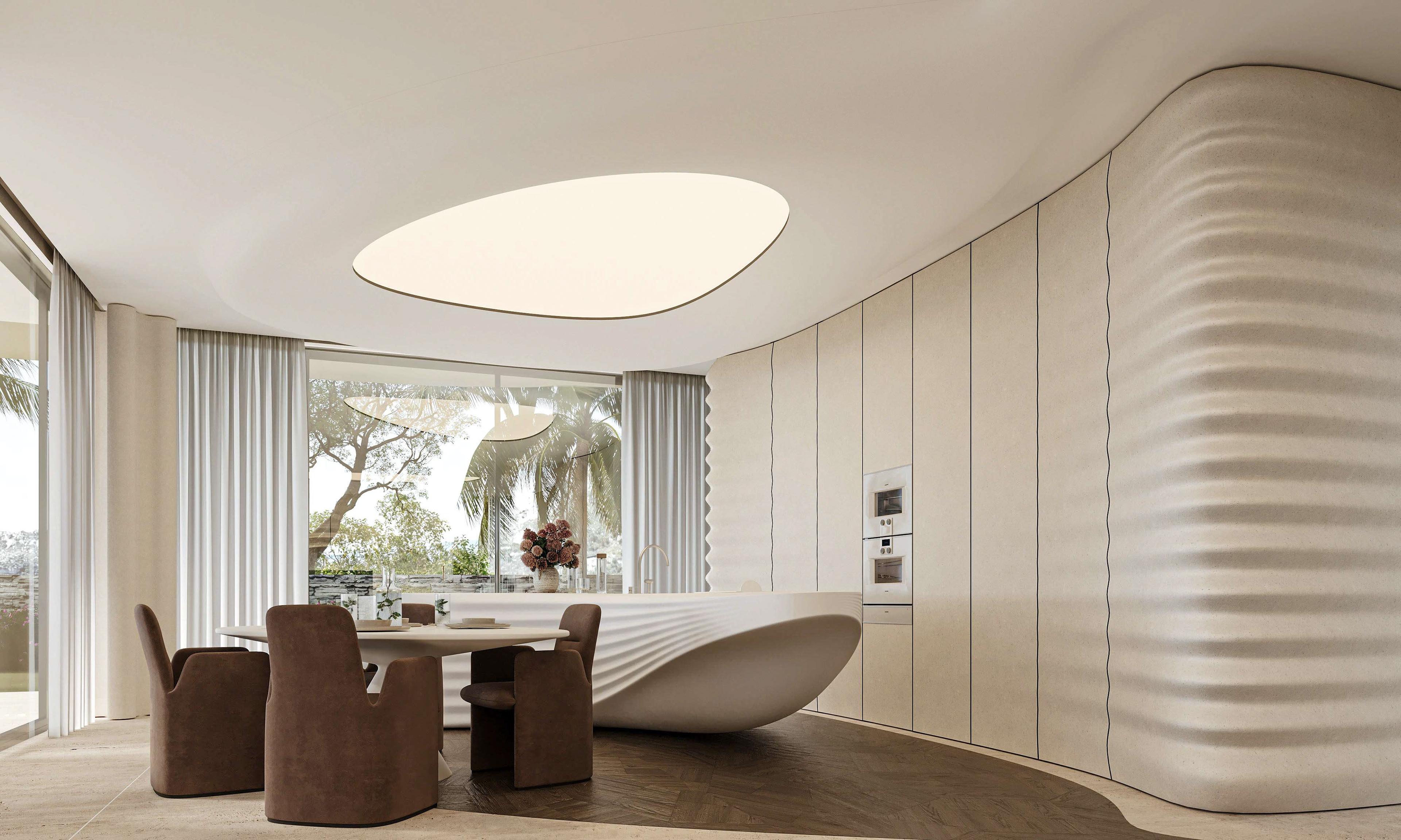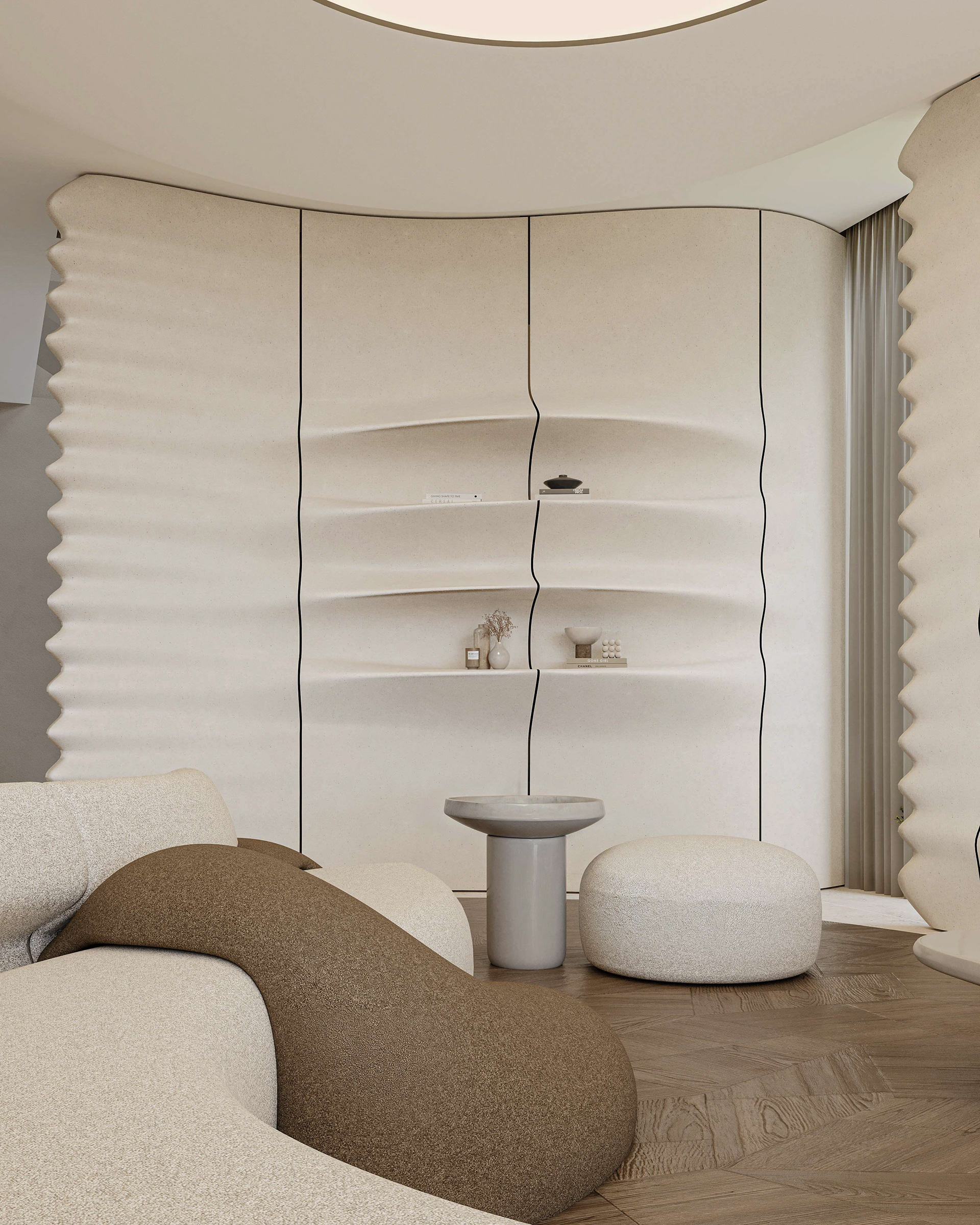 The interior continues this dialogue of movement and calm. Beige fiber concrete walls feature flowing parametric lines, echoing the fluid geometry of the exterior. A restrained palette of white, sand, and pale wood maintains visual silence, allowing natural light to move freely through the space. Every element, from the custom kitchen island to the ceiling curves, follows a continuous rhythm that connects the rooms like a tide.