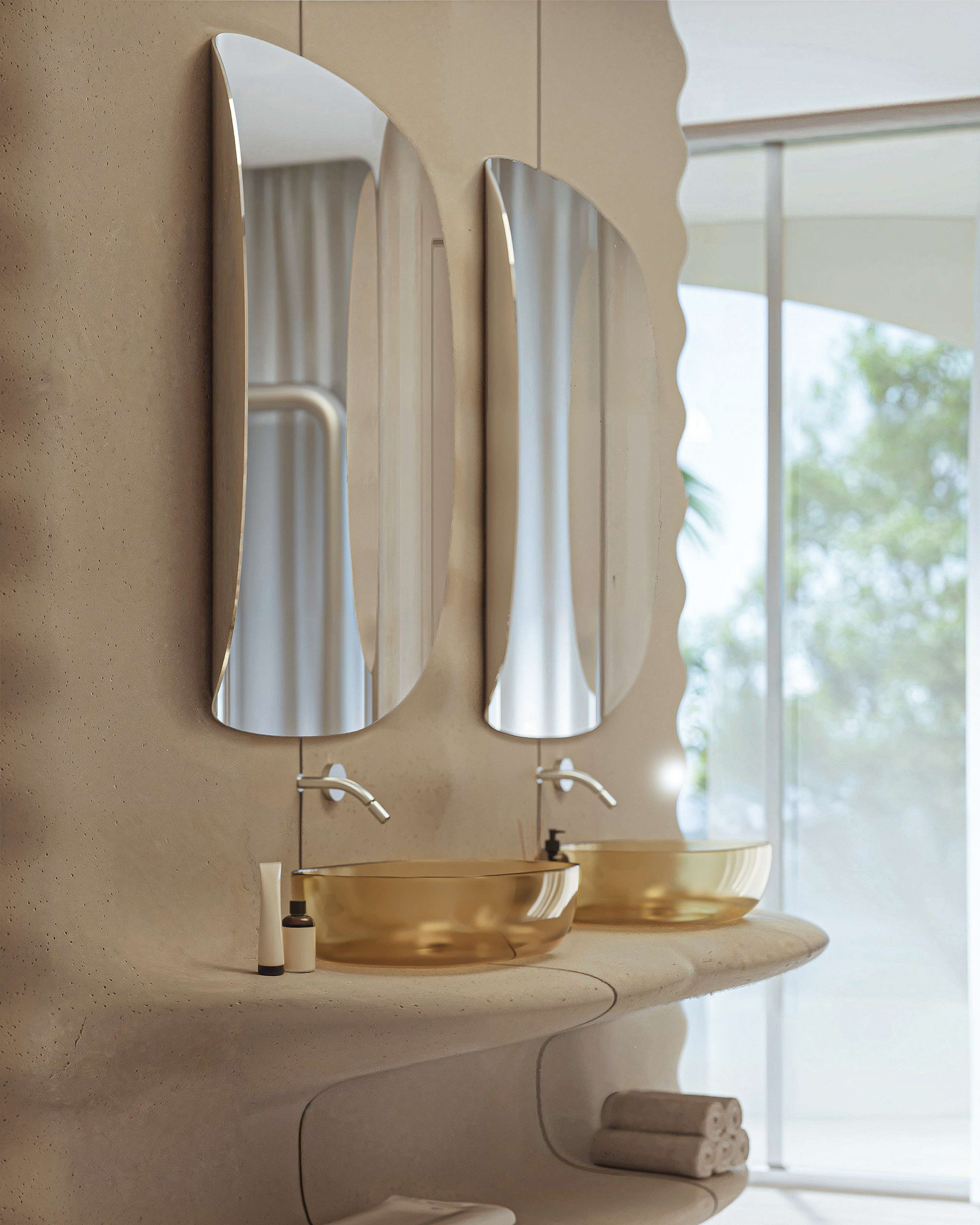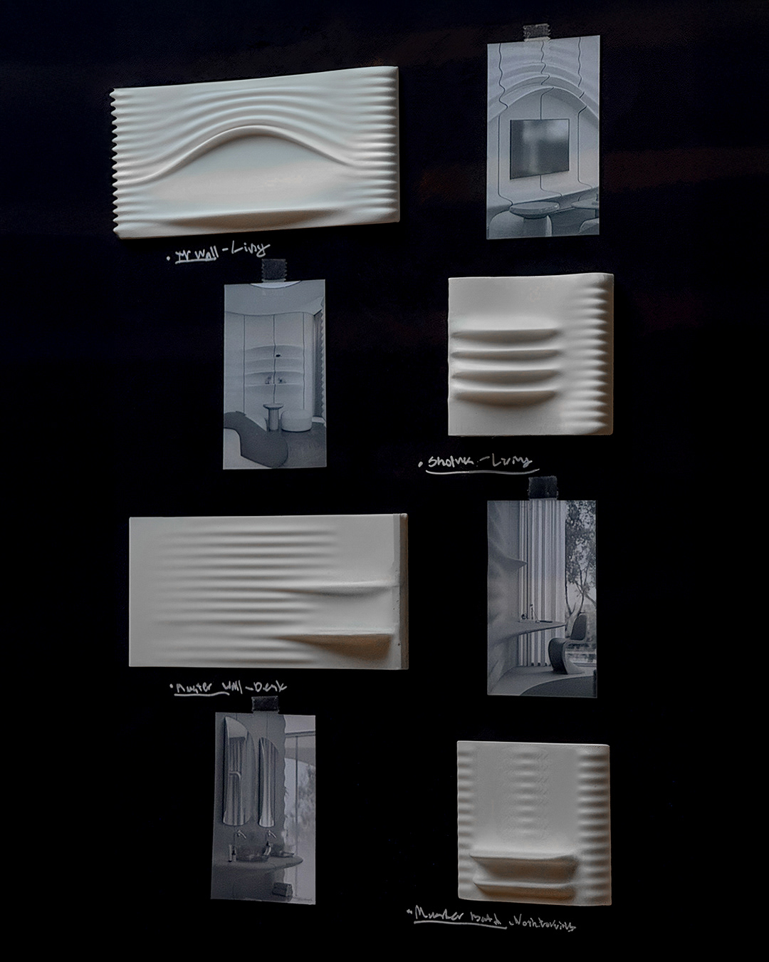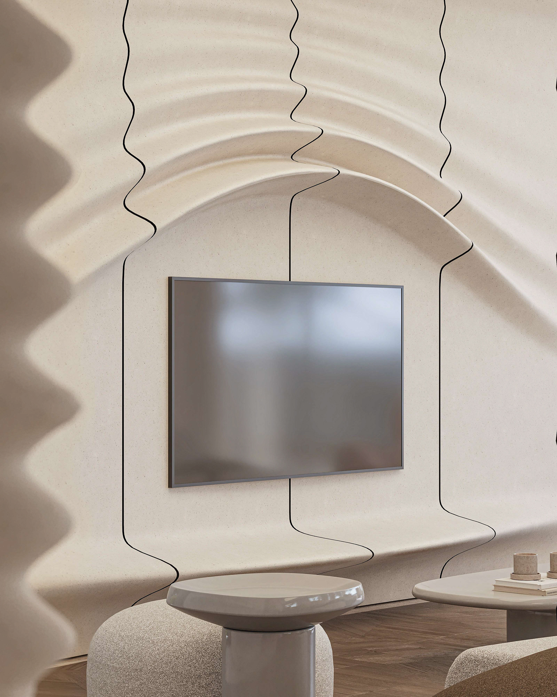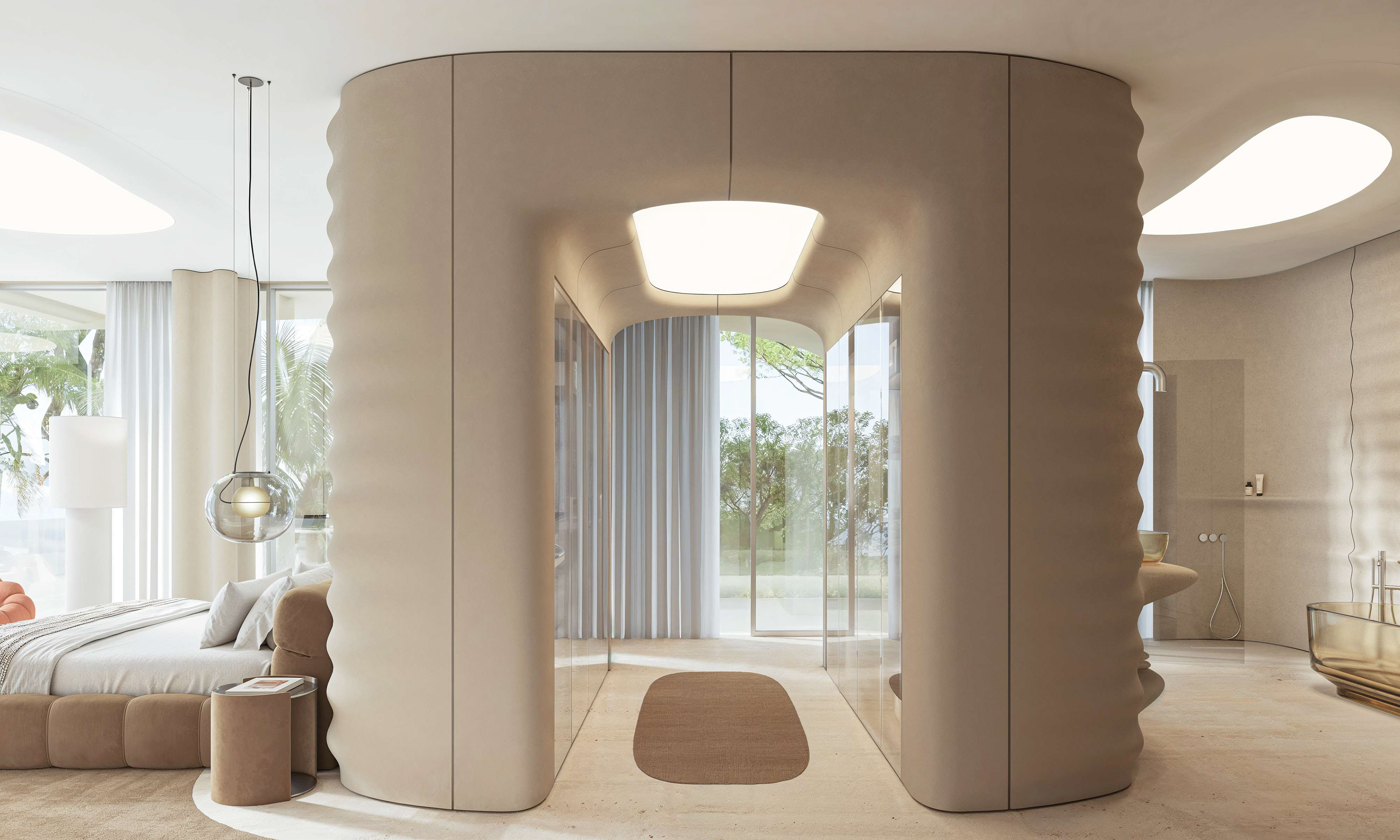 The interior continues this dialogue of movement and calm. Beige fiber concrete walls feature flowing parametric lines, echoing the fluid geometry of the exterior. A restrained palette of white, sand, and pale wood maintains visual silence, allowing natural light to move freely through the space. Every element, from the custom kitchen island to the ceiling curves, follows a continuous rhythm that connects the rooms like a tide.