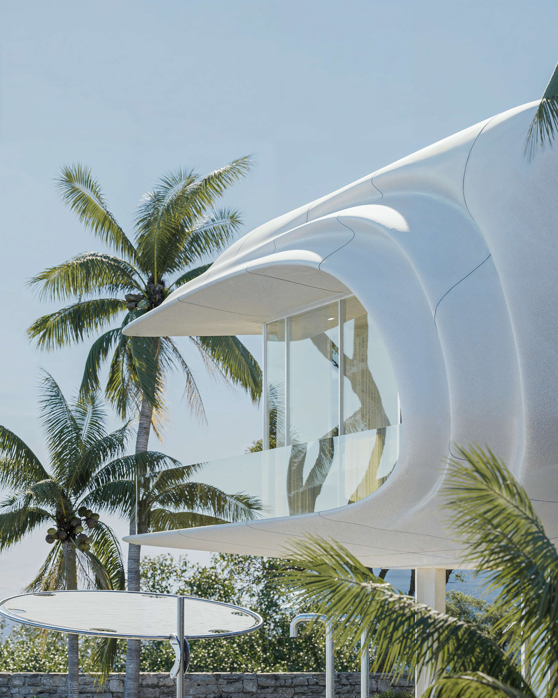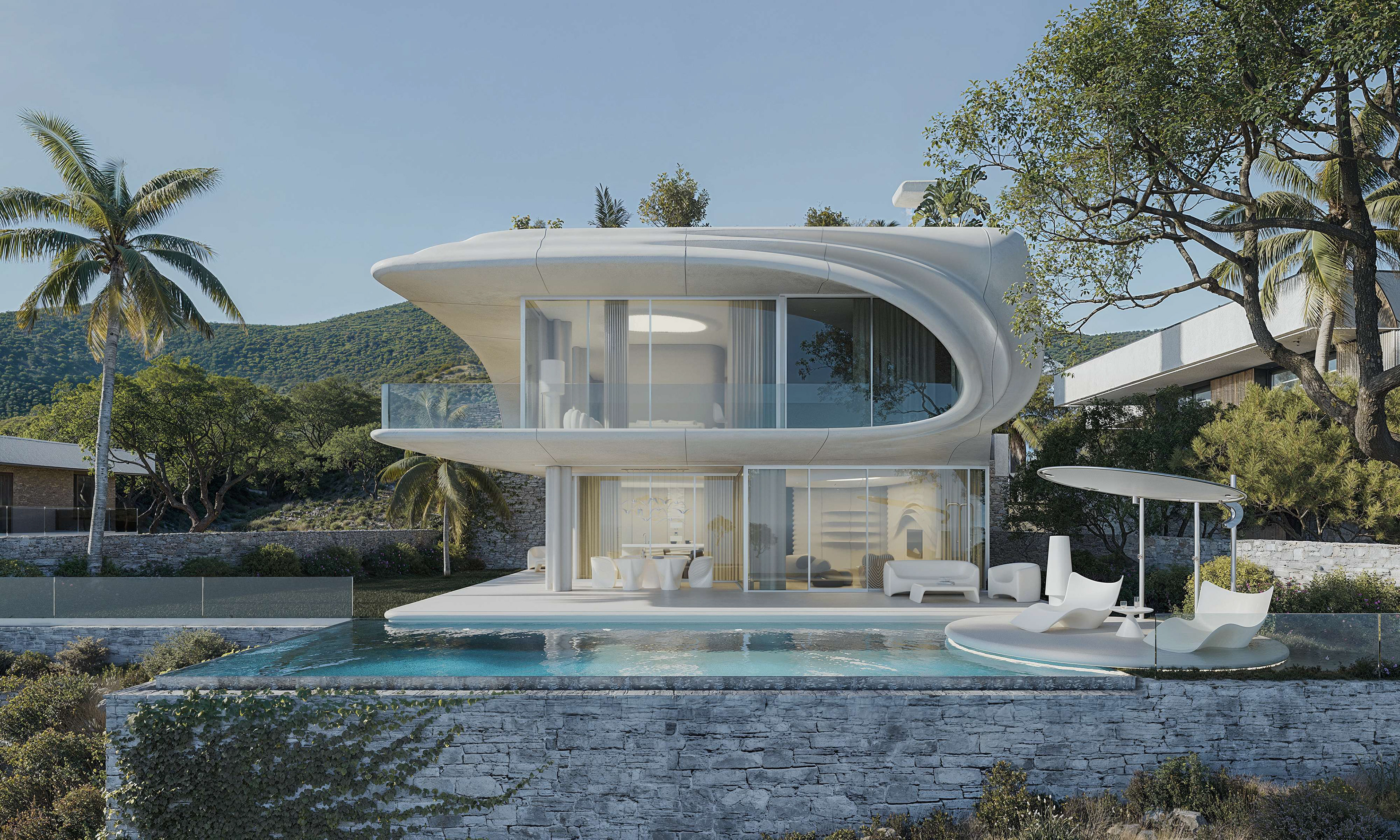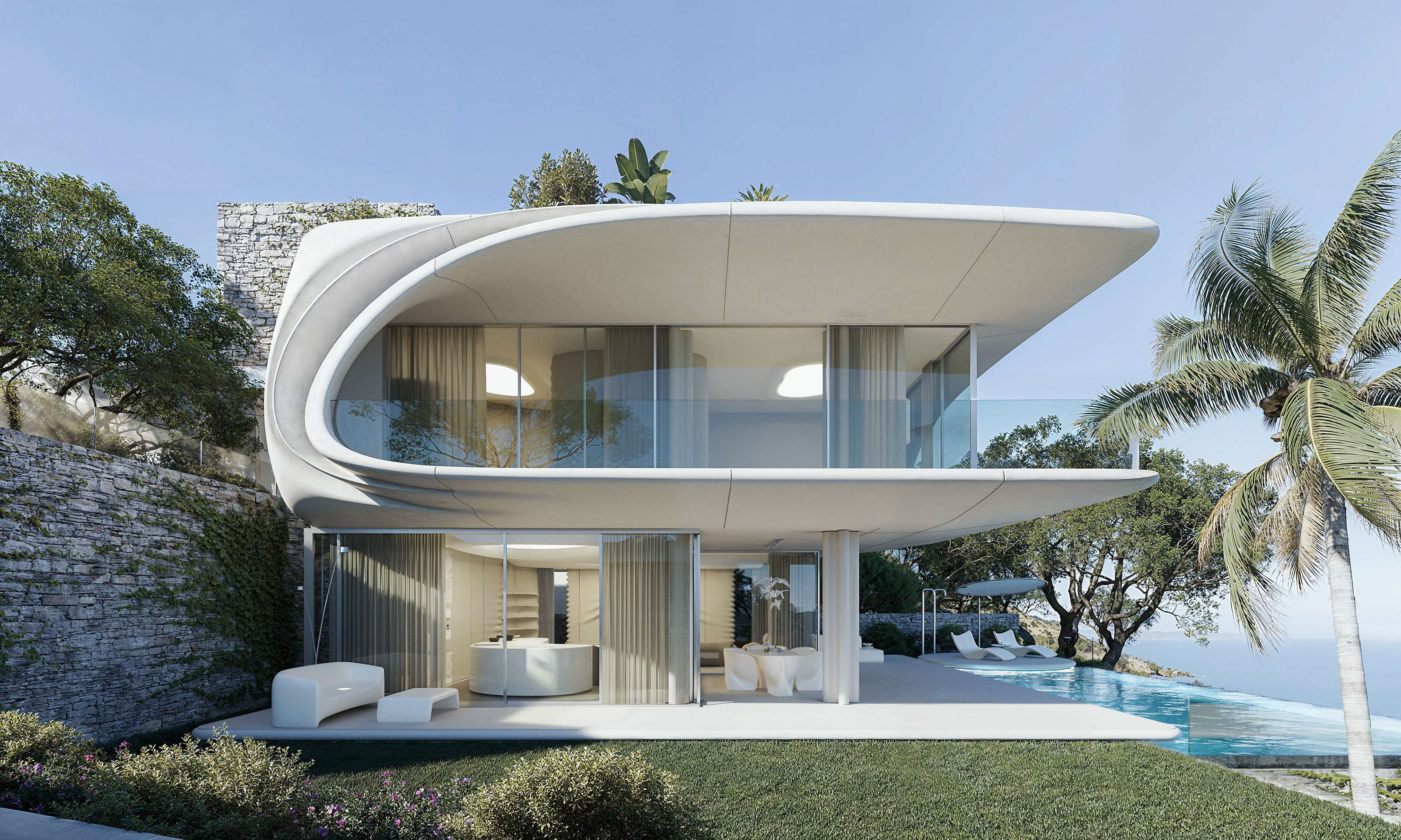 The exterior captures a single frozen moment of a breaking wave. Formed from fiber concrete, it carries the softness of motion in a solid surface. Seen from below, the building appears as a suspended ripple, a fragment of the sea shaped into architecture. Natural stone grounds this gesture, anchoring the form to the terrain while the white tone keeps it light and coastal.