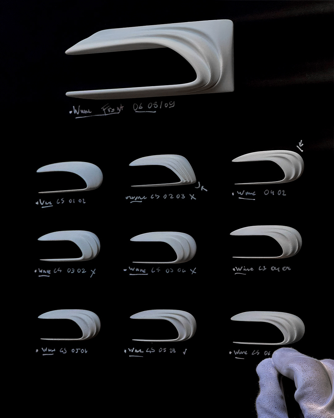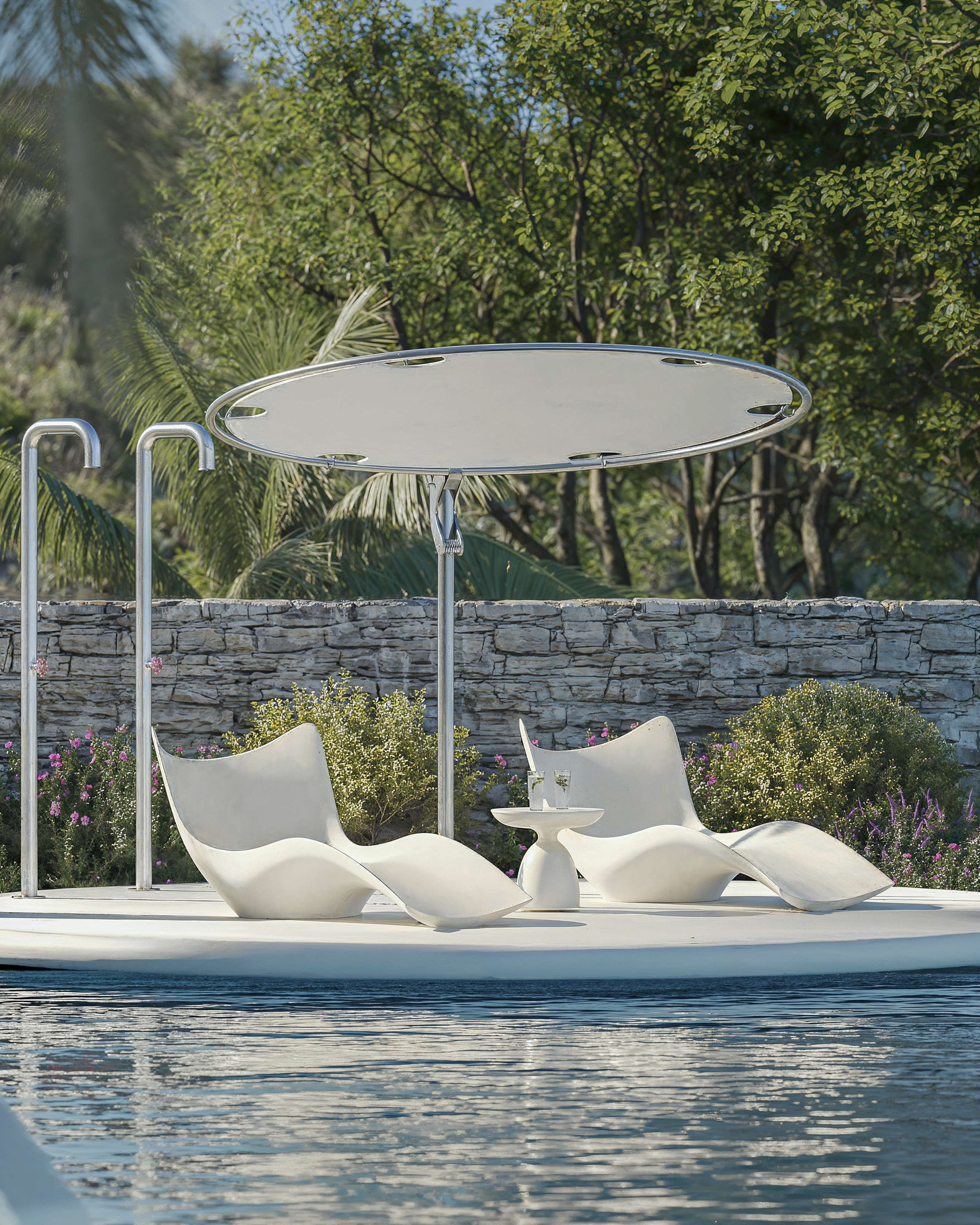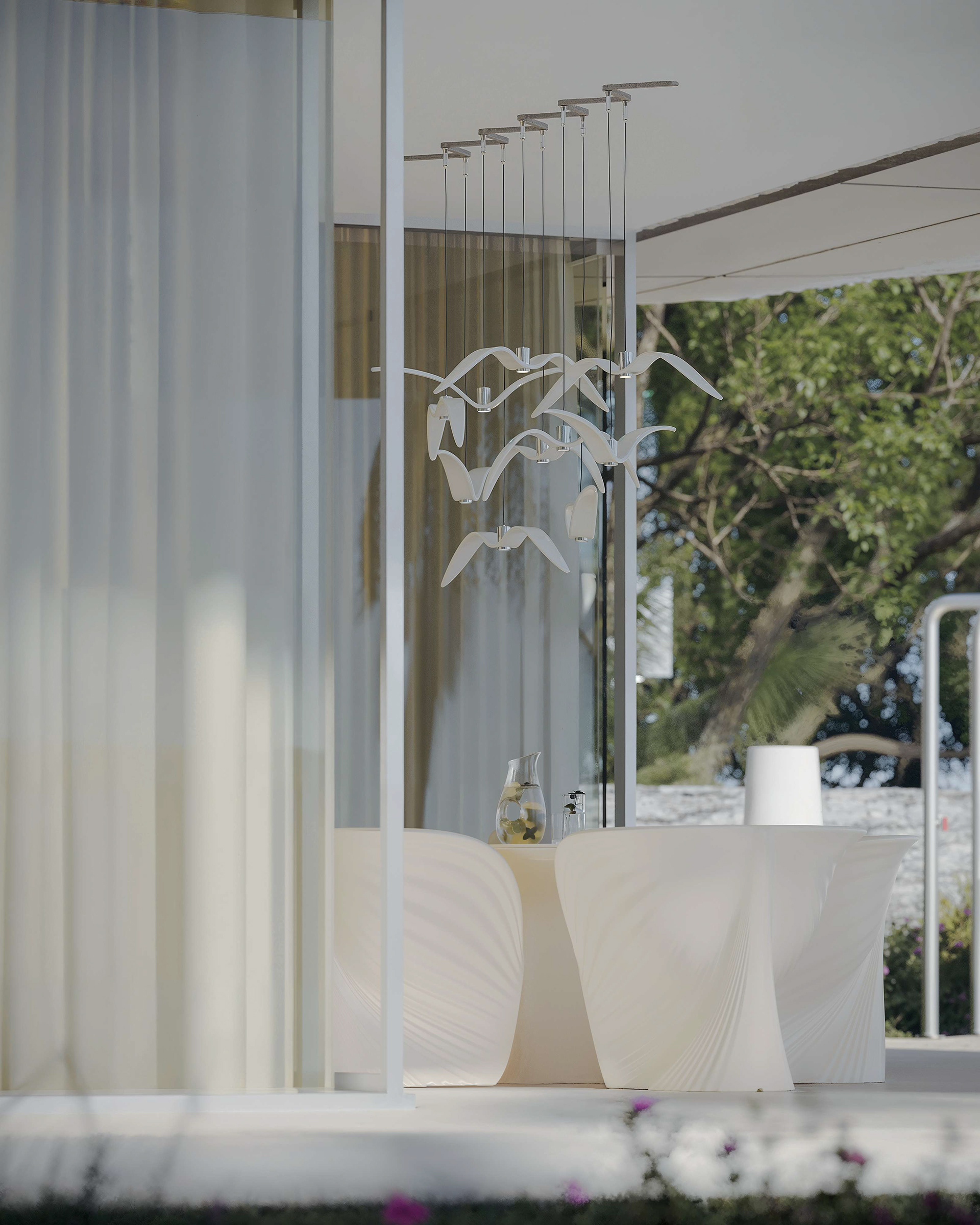 The exterior captures a single frozen moment of a breaking wave. Formed from fiber concrete, it carries the softness of motion in a solid surface. Seen from below, the building appears as a suspended ripple, a fragment of the sea shaped into architecture. Natural stone grounds this gesture, anchoring the form to the terrain while the white tone keeps it light and coastal.
