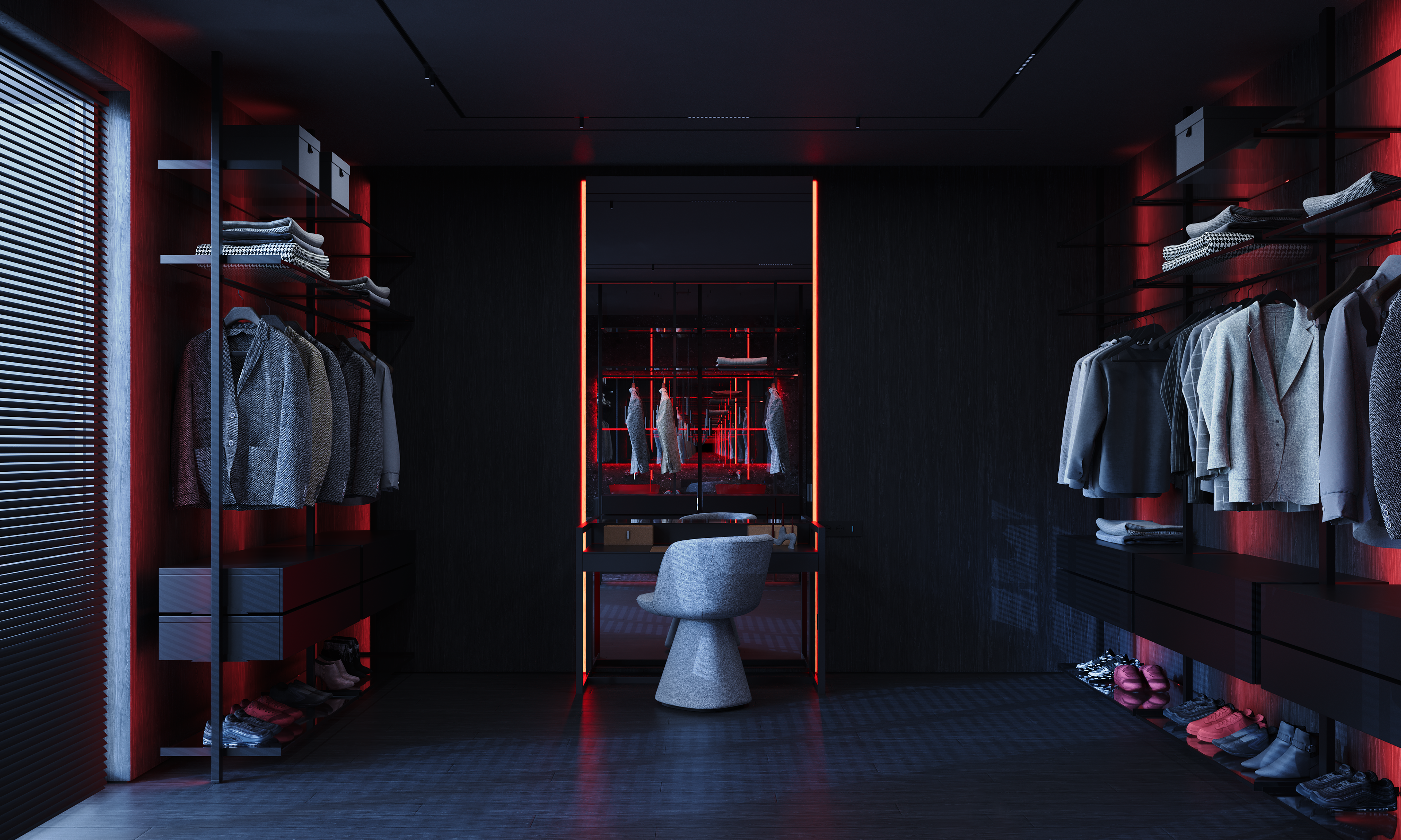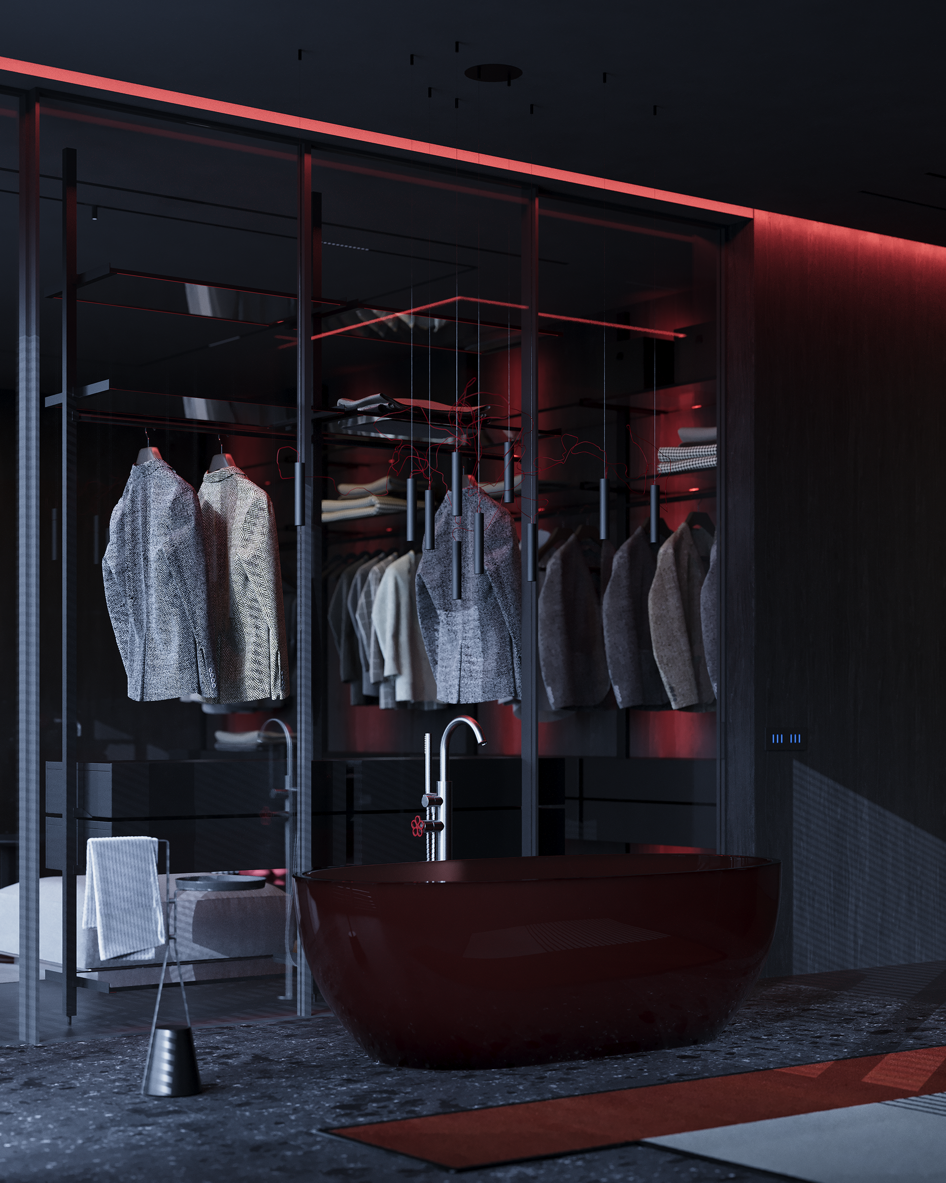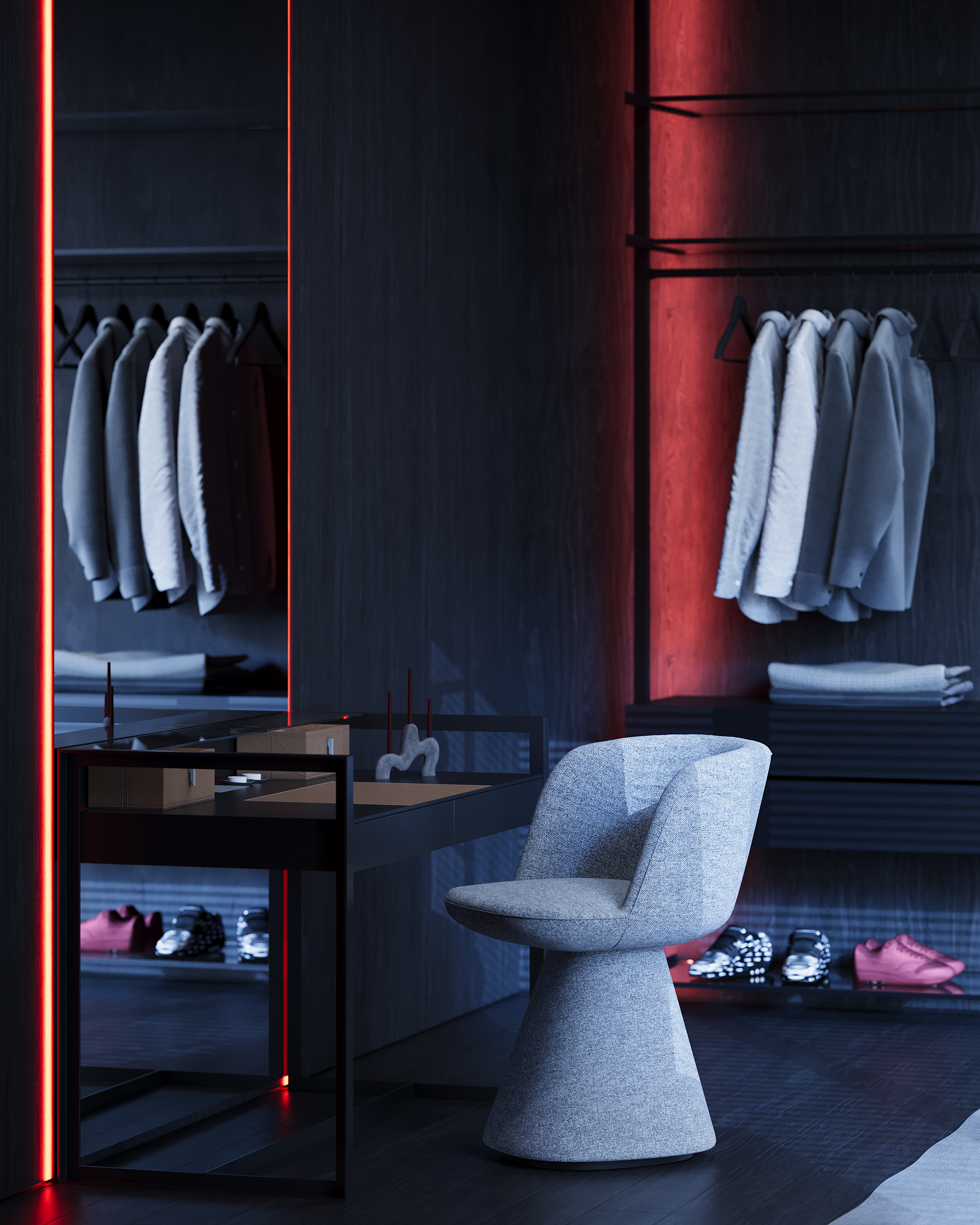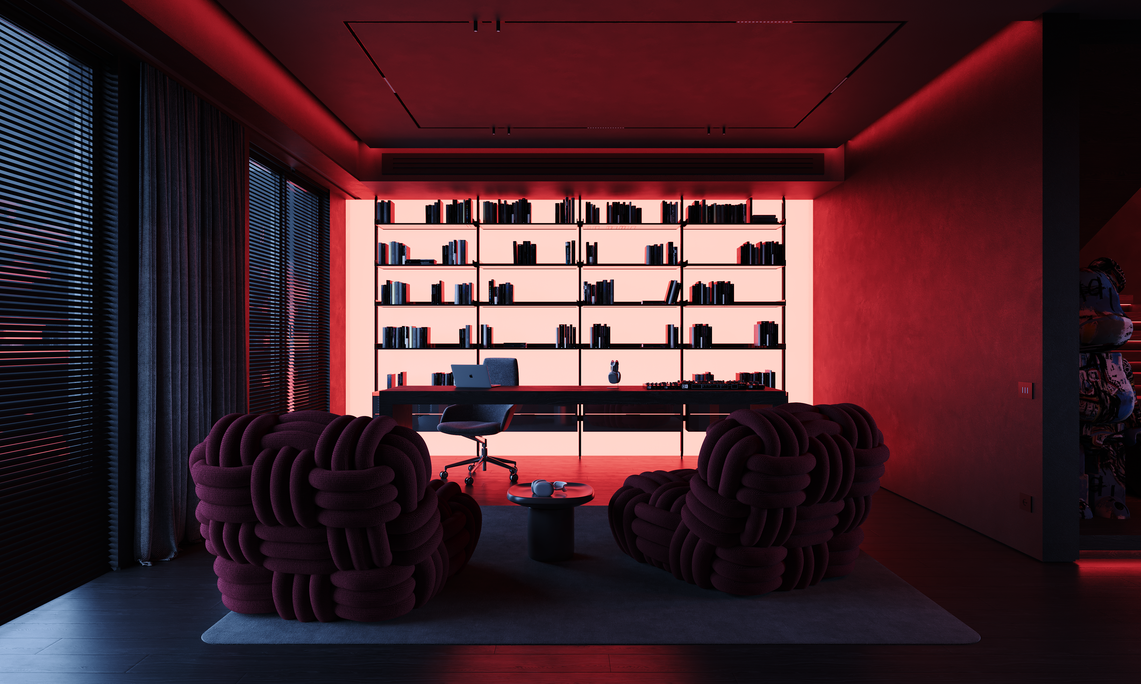 Lighting is the central tool. The project was developed to work in three states: natural daylight, a calm evening mode with ambient light, and a more expressive night setting where red tones shift the mood. Music is part of the lifestyle, not the concept, but it influenced the atmosphere and the way the home performs after sunset. Acoustic isolation is also integrated during construction, allowing the interior to support this use without disturbing the surrounding context.