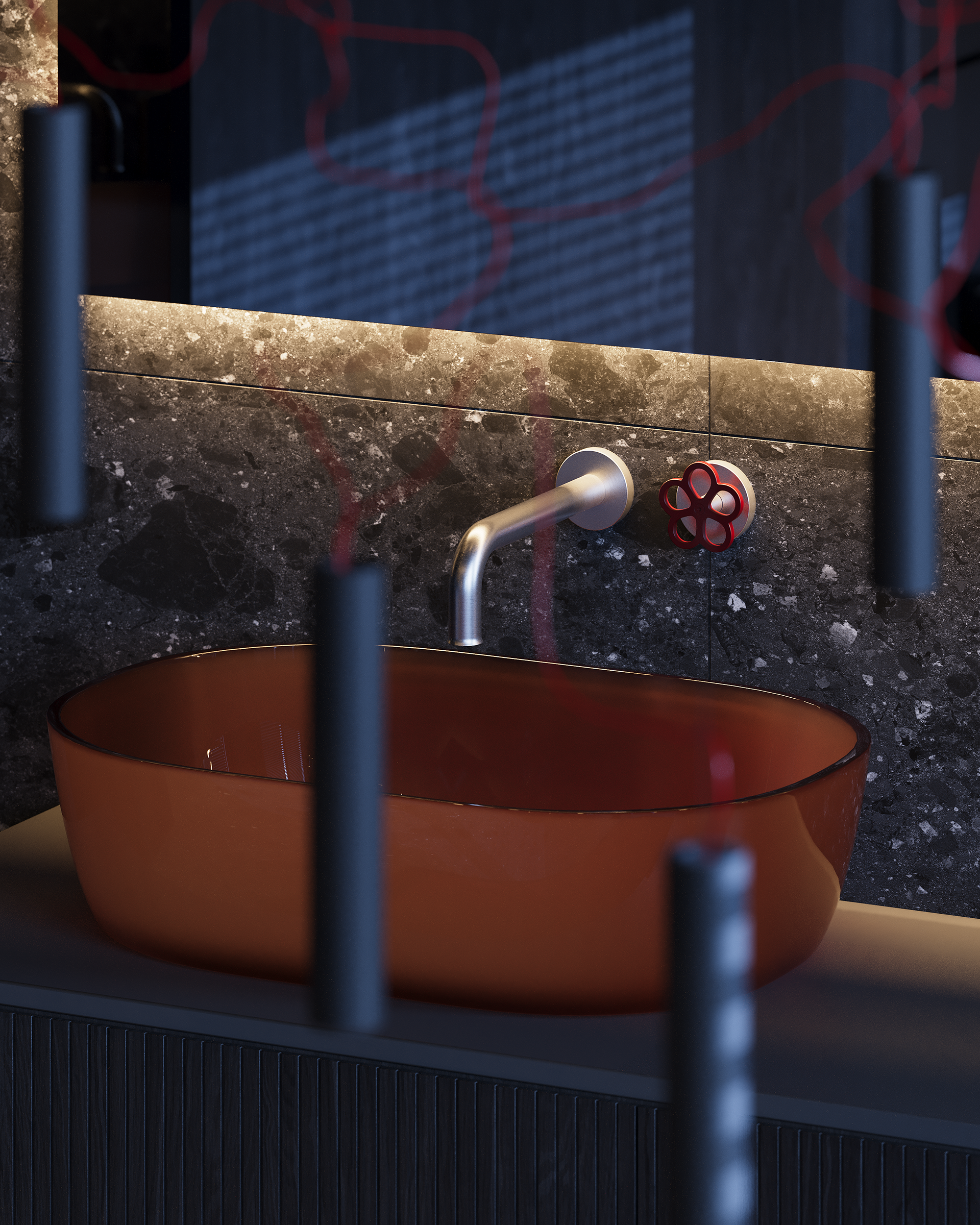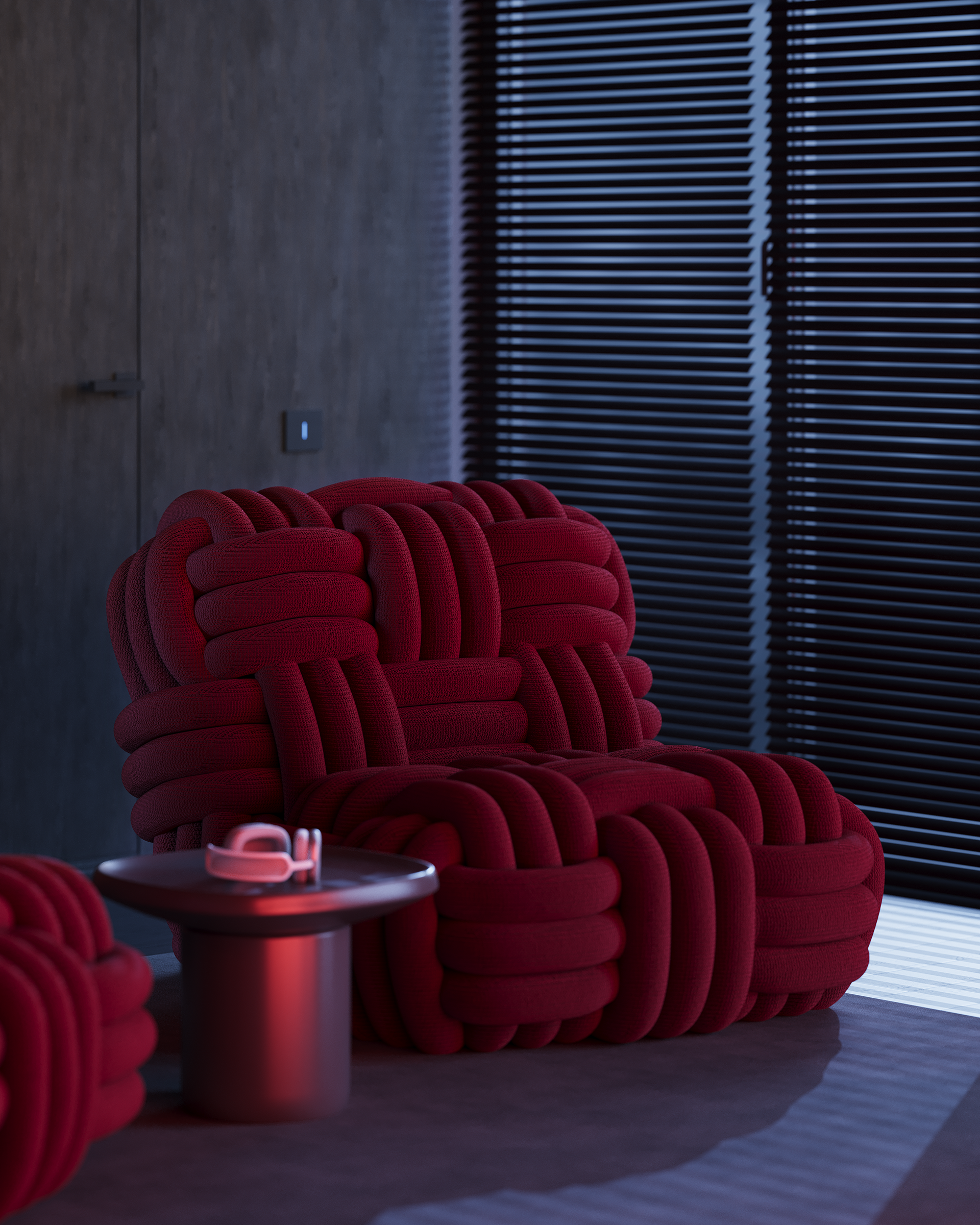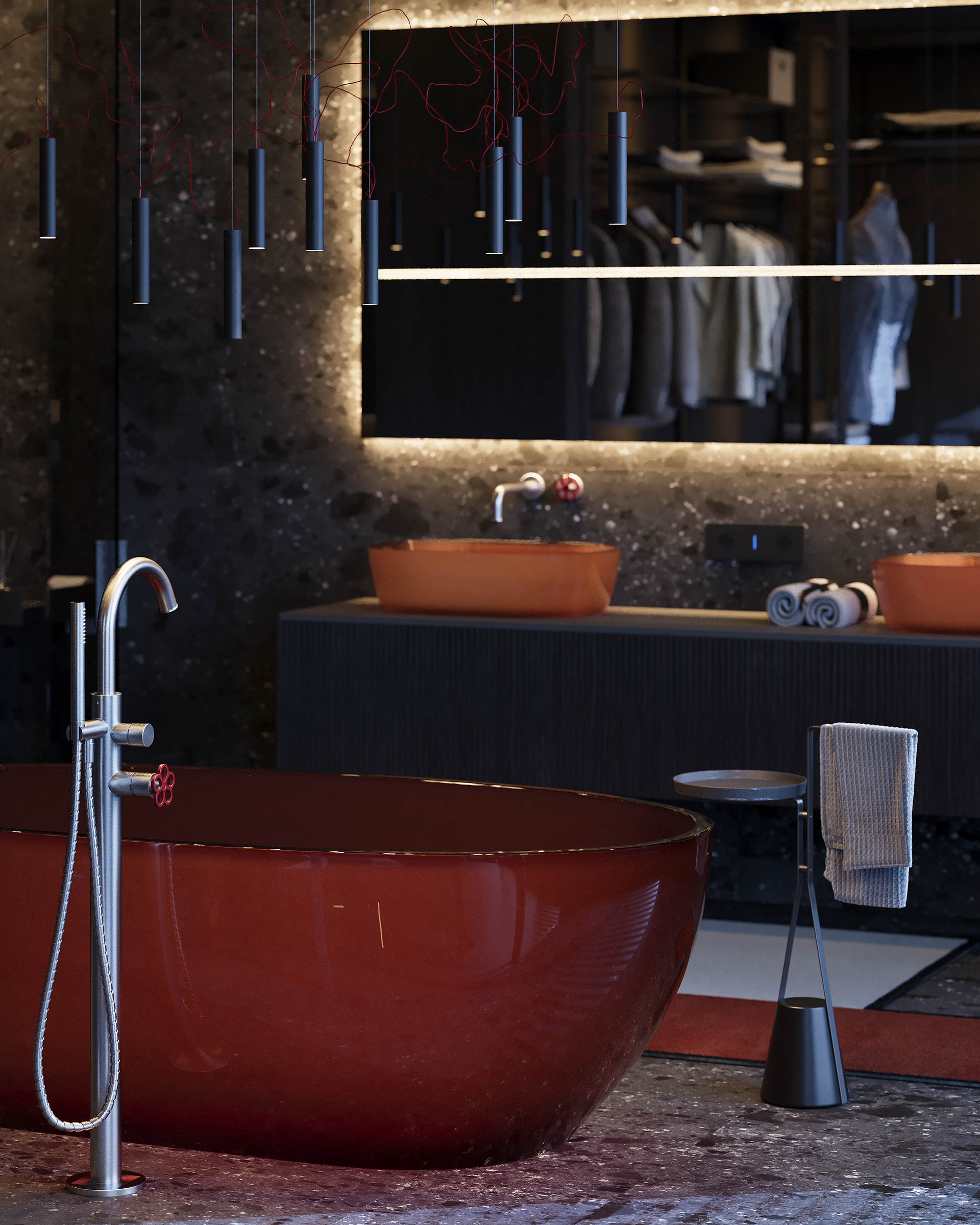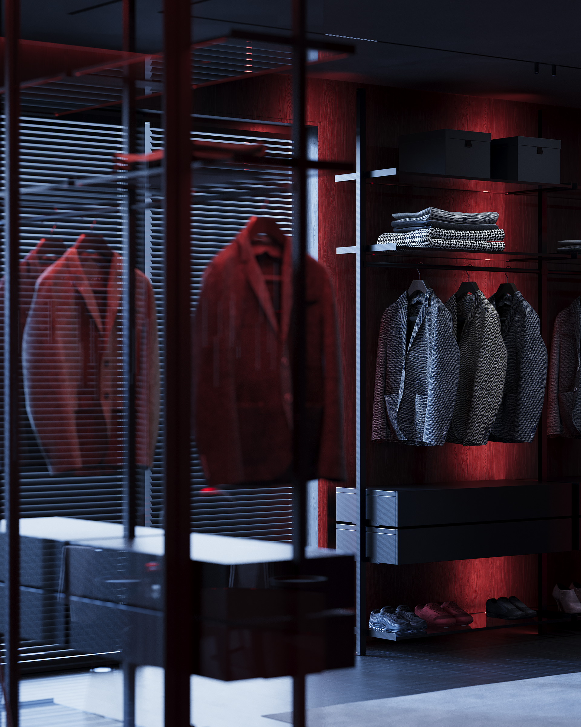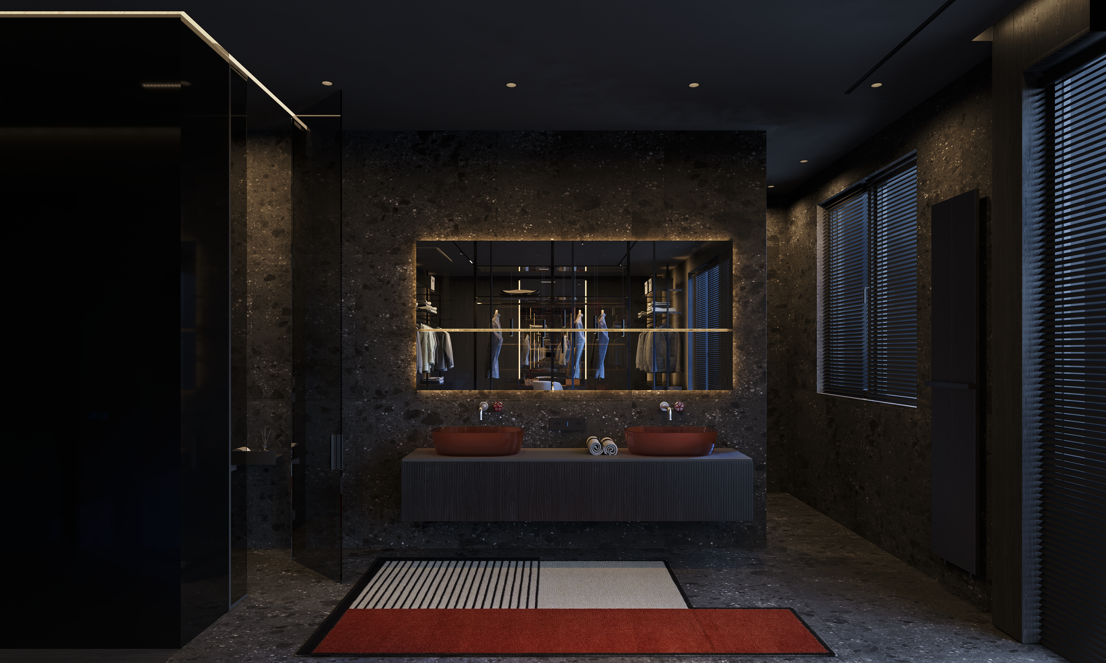 Lighting is the central tool. The project was developed to work in three states: natural daylight, a calm evening mode with ambient light, and a more expressive night setting where red tones shift the mood. Music is part of the lifestyle, not the concept, but it influenced the atmosphere and the way the home performs after sunset. Acoustic isolation is also integrated during construction, allowing the interior to support this use without disturbing the surrounding context.