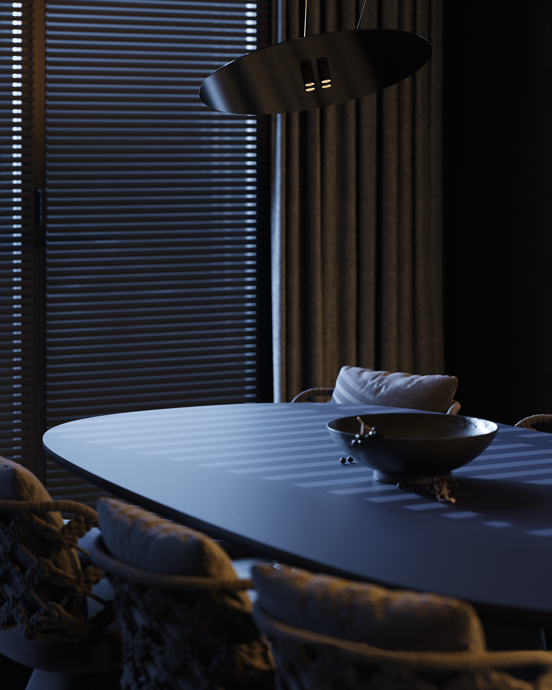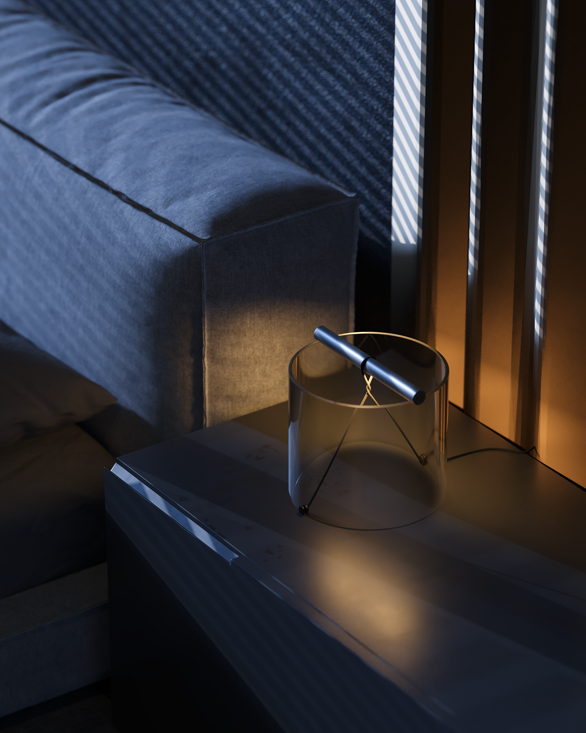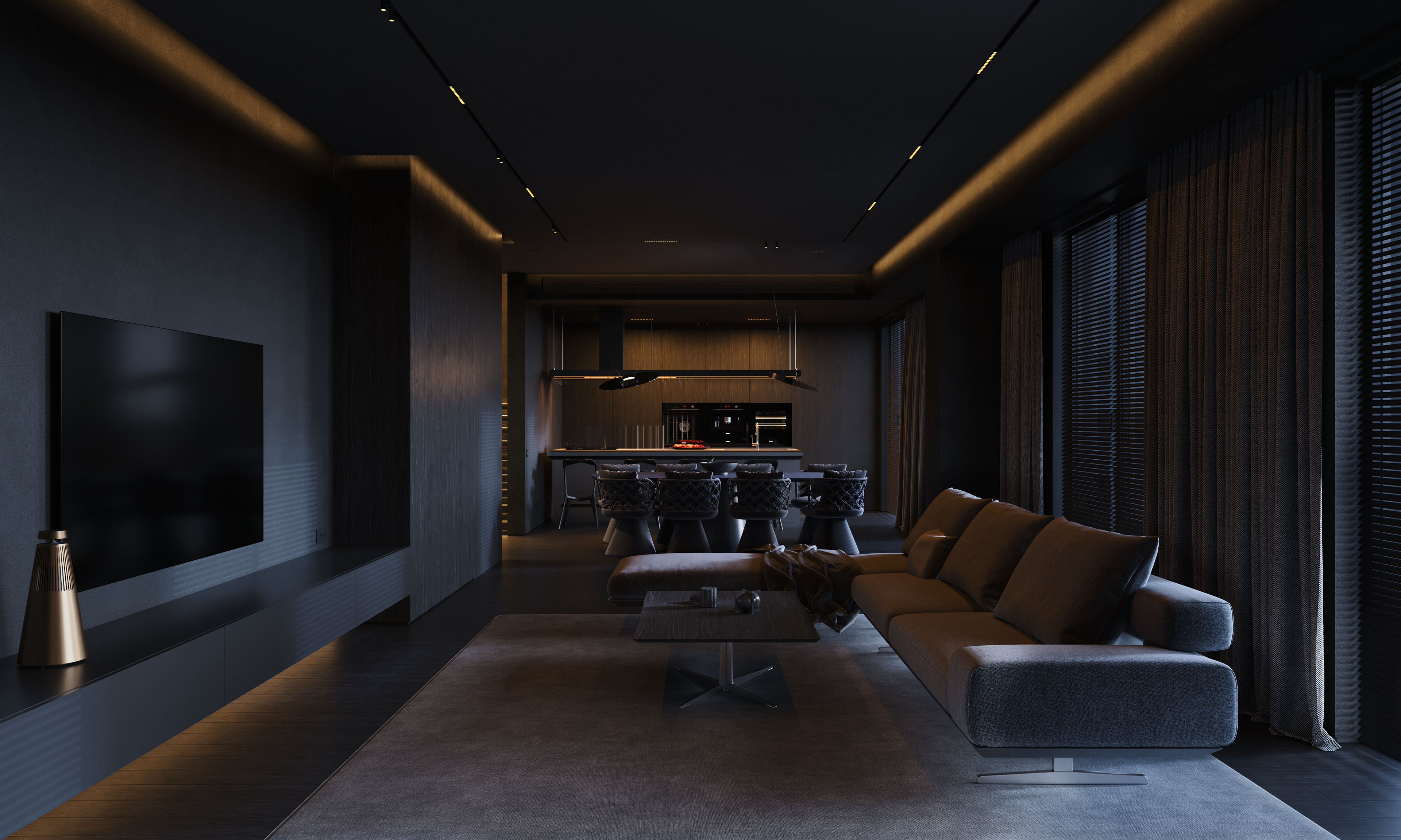 PUULSE is a two-level penthouse in Tbilisi designed for a young woman and her daughter, shaped around a quiet contrast between daytime calm and night-time intensity. The interior follows a STENSE approach: minimal geometry, limited materials, and strict control of surfaces. The space is intentionally restrained, so atmosphere is created through light rather than form.