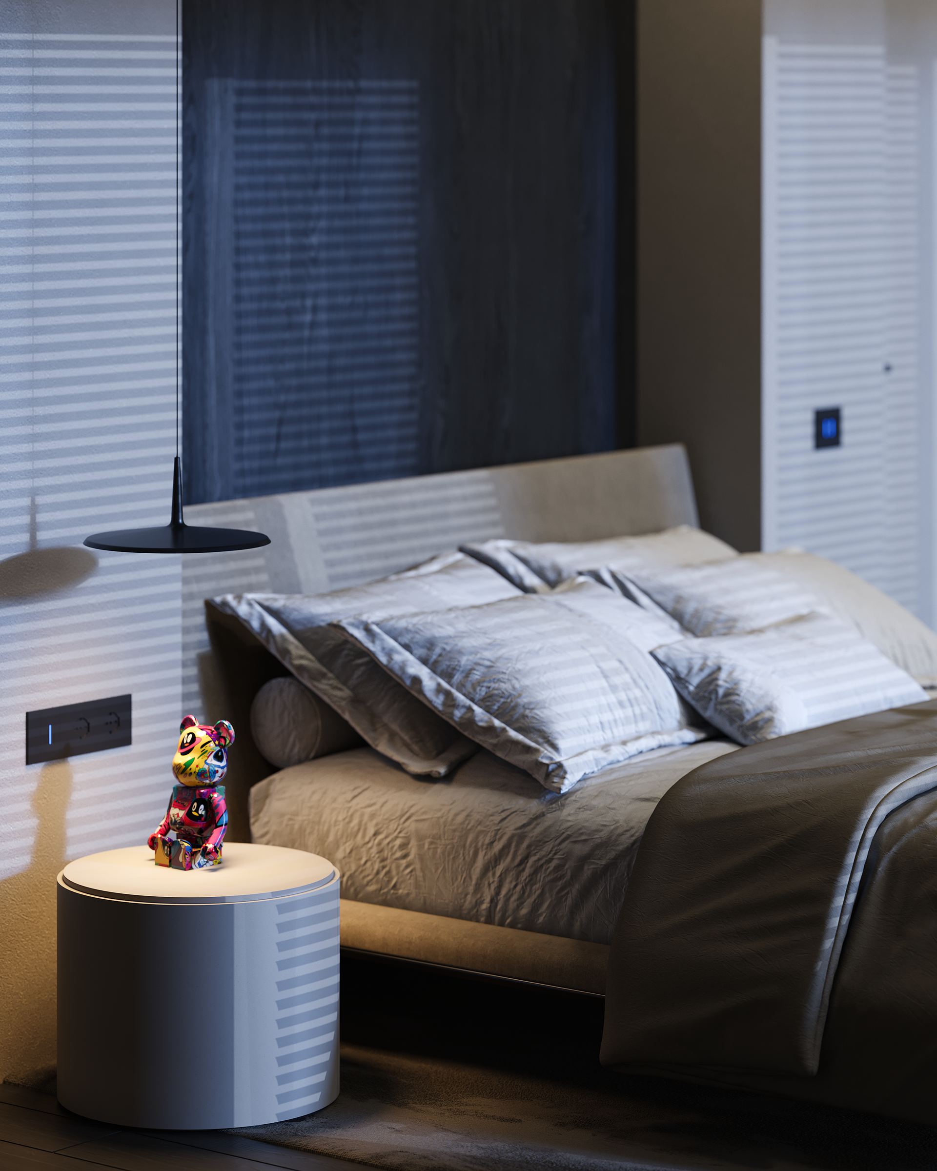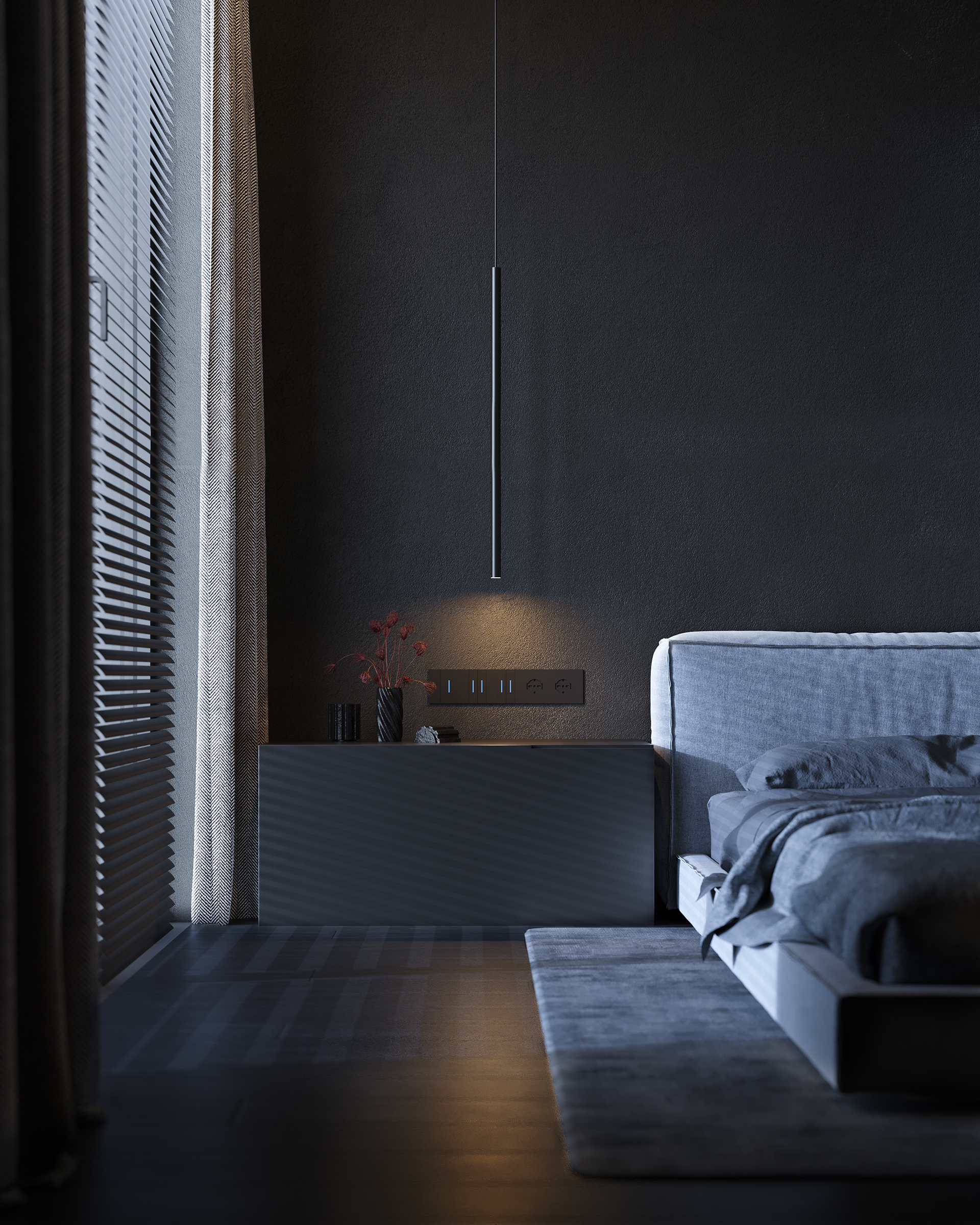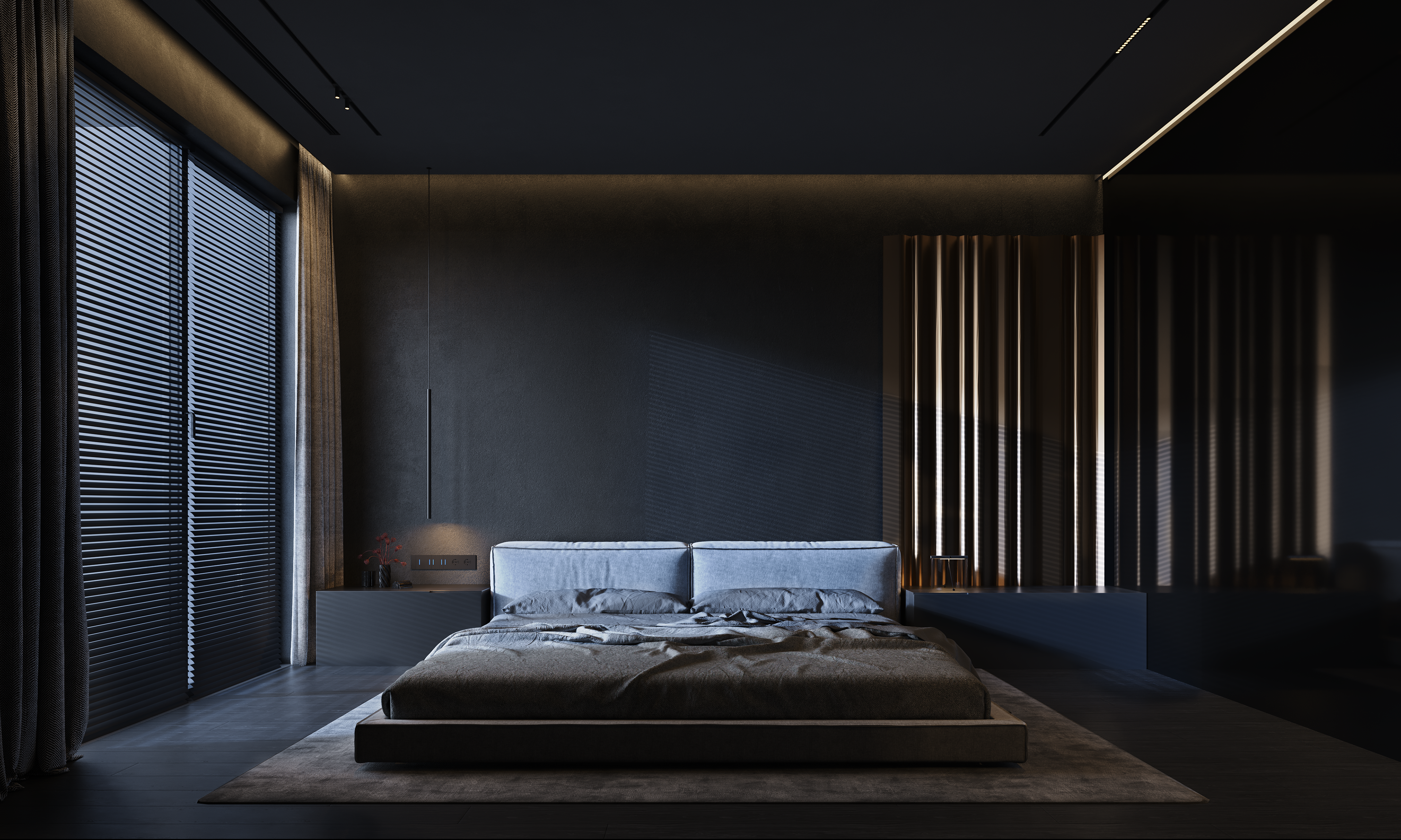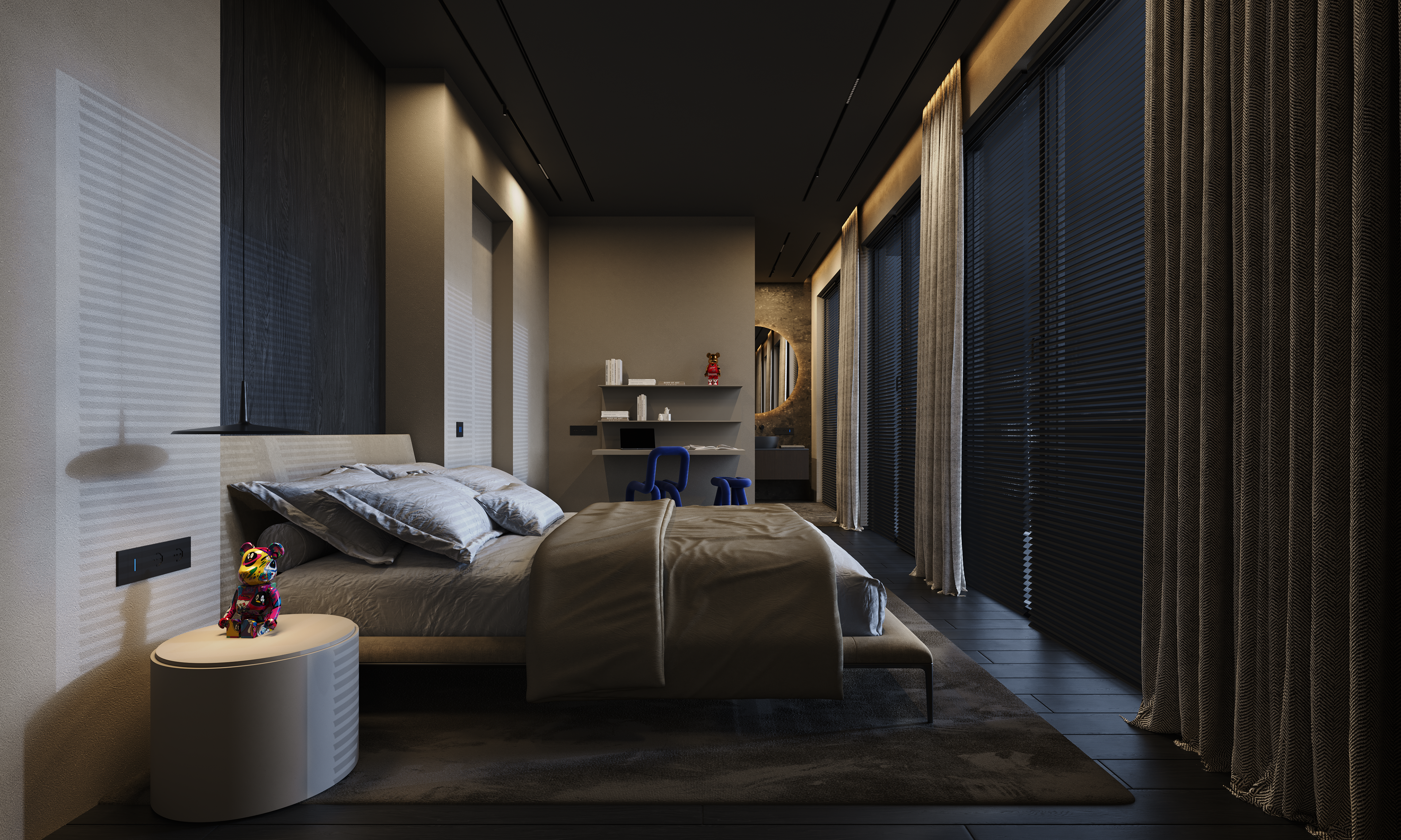 The upper level remains private and minimal, with the master suite treated as an open sequence rather than a collection of rooms. The child’s bedroom is the only deliberate softening of the palette, kept lighter while staying within the same disciplined language. The result is a penthouse that stays minimal in form, yet rich in experience, defined by restraint, precision, and light.