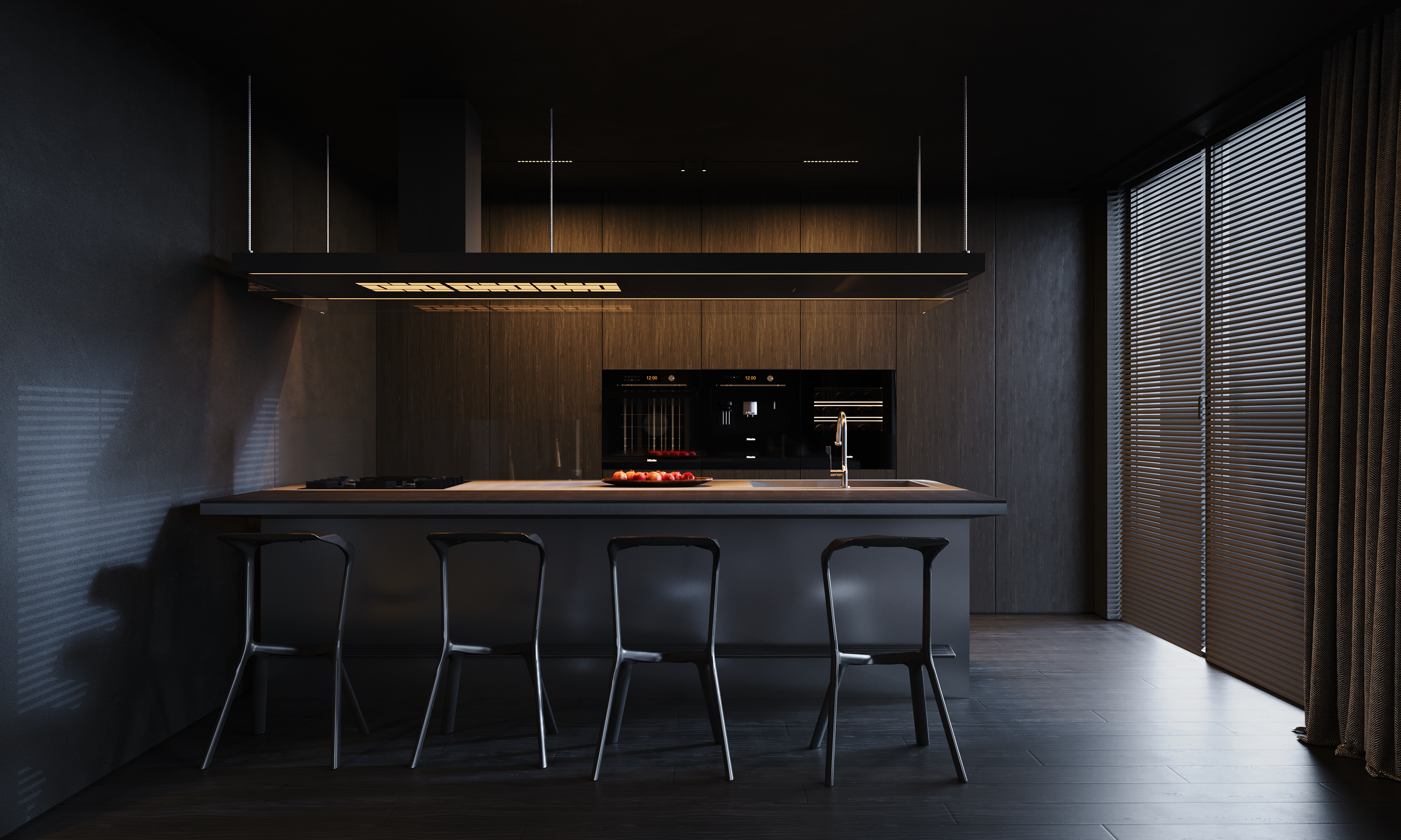 Dark wooden panels, a deep-toned parquet floor, and a dark ceiling establish a continuous background that absorbs daylight and softens the scale of the open plan. Instead of adding objects, the design relies on a few precise accents. Brass appears as a warm reflective layer, while red is introduced in small details and lighting, acting as a pulse rather than a theme.