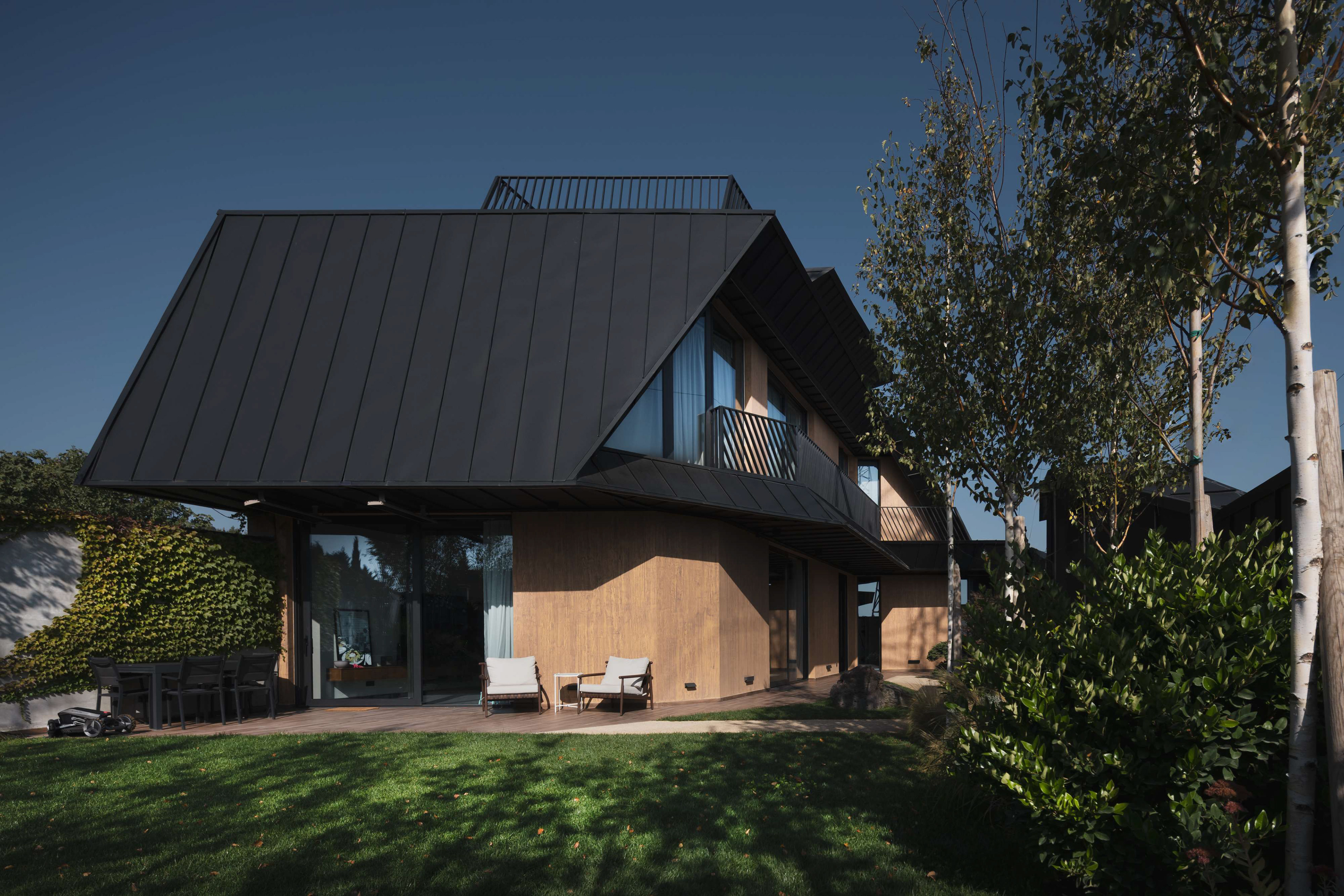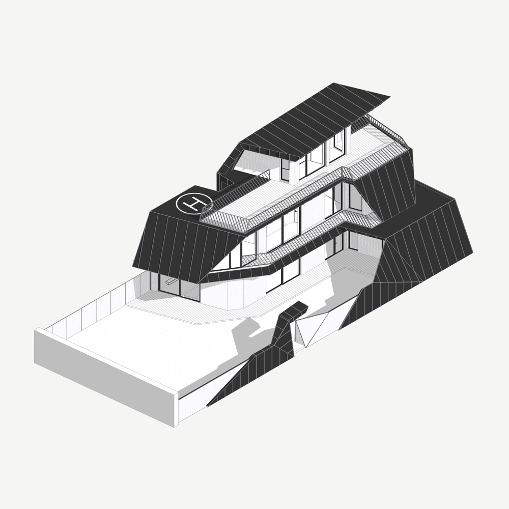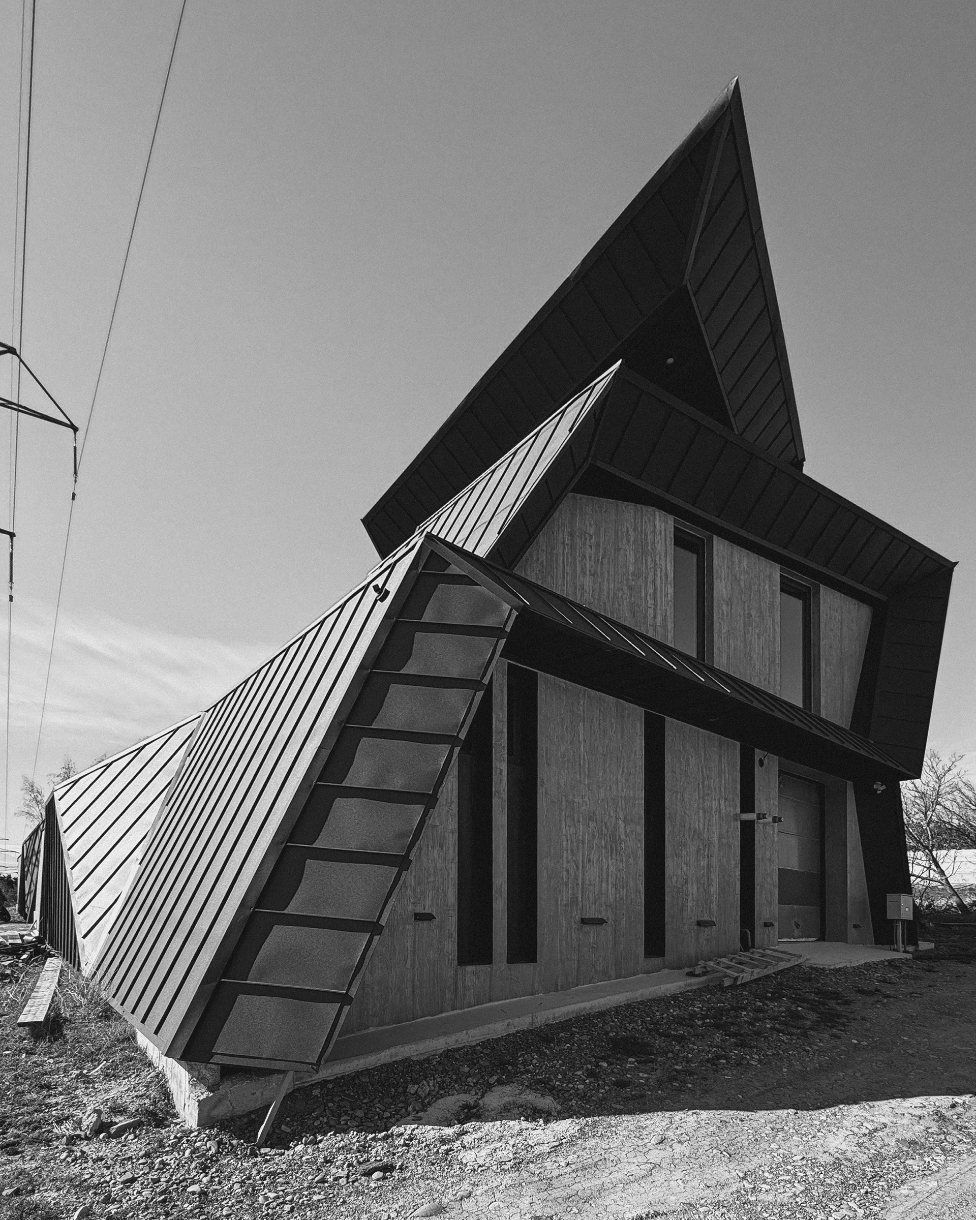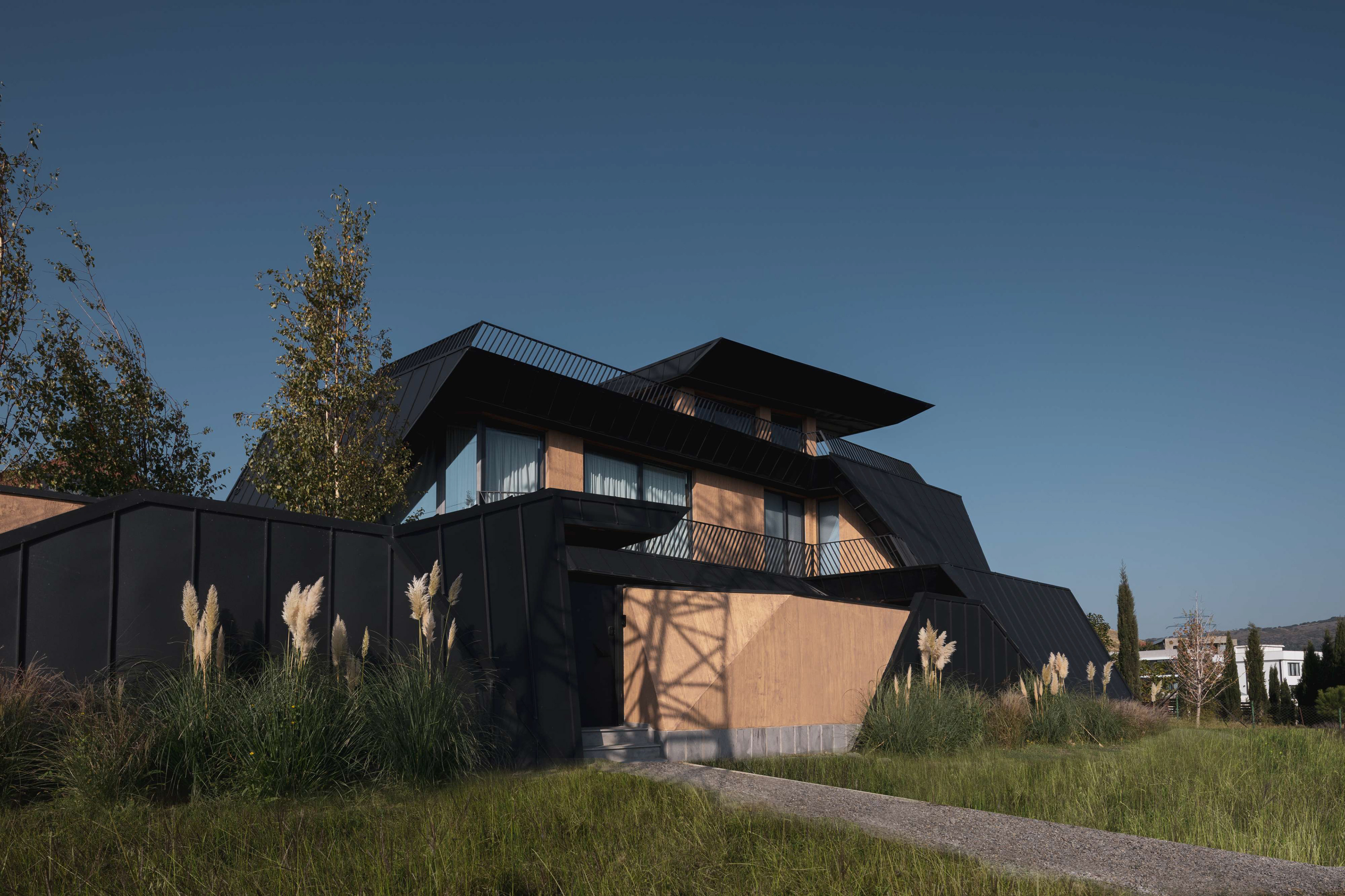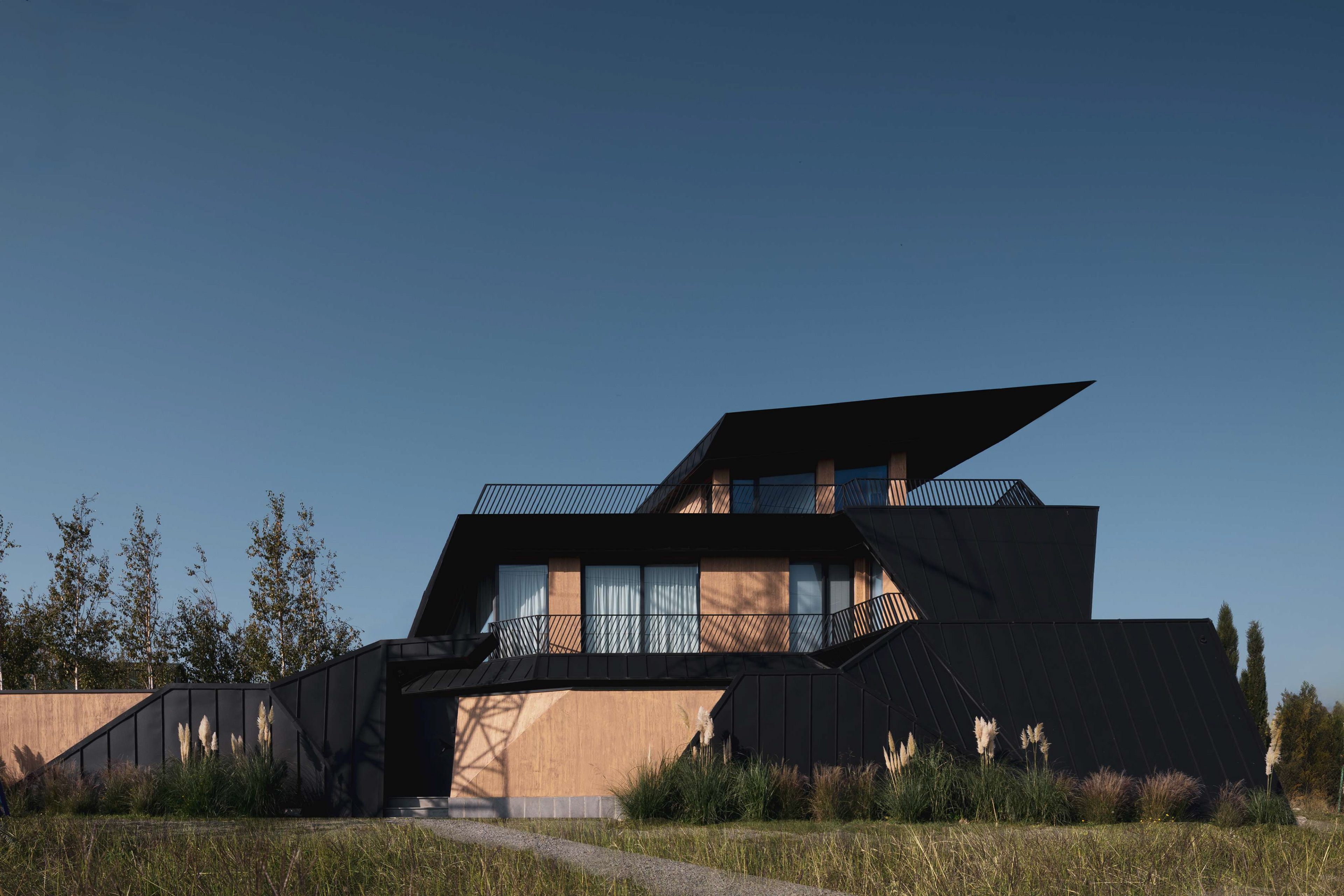 The architecture is conceived as a continuous folded volume. Dark metal and wood surfaces tilt and intersect, forming a sculptural composition that reads as a single organism. The house is not separated from its boundary; the fence becomes an extension of the architecture itself. Walls, enclosure, and entrance unfold from the same gesture, dissolving the typical distinction between object and perimeter.