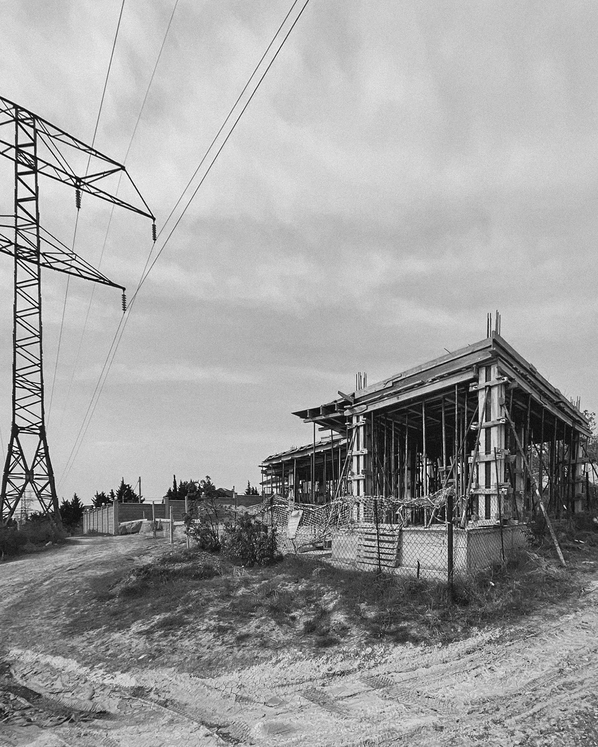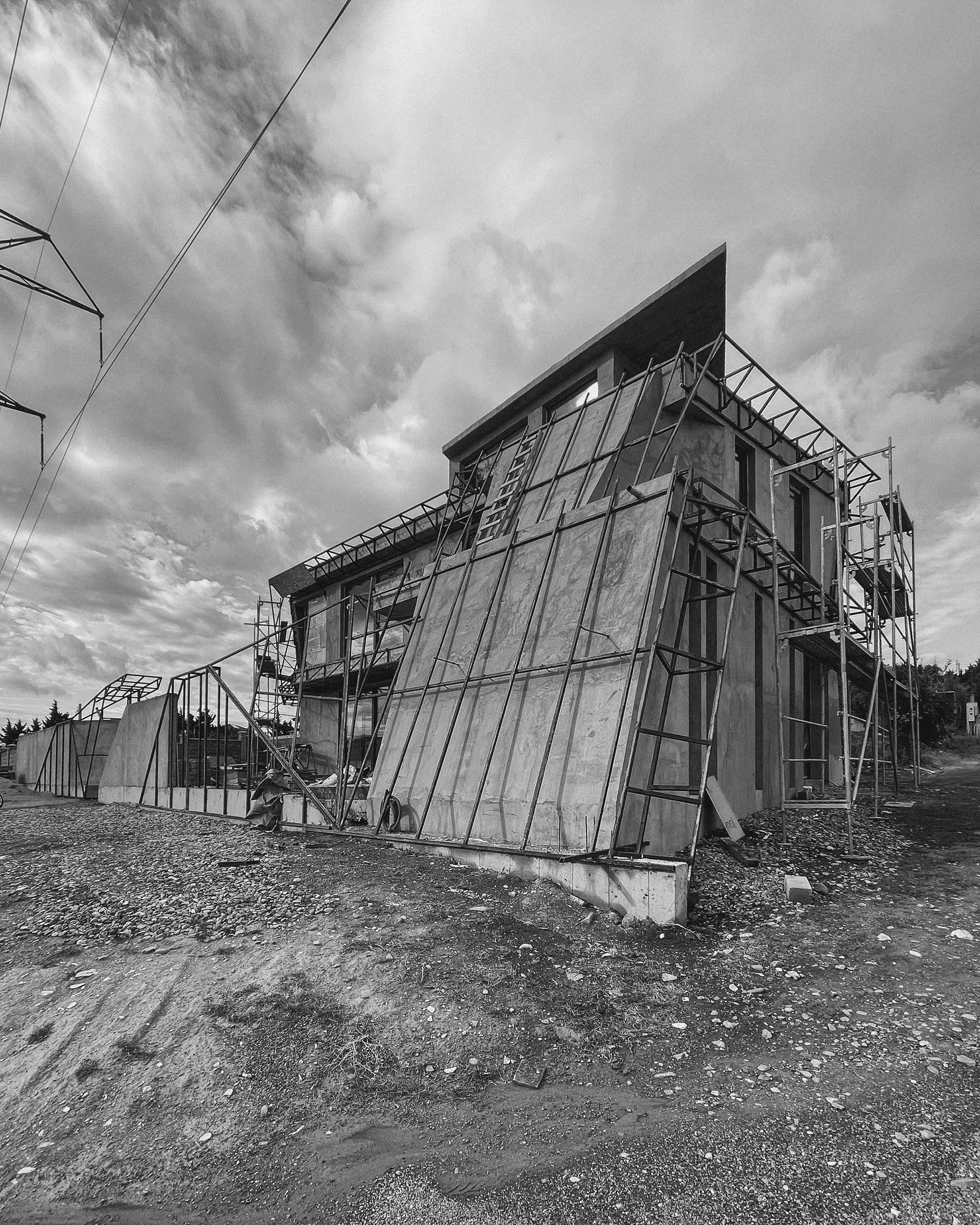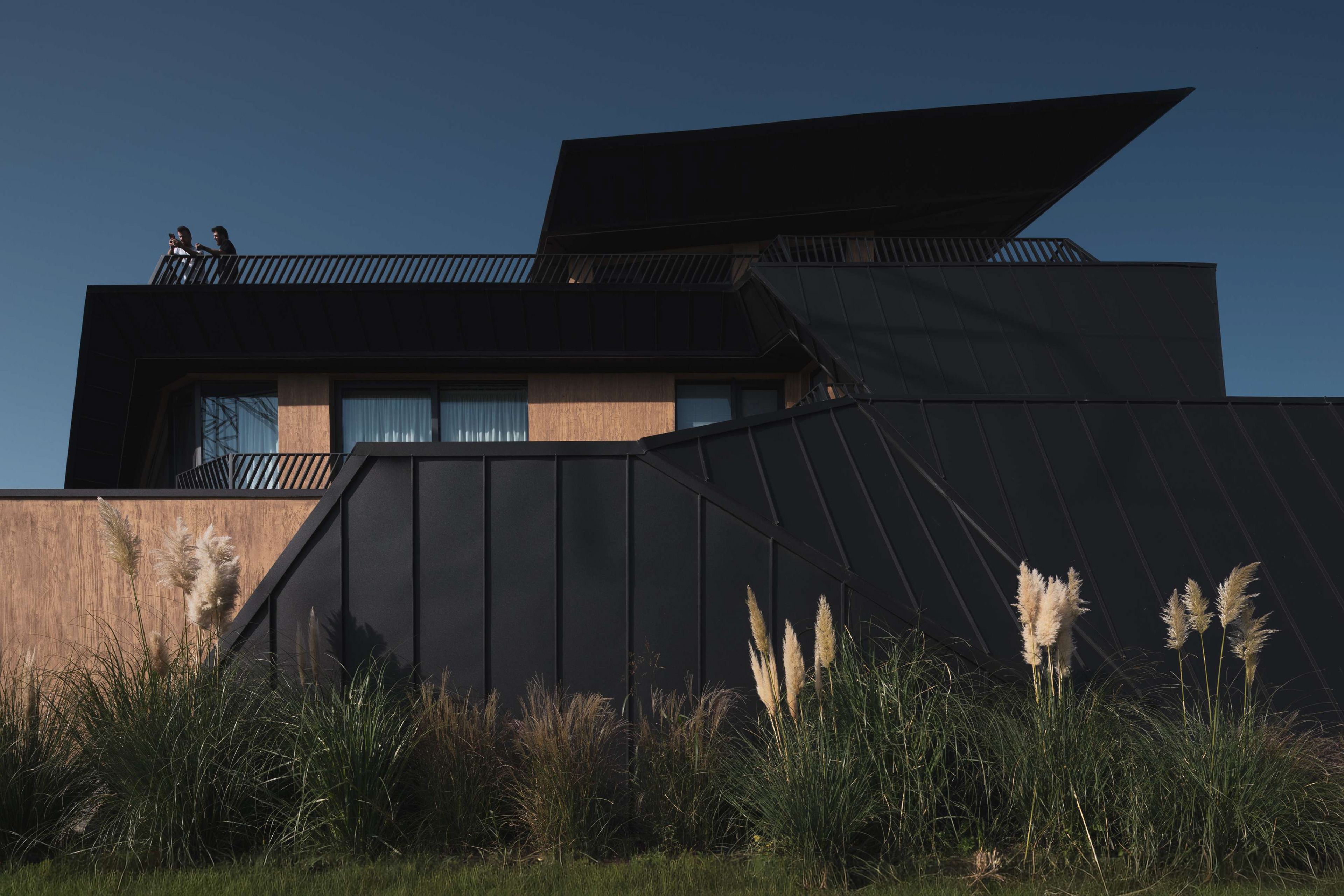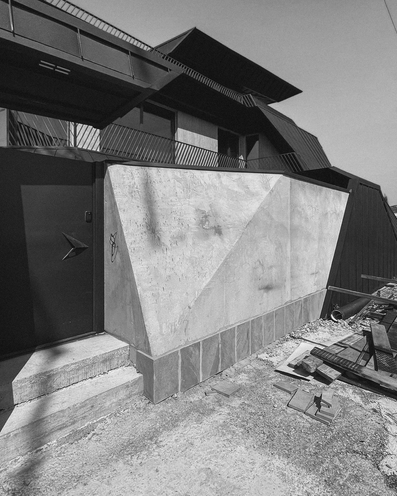 The architecture is conceived as a continuous folded volume. Dark metal and wood surfaces tilt and intersect, forming a sculptural composition that reads as a single organism. The house is not separated from its boundary; the fence becomes an extension of the architecture itself. Walls, enclosure, and entrance unfold from the same gesture, dissolving the typical distinction between object and perimeter.