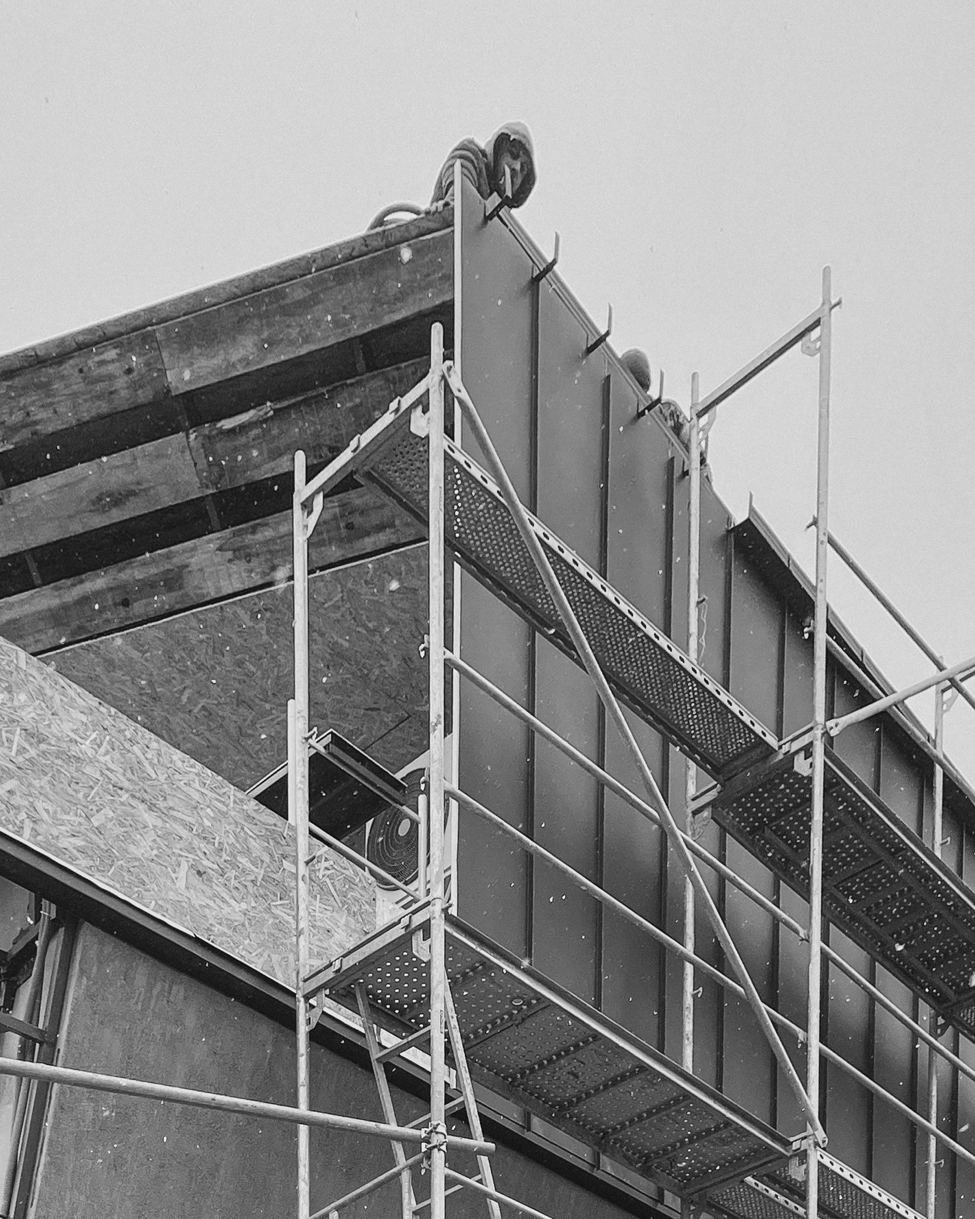 Dark metal and wood surfaces tilt and intersect, forming a sculptural composition that reads as a single organism