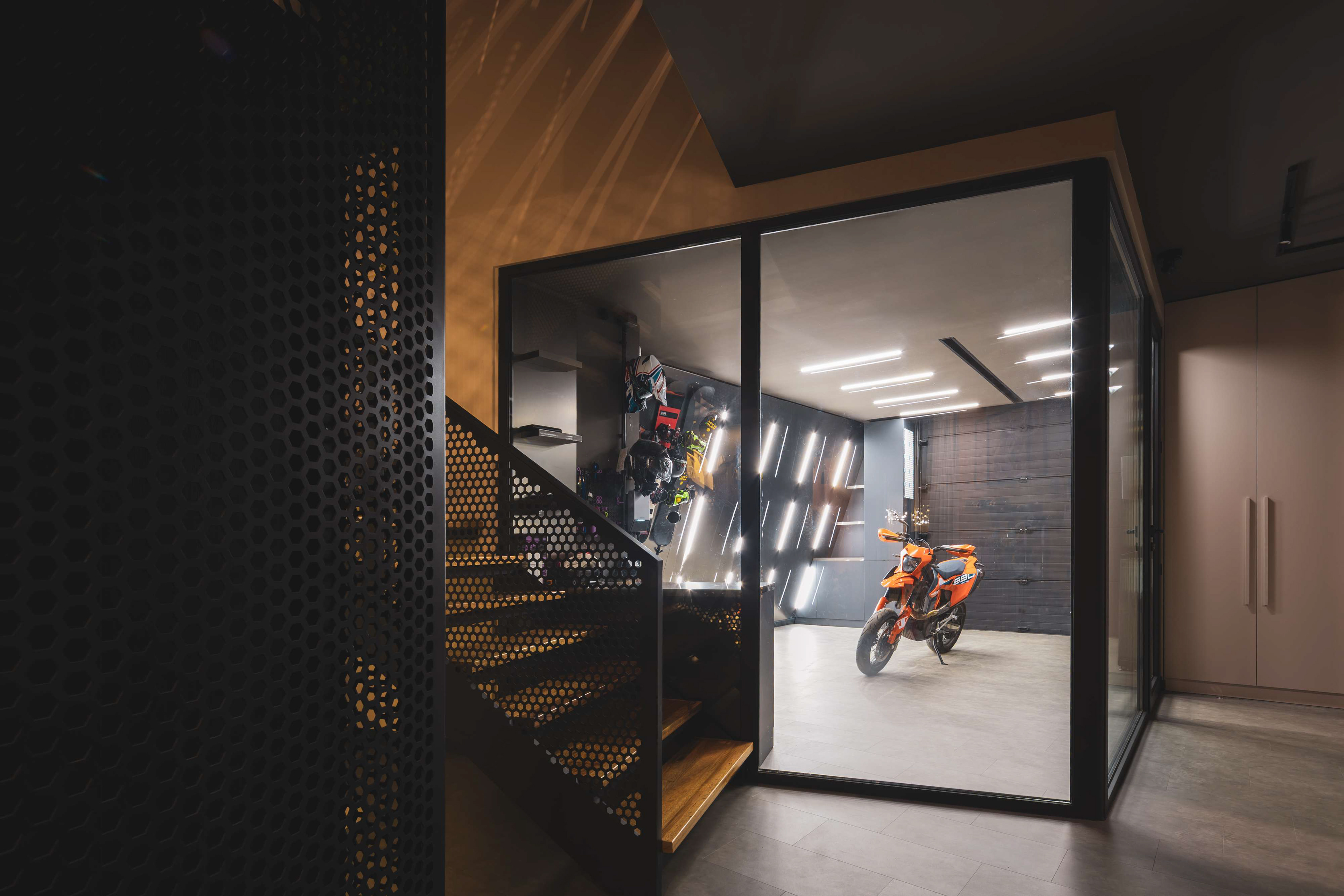 A protected courtyard softens the transition from exterior to interior, while the upper levels remain composed and private. The project demonstrates how disciplined form and material consistency can create a strong architectural presence without relying on complexity.
