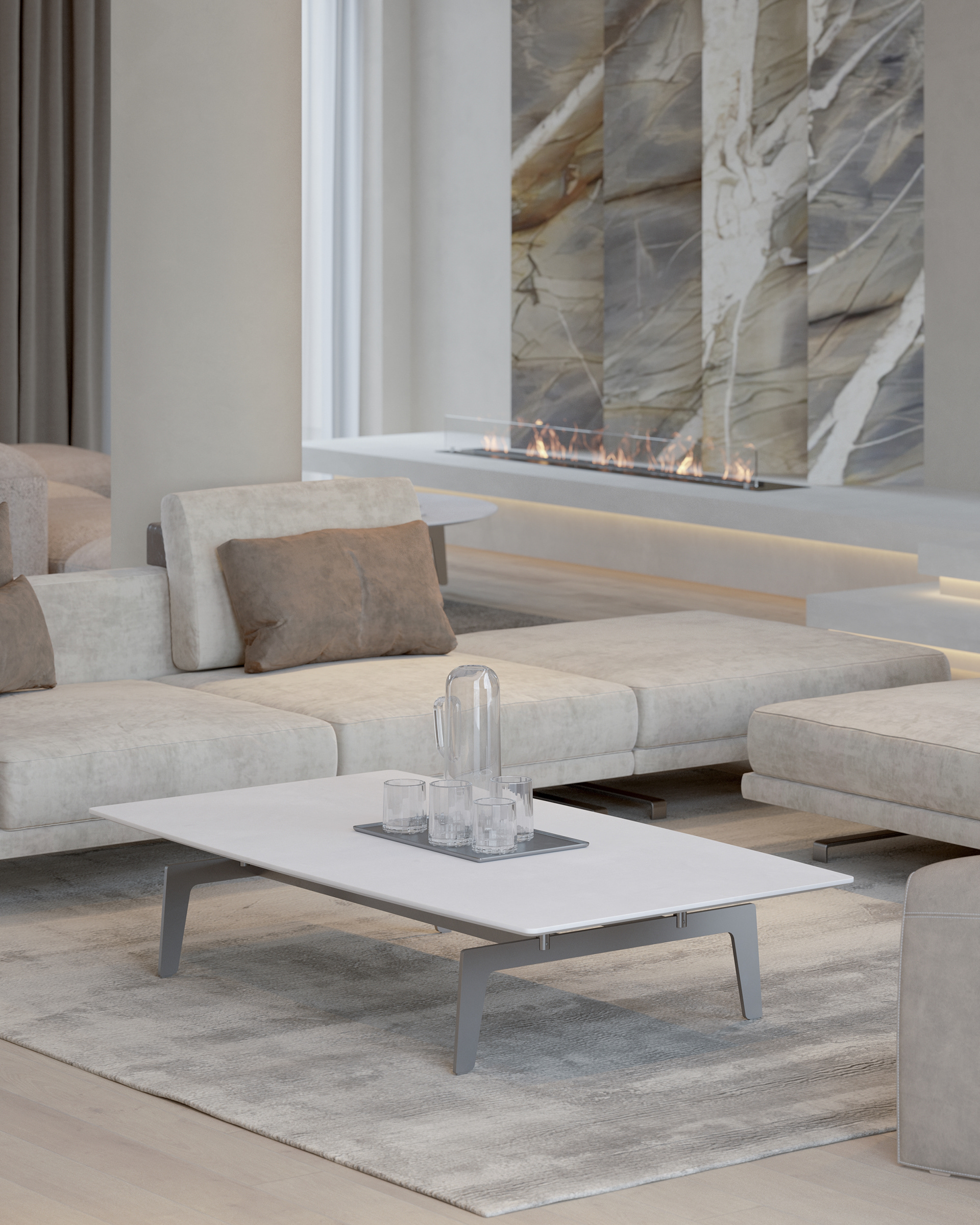 Natural materials play a central role in achieving a contemporality and minimalism in this project. Light beige and ivory tones adorn the walls and floors, creating an open and tranquil atmosphere, while carefully selected furniture pieces from renowned Italian brands add sophistication and comfort throughout to the space.