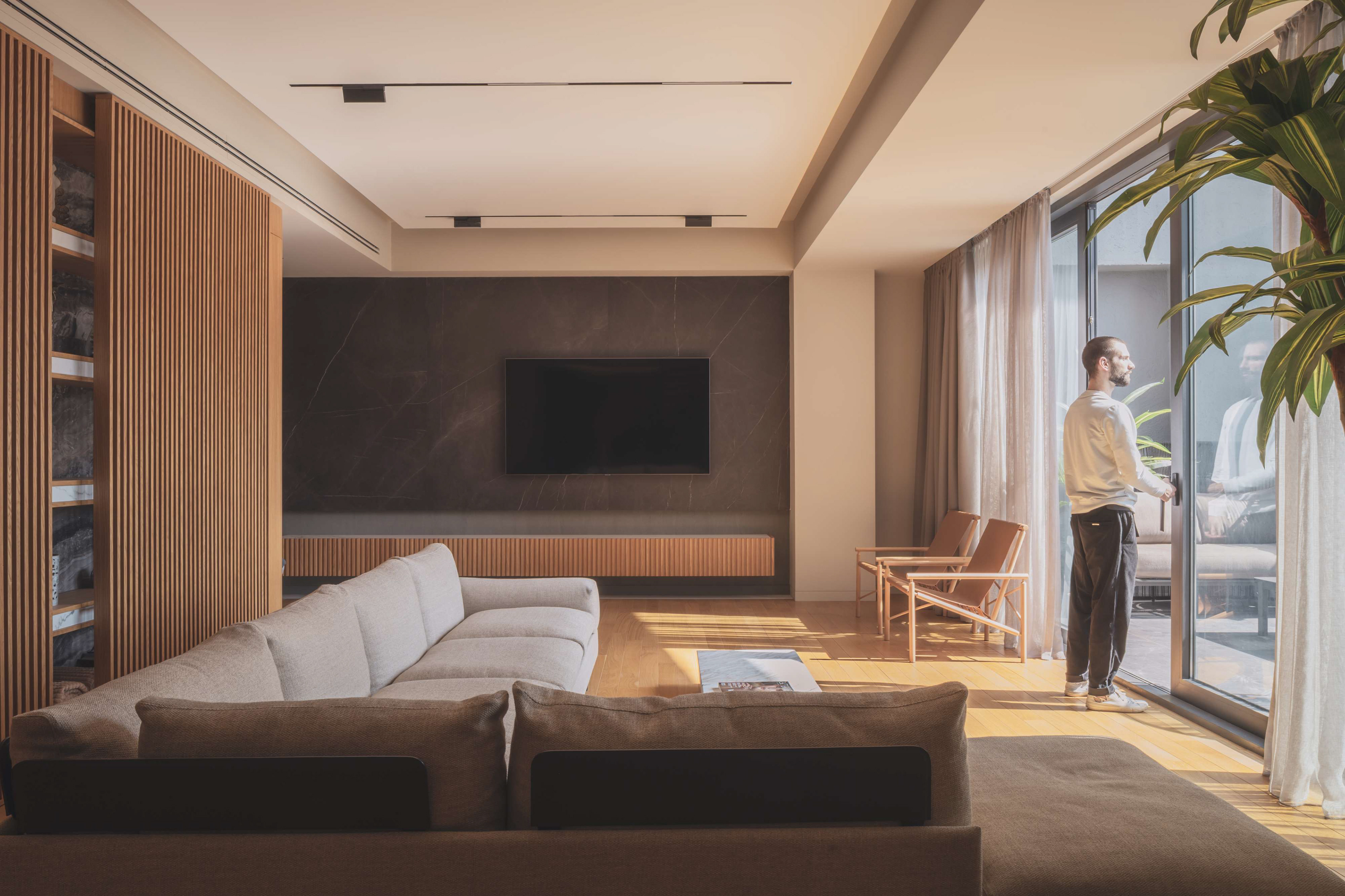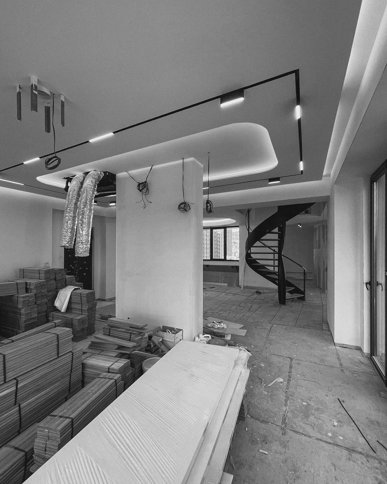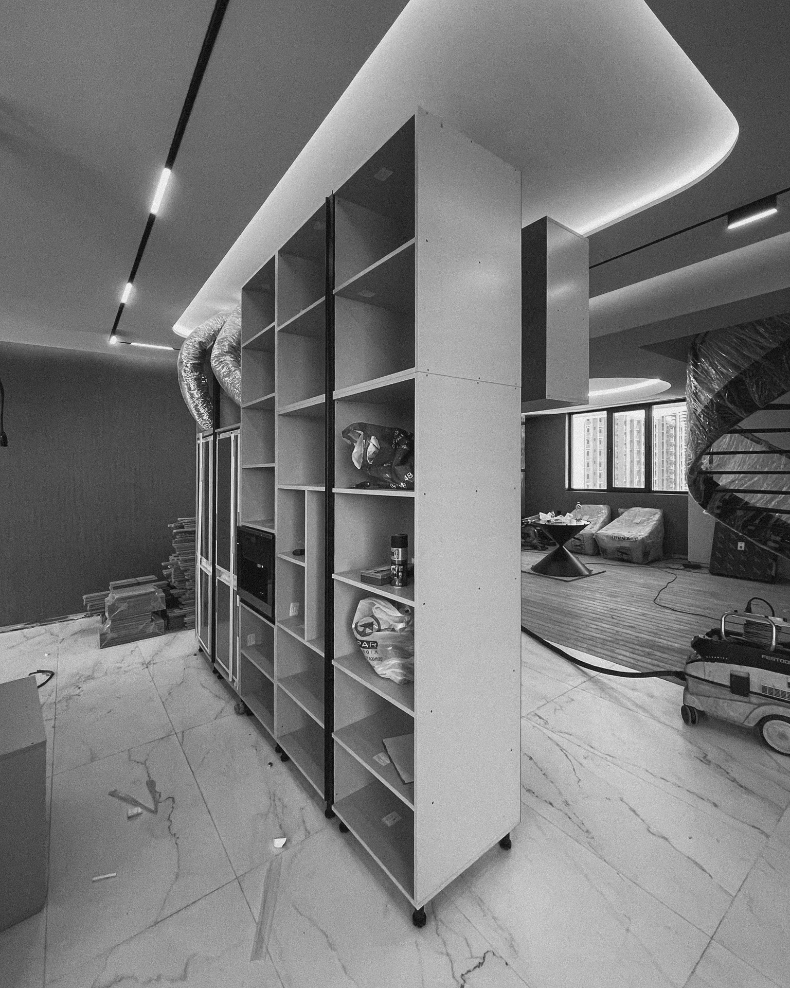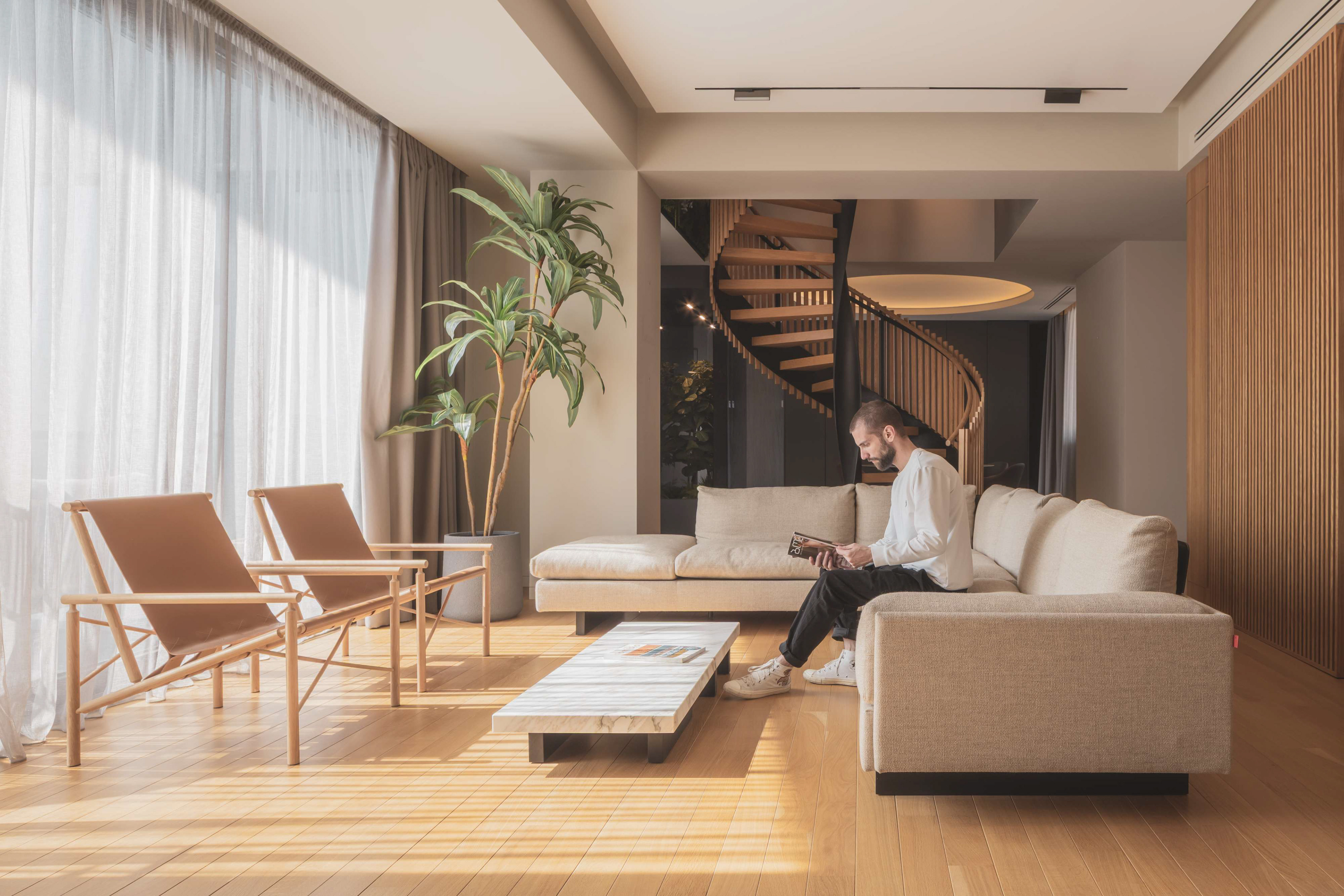An open-plan interior of the duplex is imbued with an air of tranquility. The monotone sequences, the low-profile furniture, and a terrarium wall were the main conducive elements to the development of the placid space.