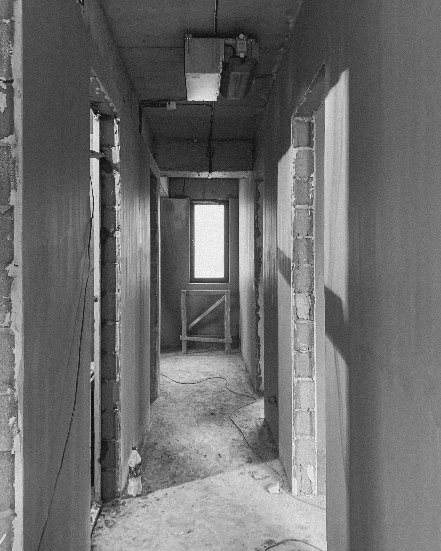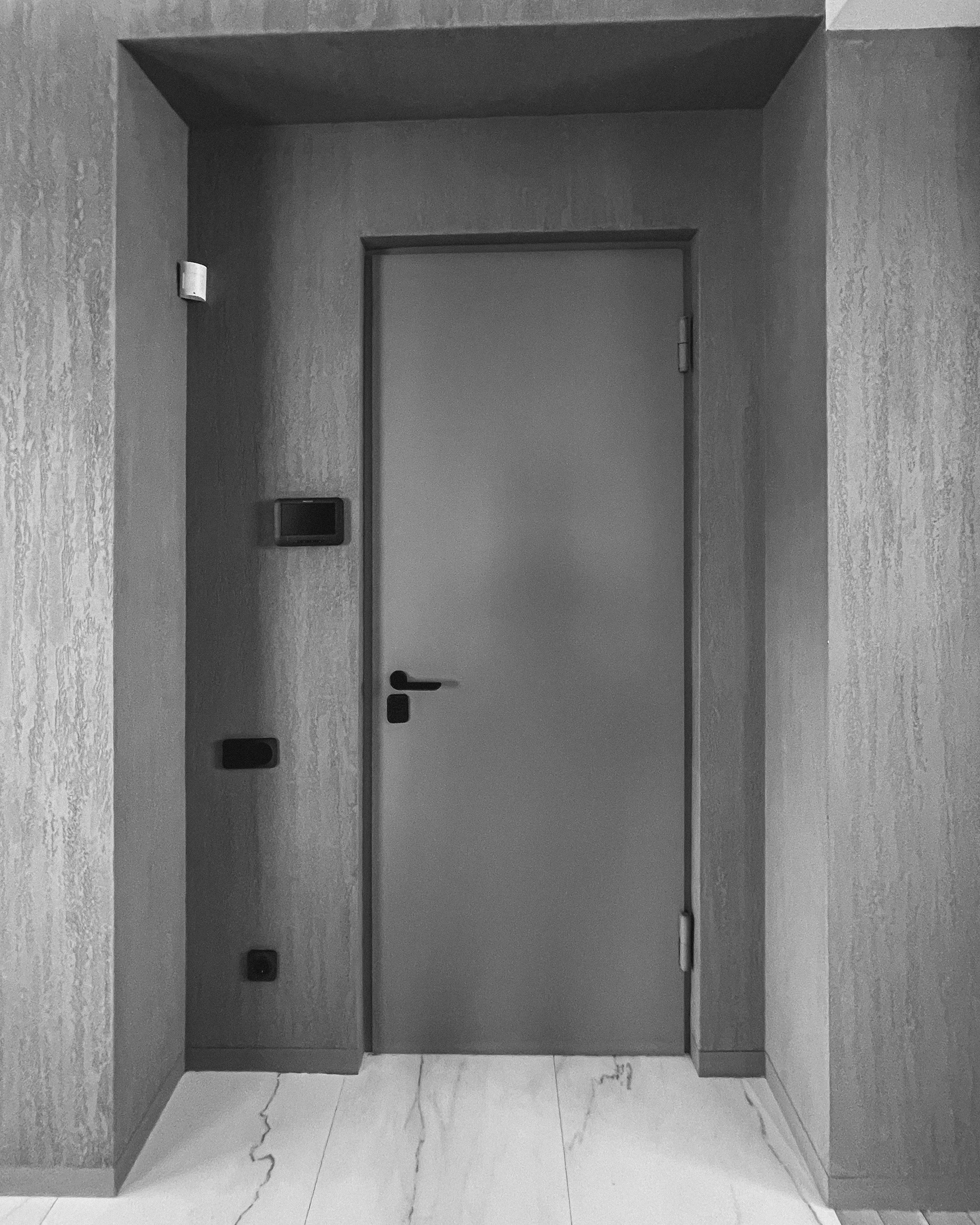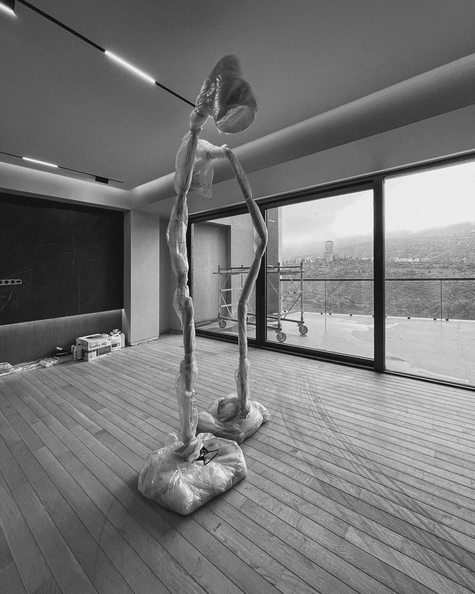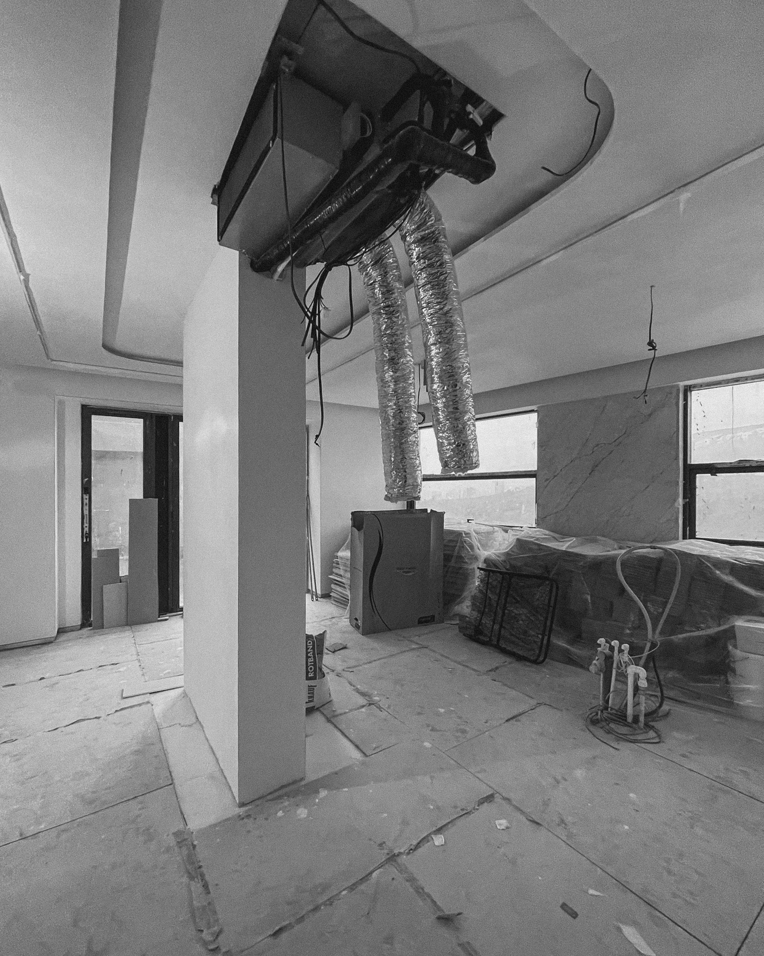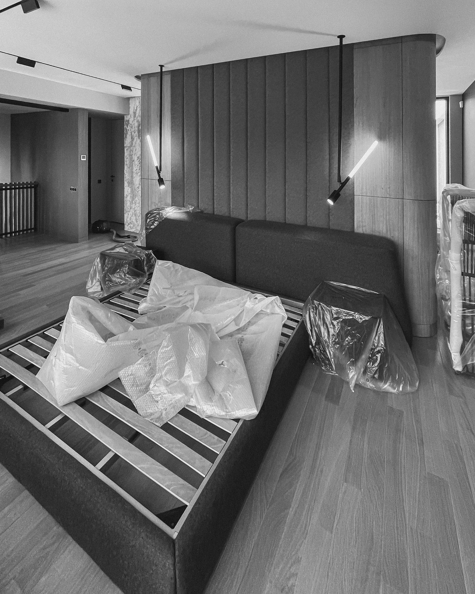 An open-plan interior of the duplex is imbued with an air of tranquility. The monotone sequences, the low-profile furniture, and a terrarium wall were the main conducive elements to the development of the placid space.
