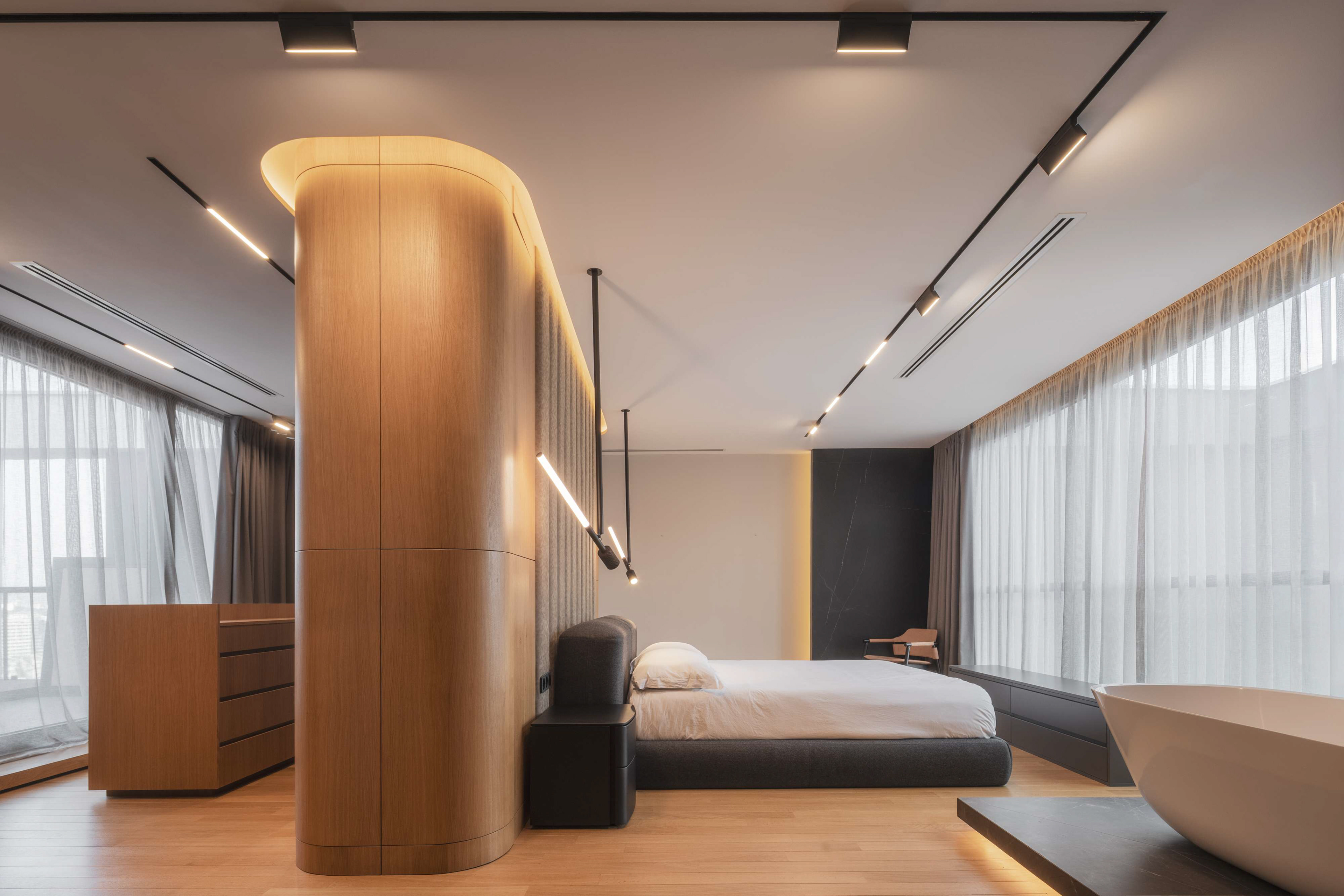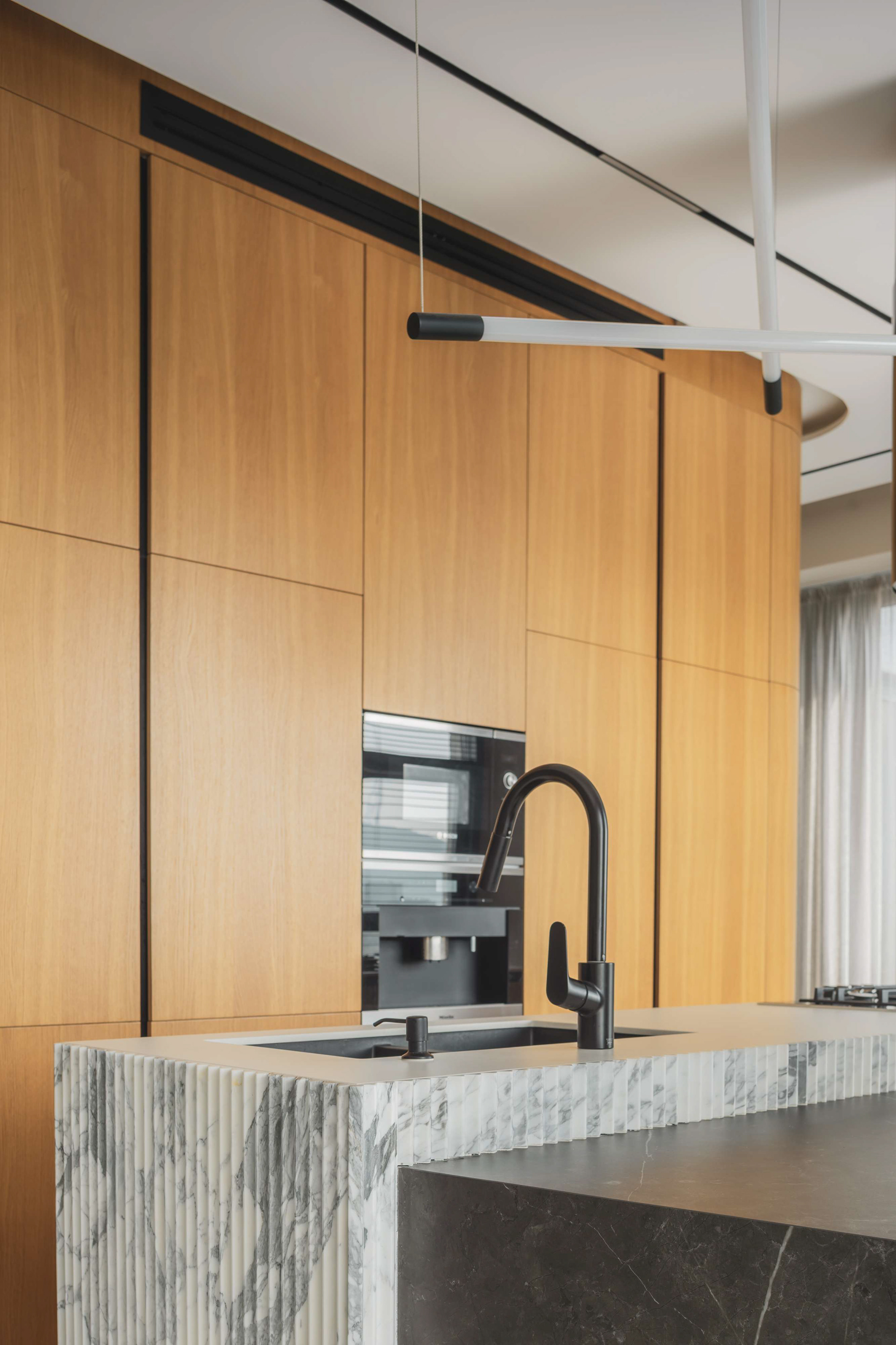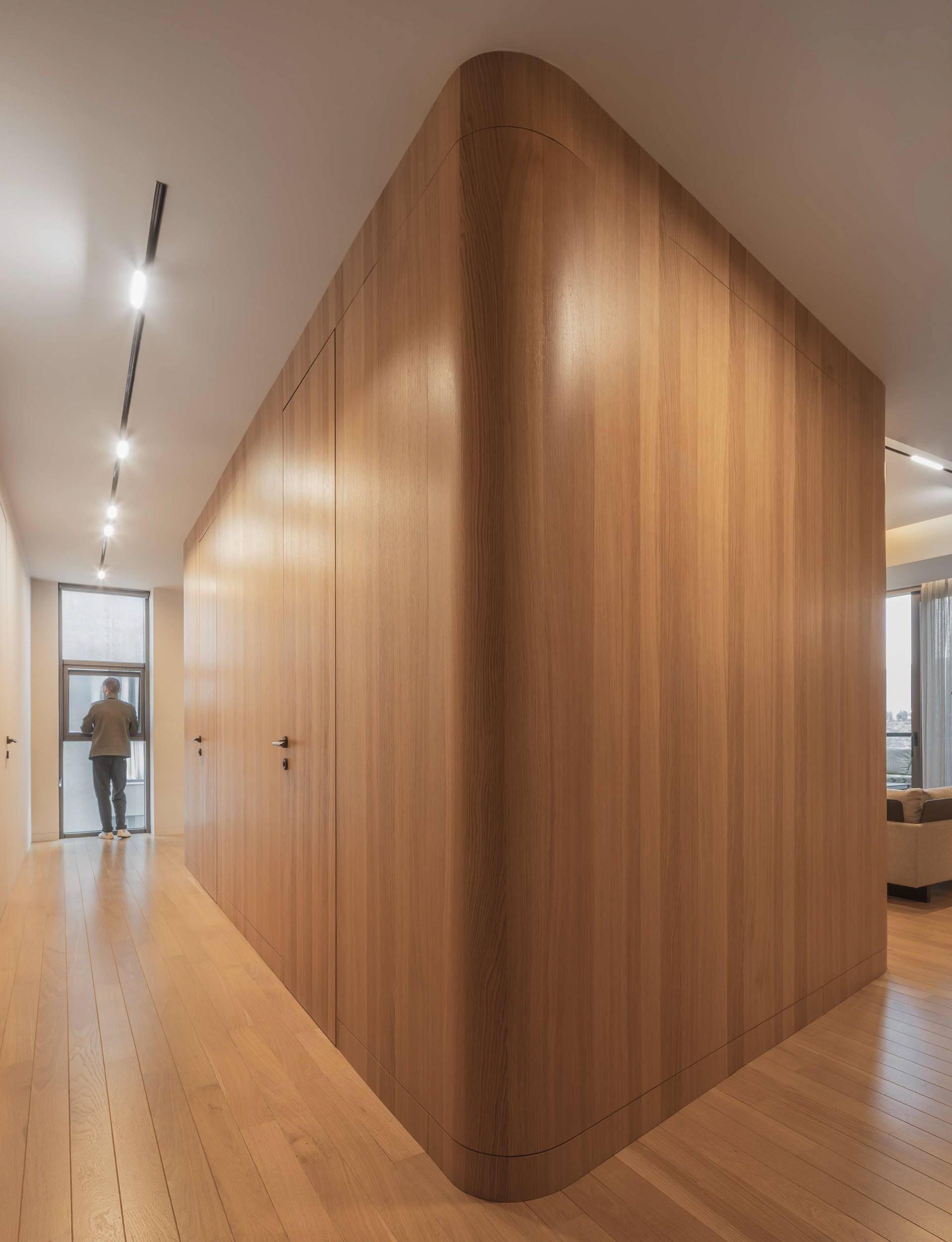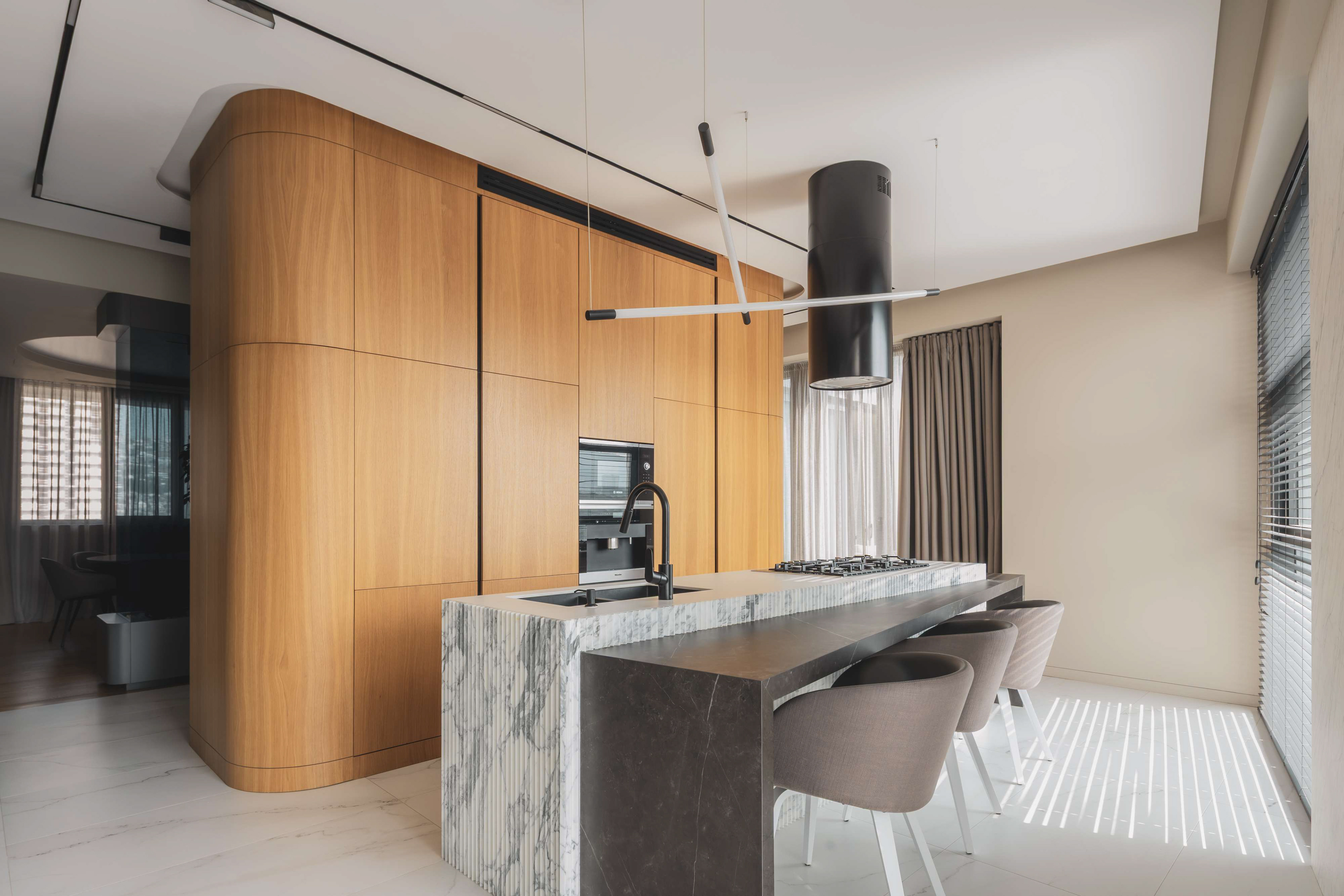 The light wood and stone textures are prevalent throughout the design. An iteration of the vertical line carvings on a marble kitchen island and a master bathroom wall, and the rounded wooden walls in the kitchen, the living room and the master bedroom mold the distinct aesthetics of the interior. A delicately structured spiral staircase was tailored for this unruffled environment.