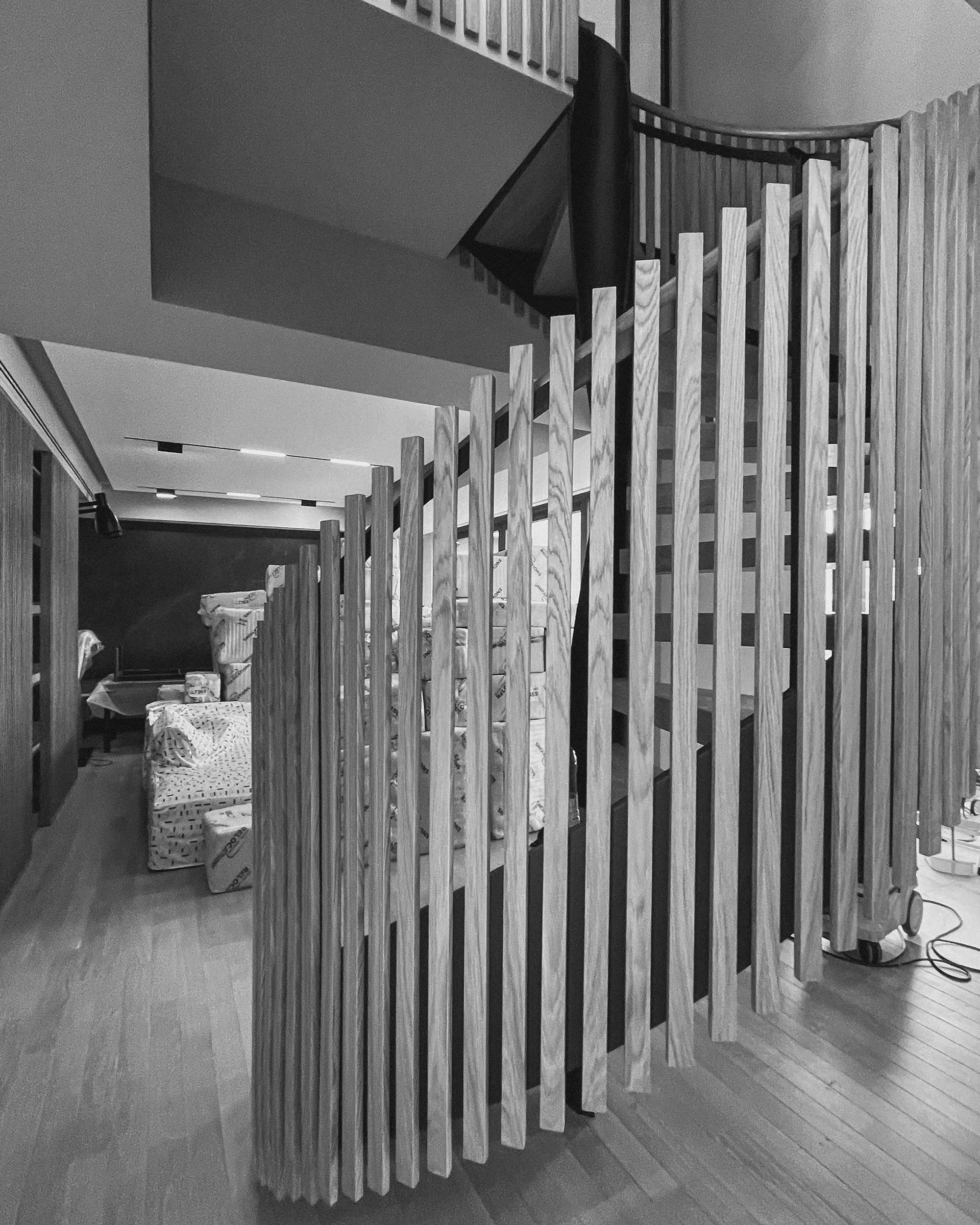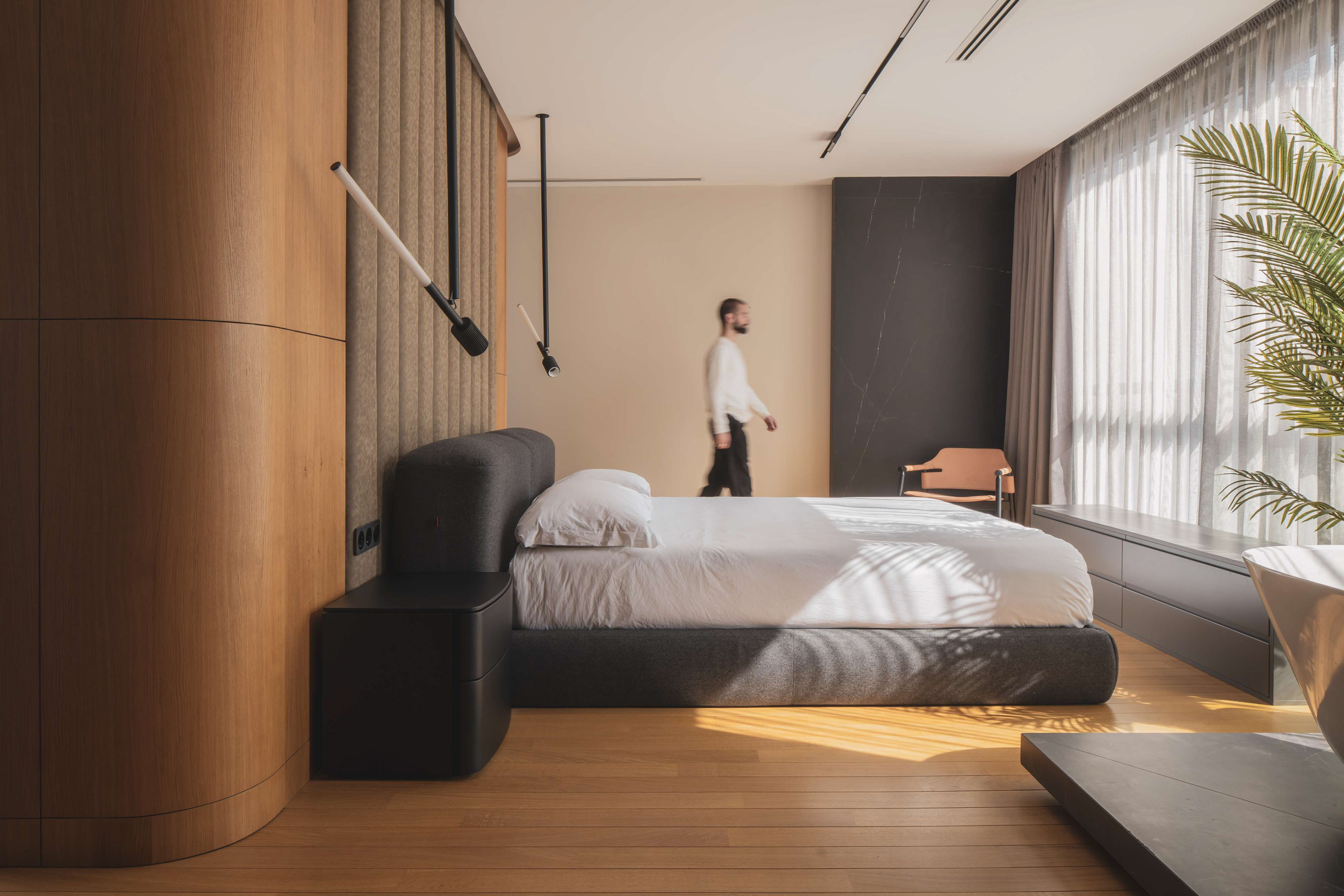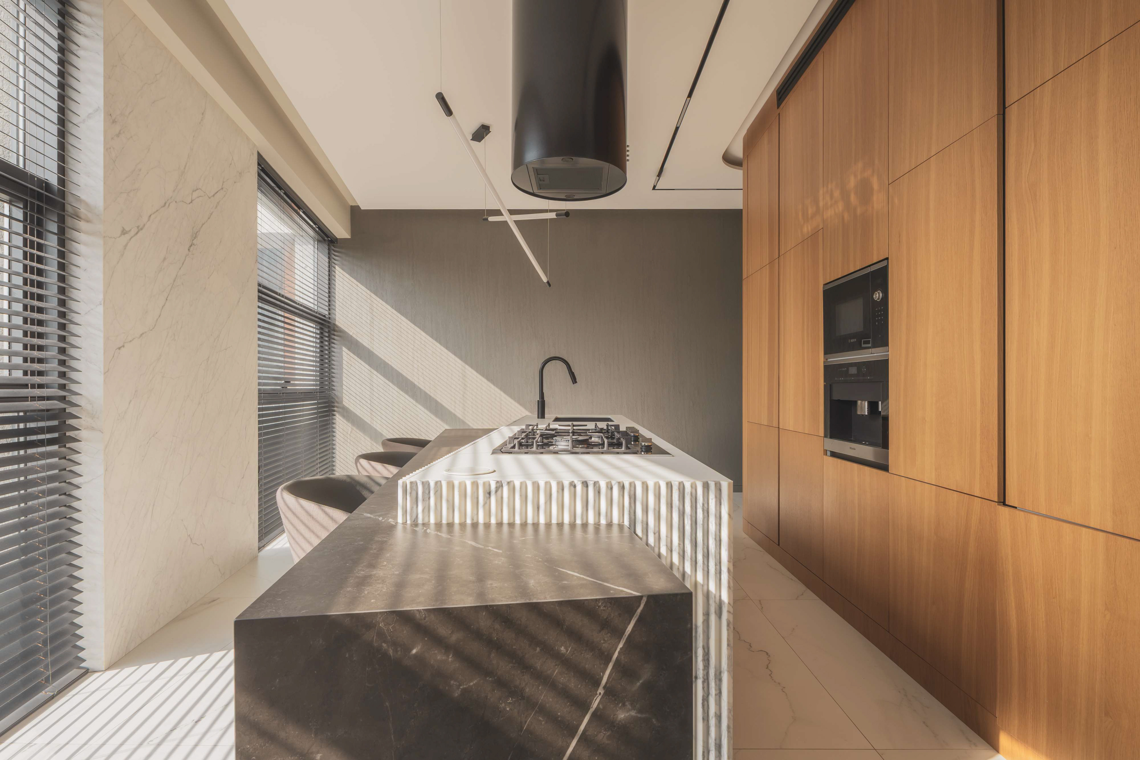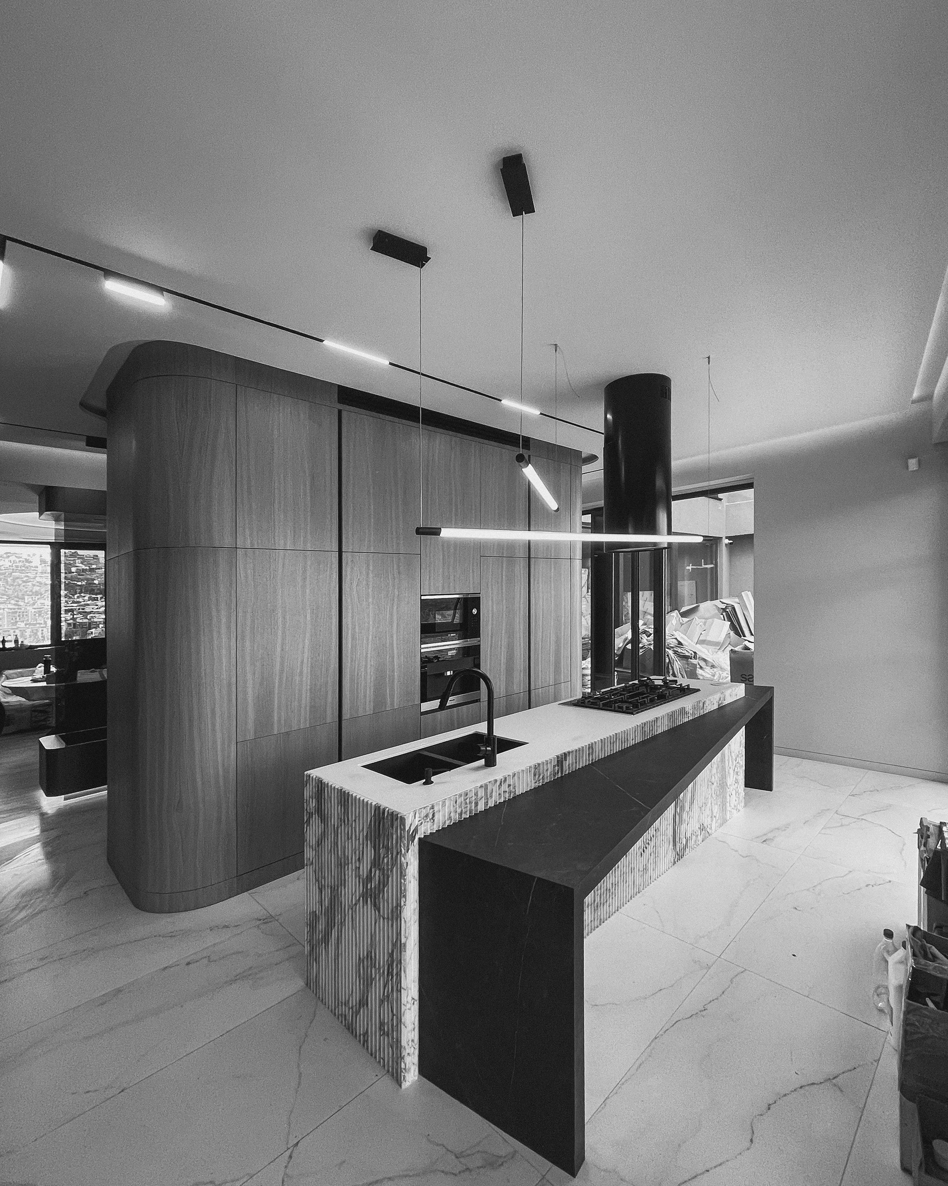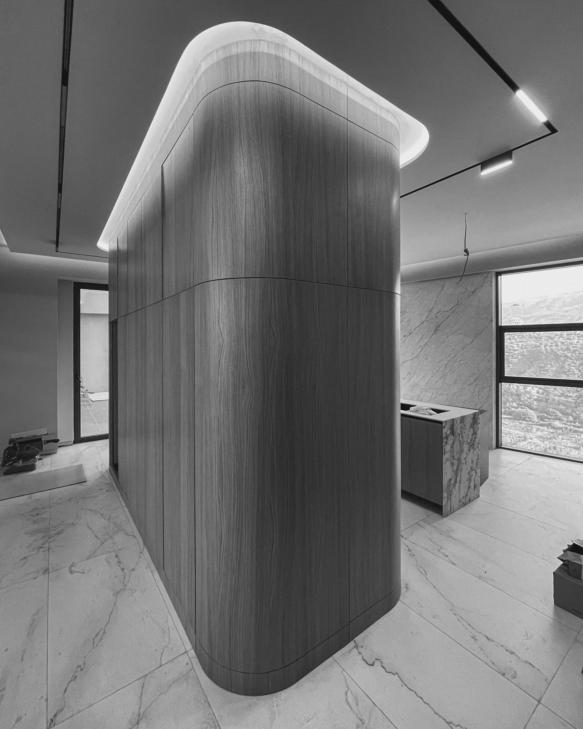 The light wood and stone textures are prevalent throughout the design. An iteration of the vertical line carvings on a marble kitchen island and a master bathroom wall, and the rounded wooden walls in the kitchen, the living room and the master bedroom mold the distinct aesthetics of the interior. A delicately structured spiral staircase was tailored for this unruffled environment.