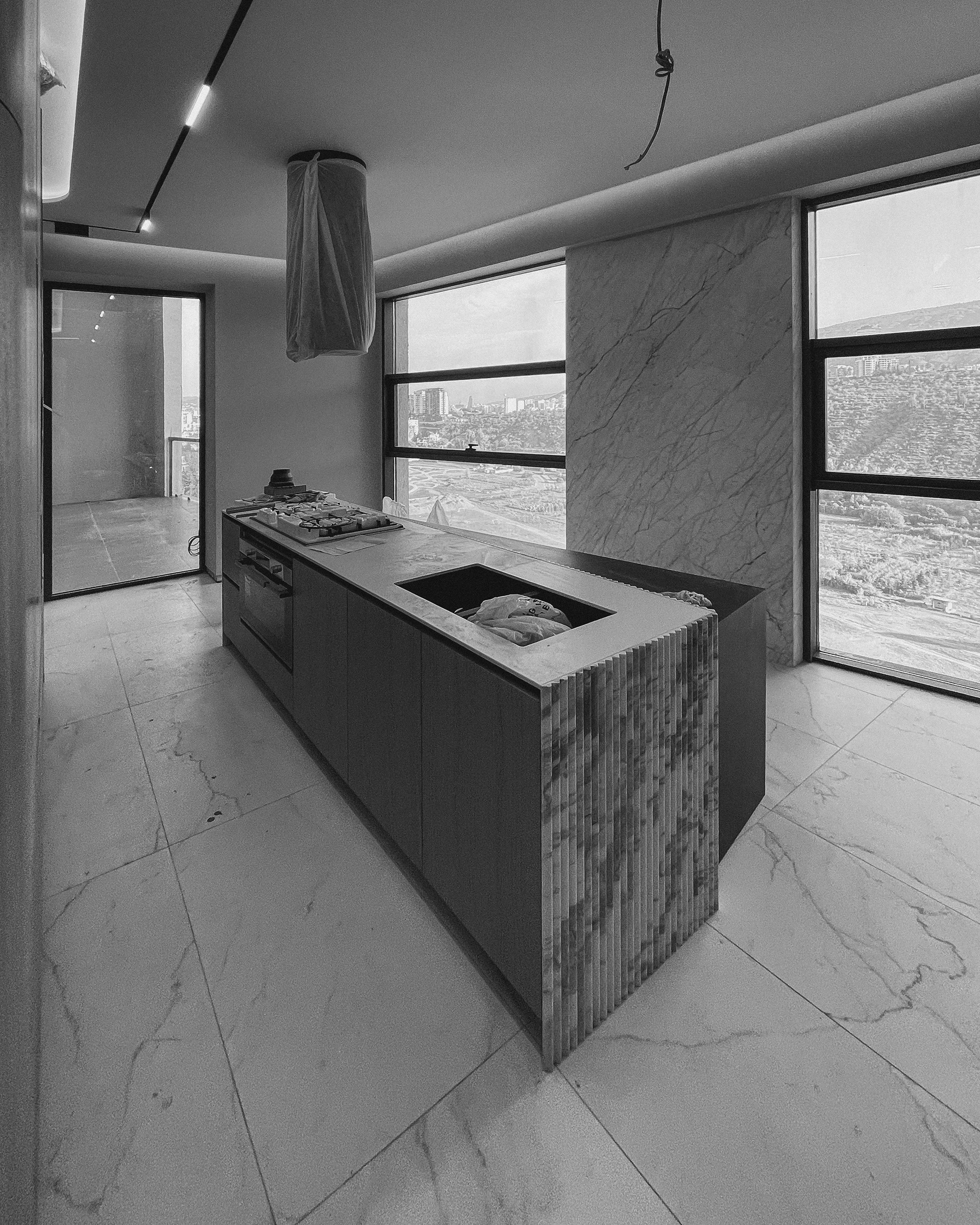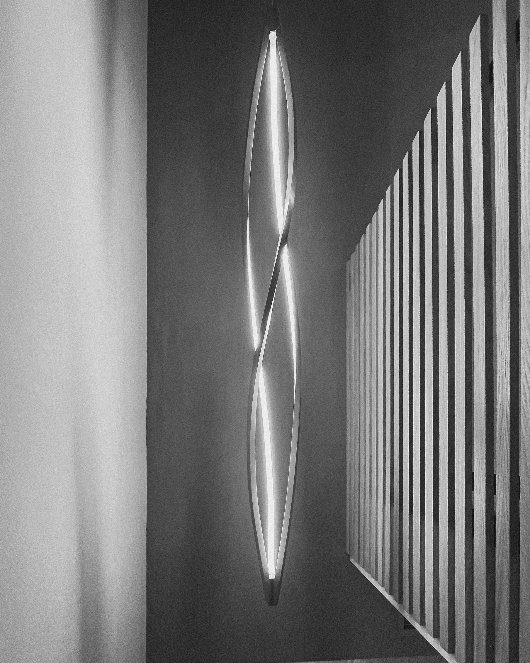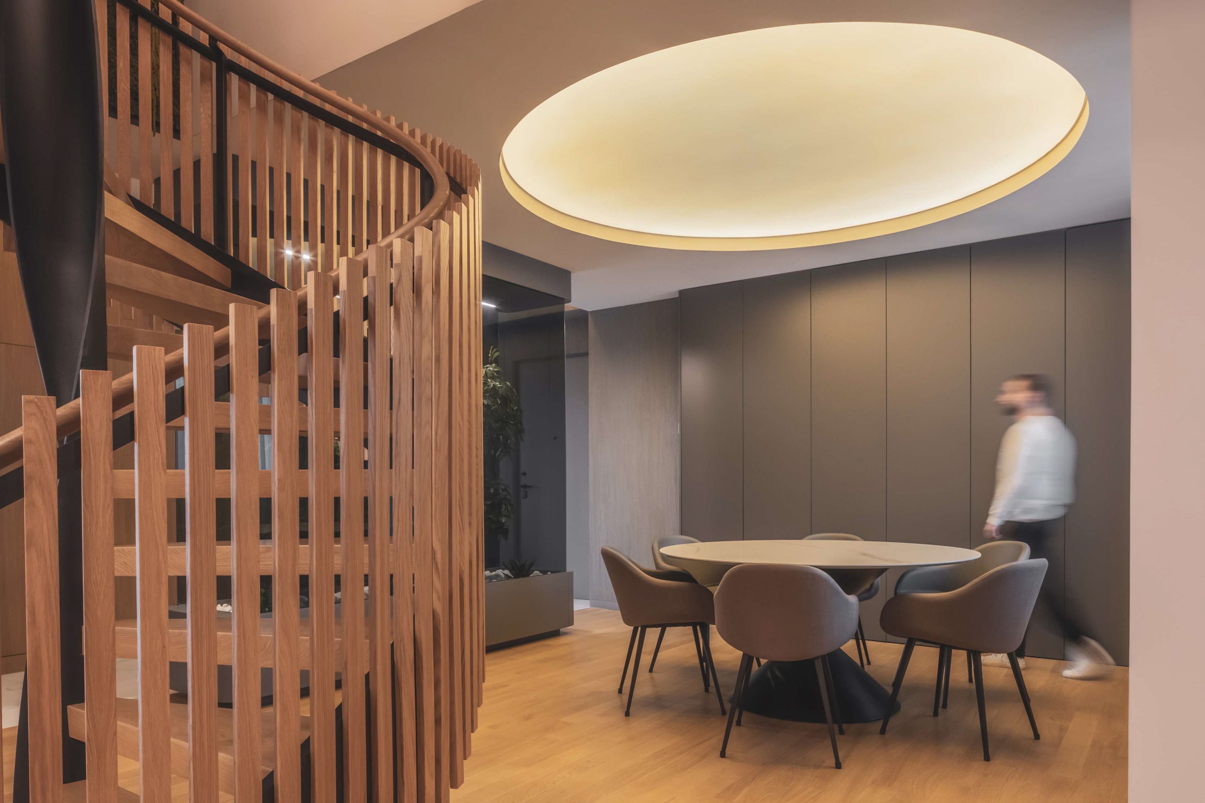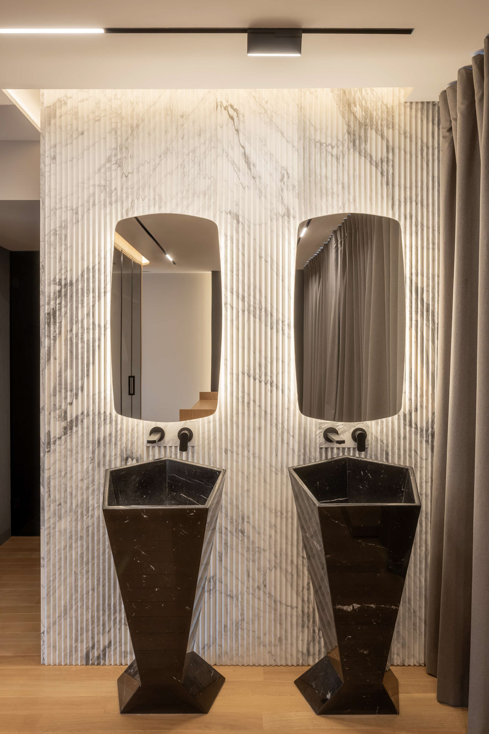 The light wood and stone textures are prevalent throughout the design. An iteration of the vertical line carvings on a marble kitchen island and a master bathroom wall, and the rounded wooden walls in the kitchen, the living room and the master bedroom mold the distinct aesthetics of the interior. A delicately structured spiral staircase was tailored for this unruffled environment.