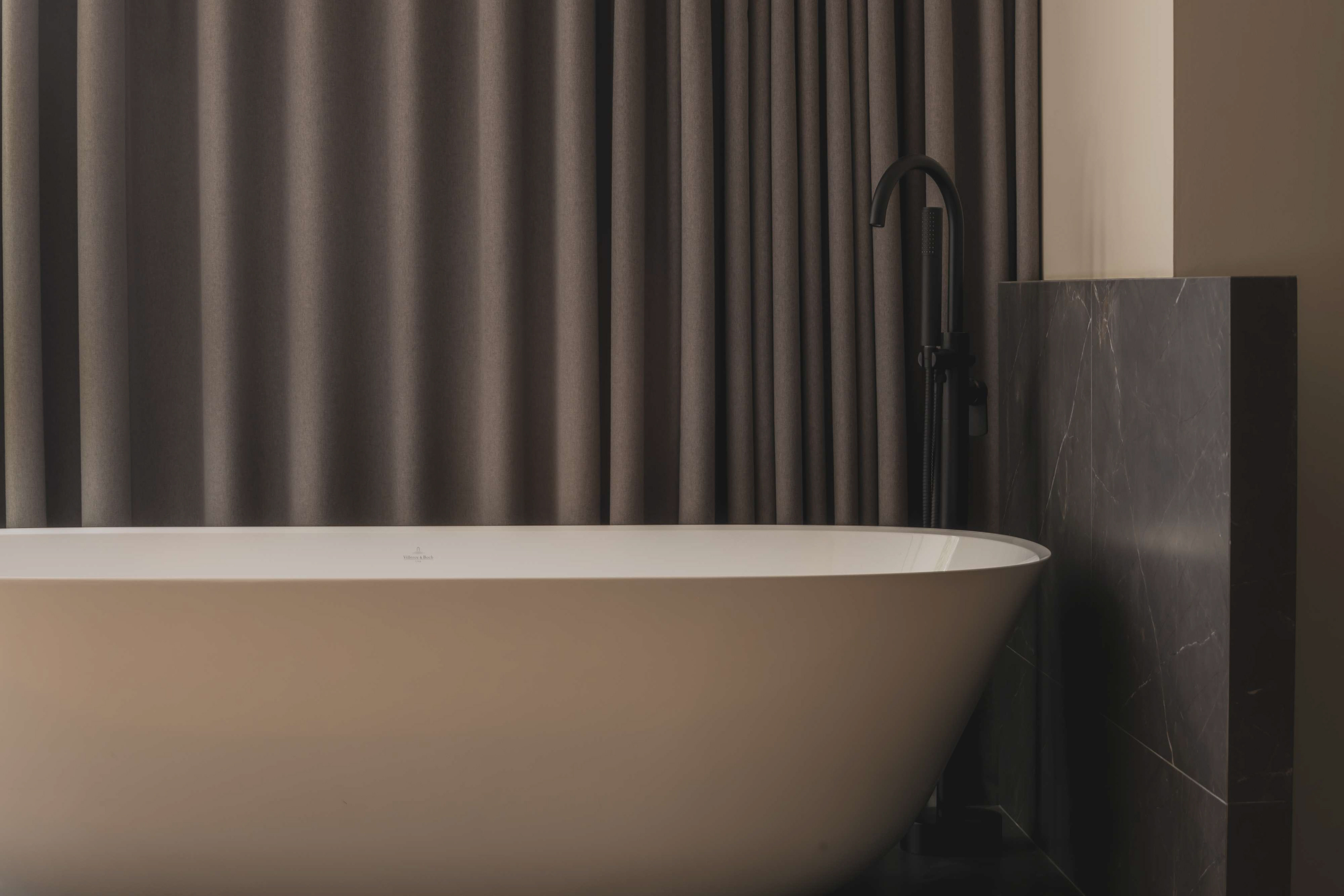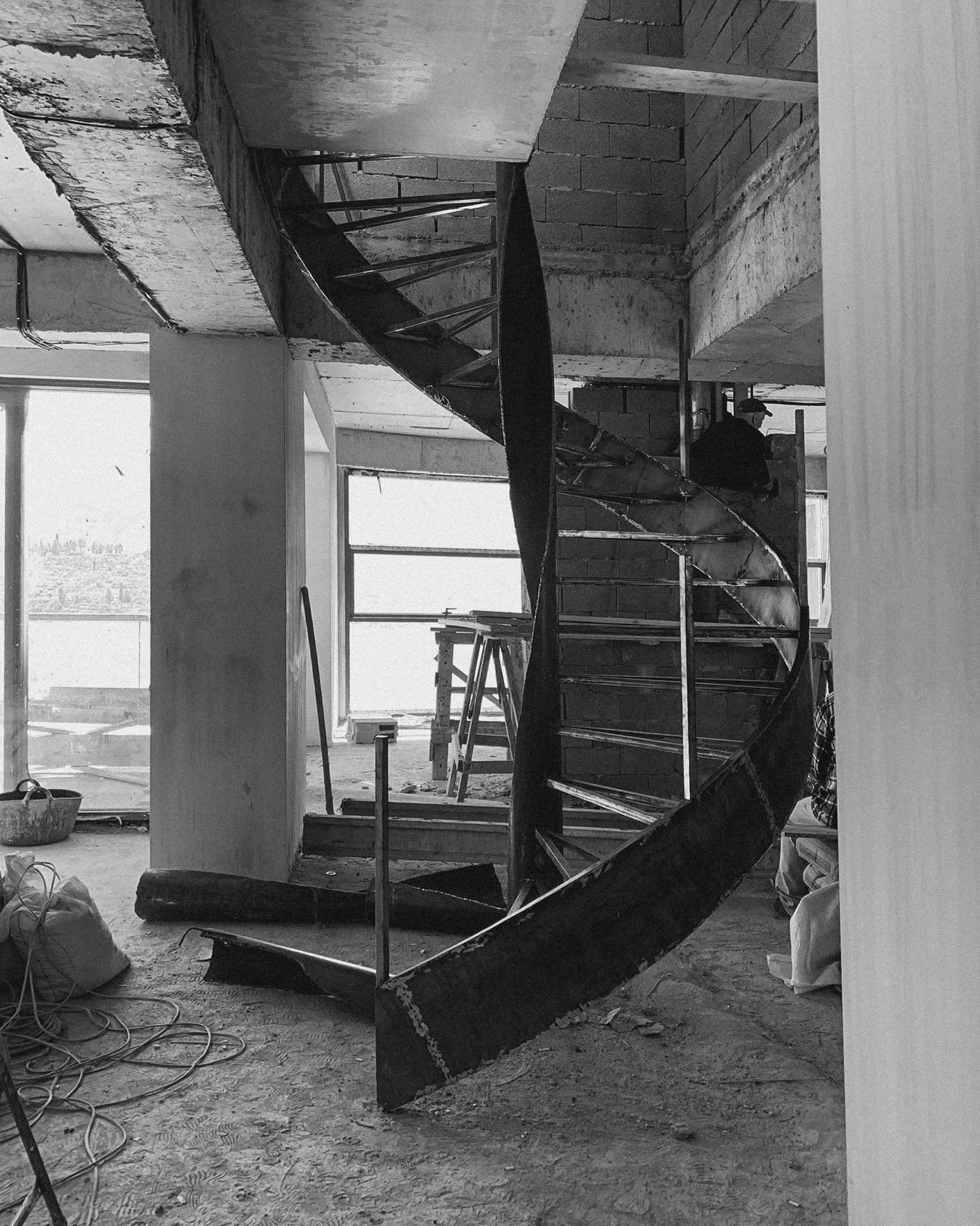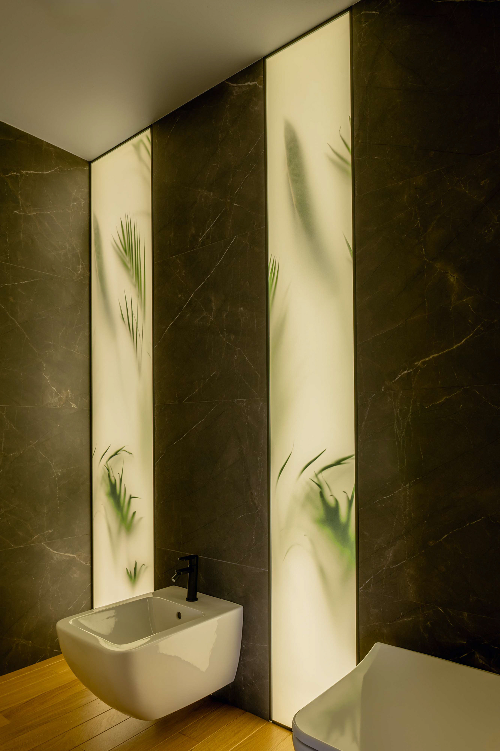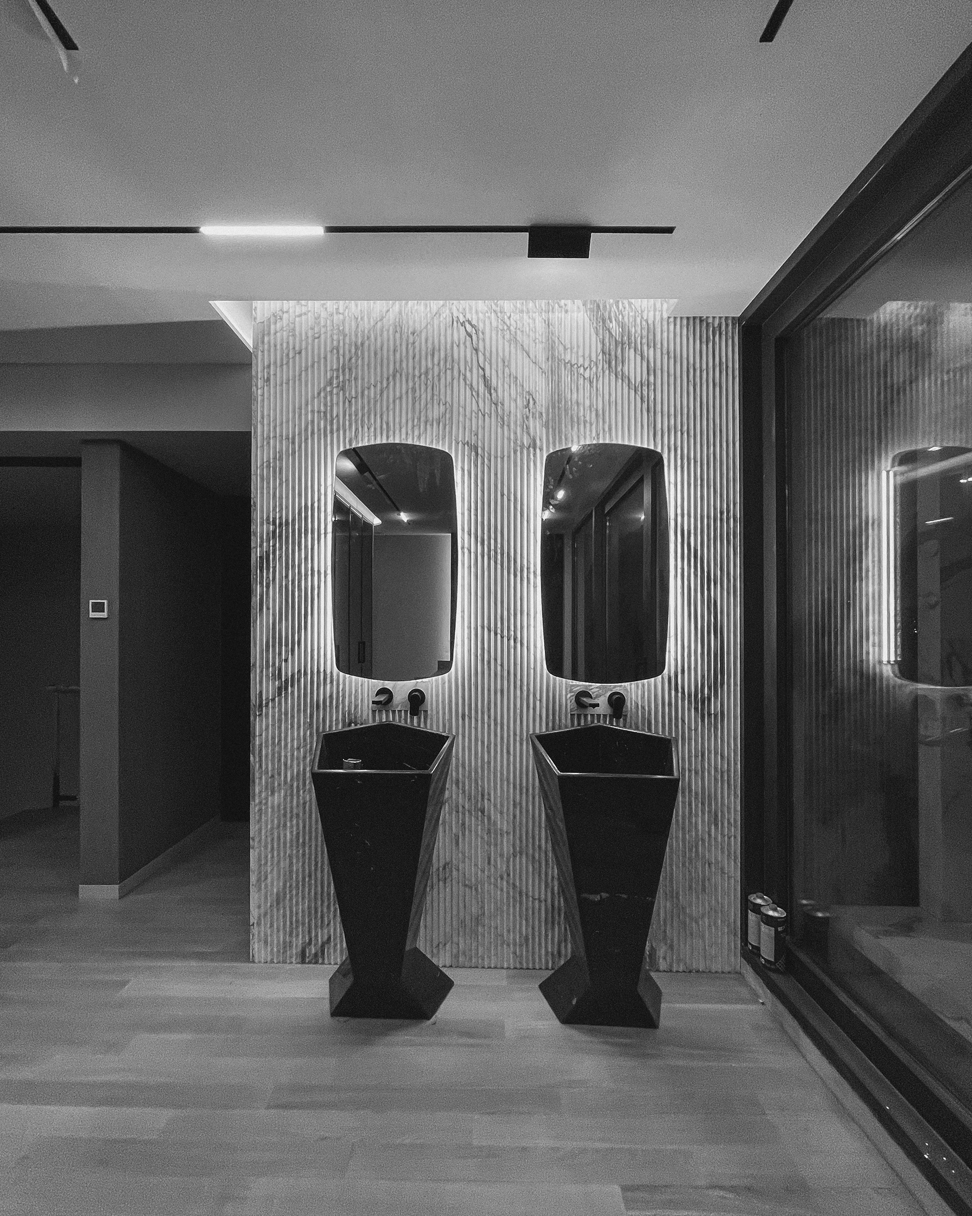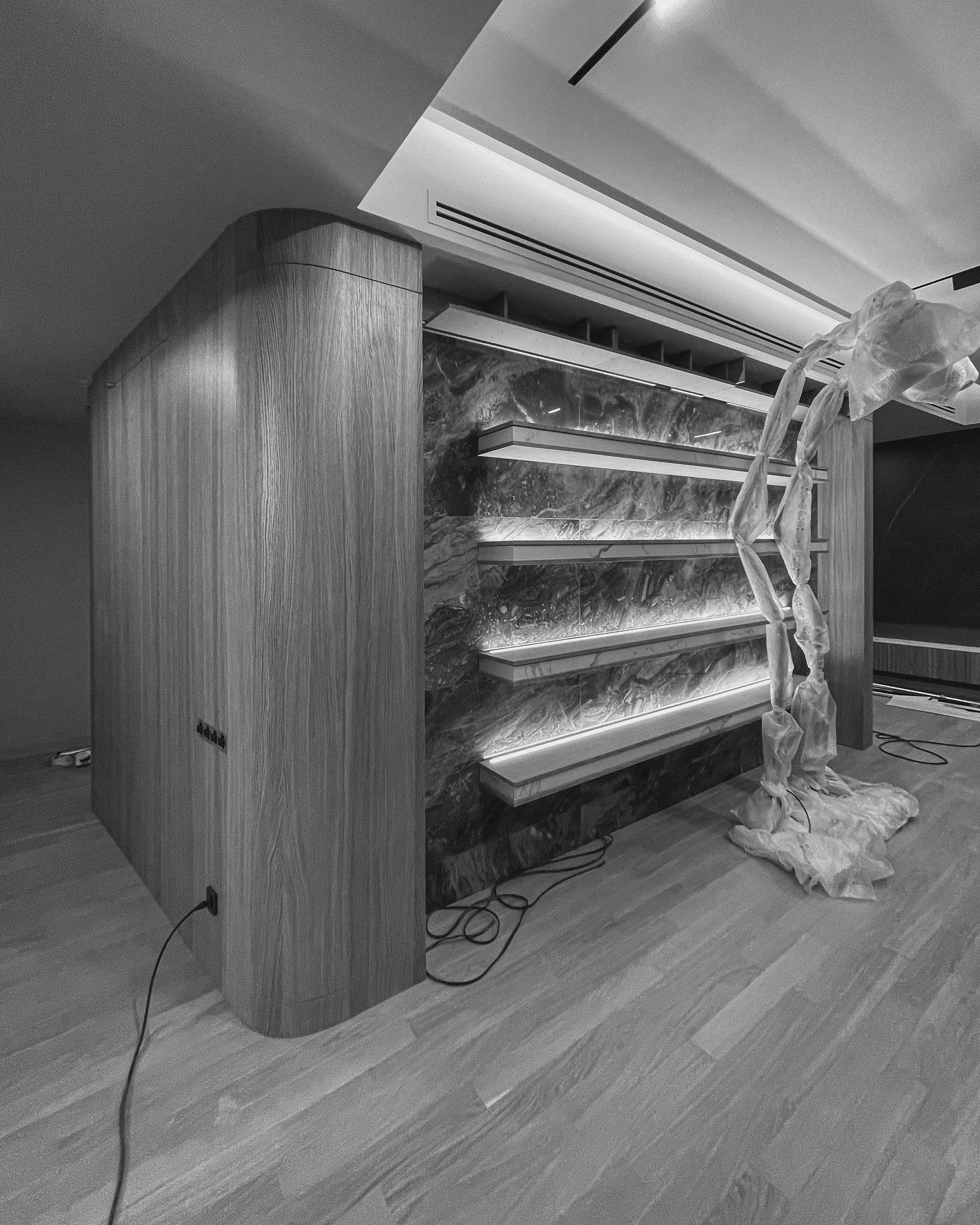 The light wood and stone textures are prevalent throughout the design. An iteration of the vertical line carvings on a marble kitchen island and a master bathroom wall, and the rounded wooden walls in the kitchen, the living room and the master bedroom mold the distinct aesthetics of the interior. A delicately structured spiral staircase was tailored for this unruffled environment.