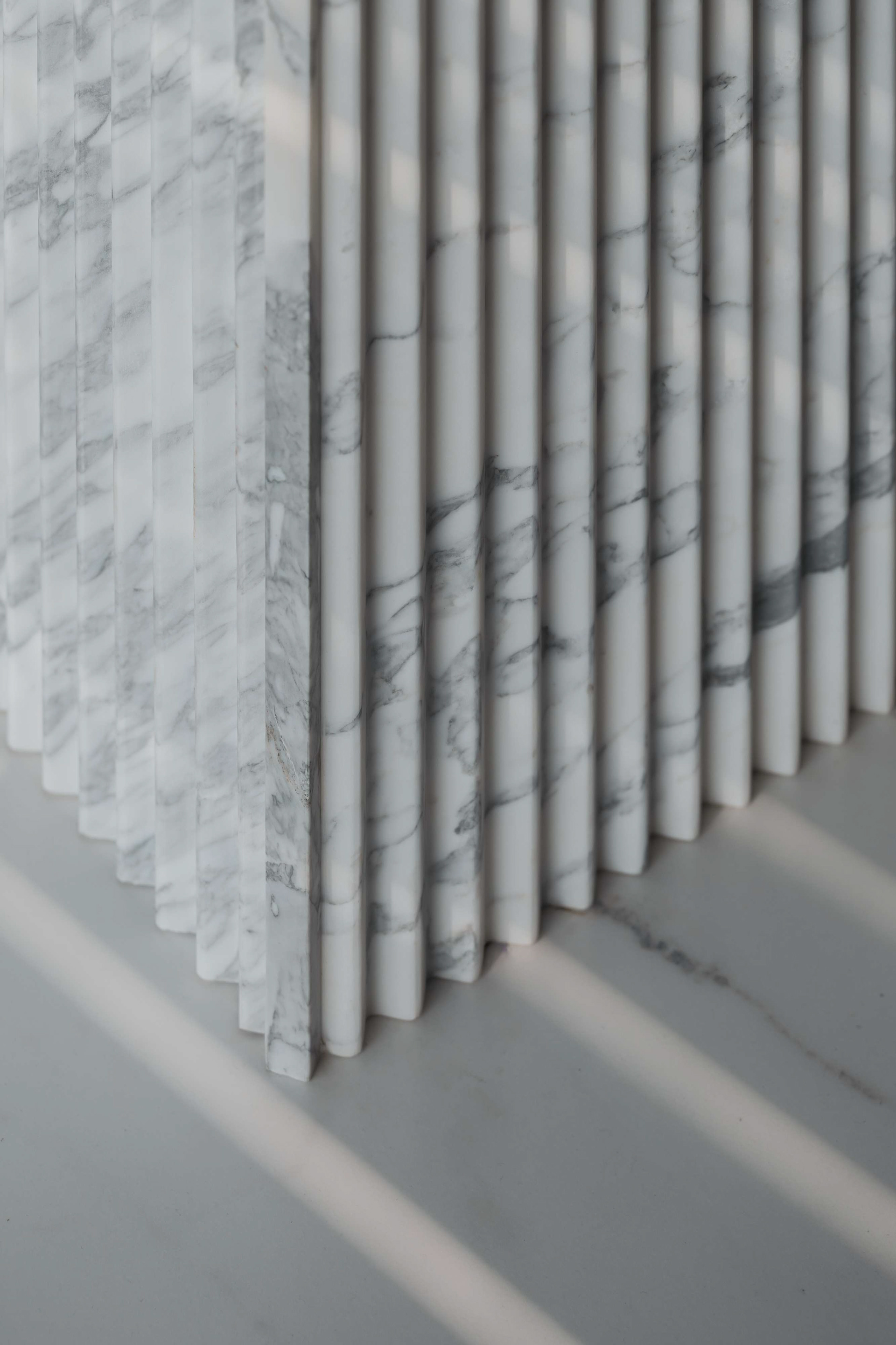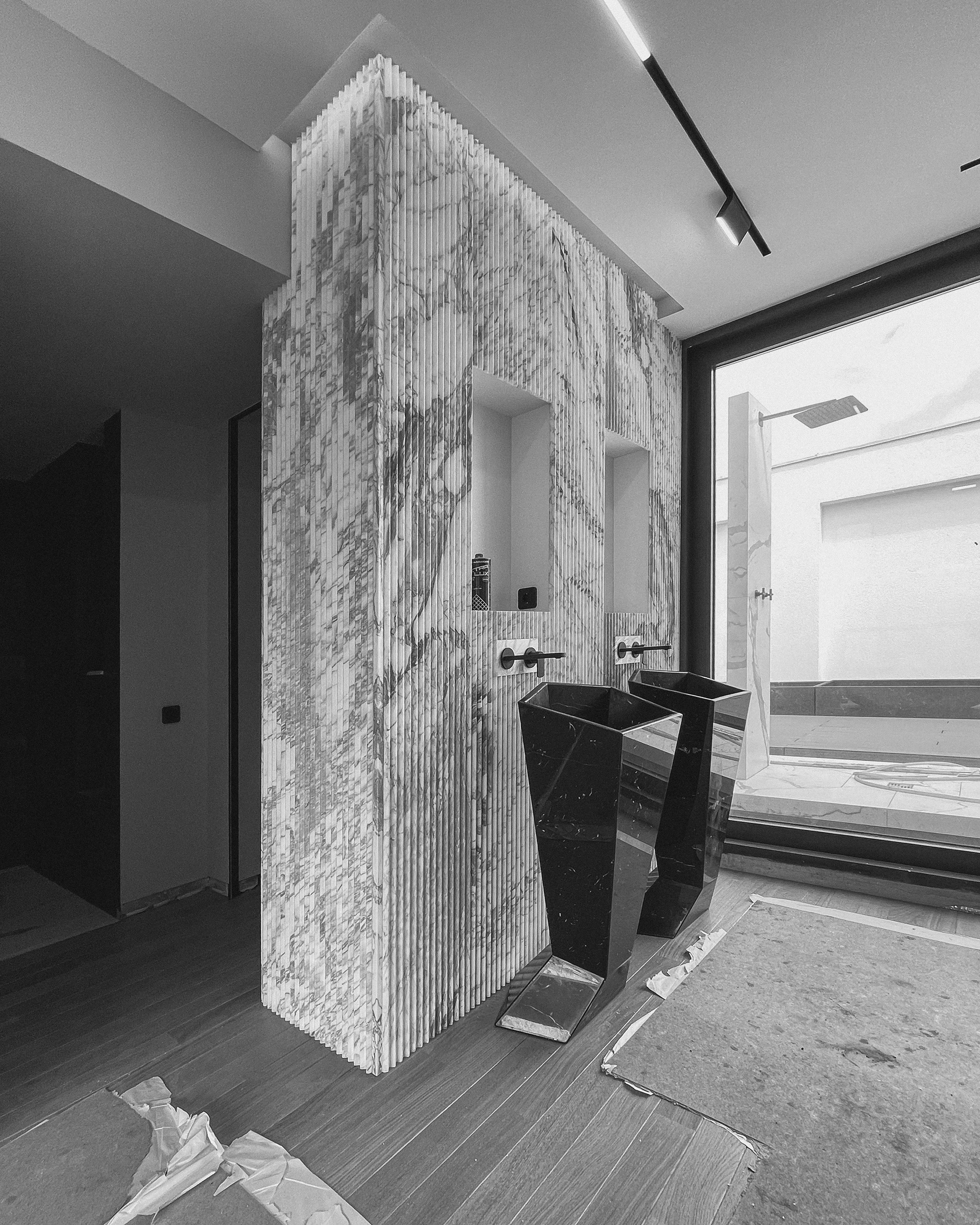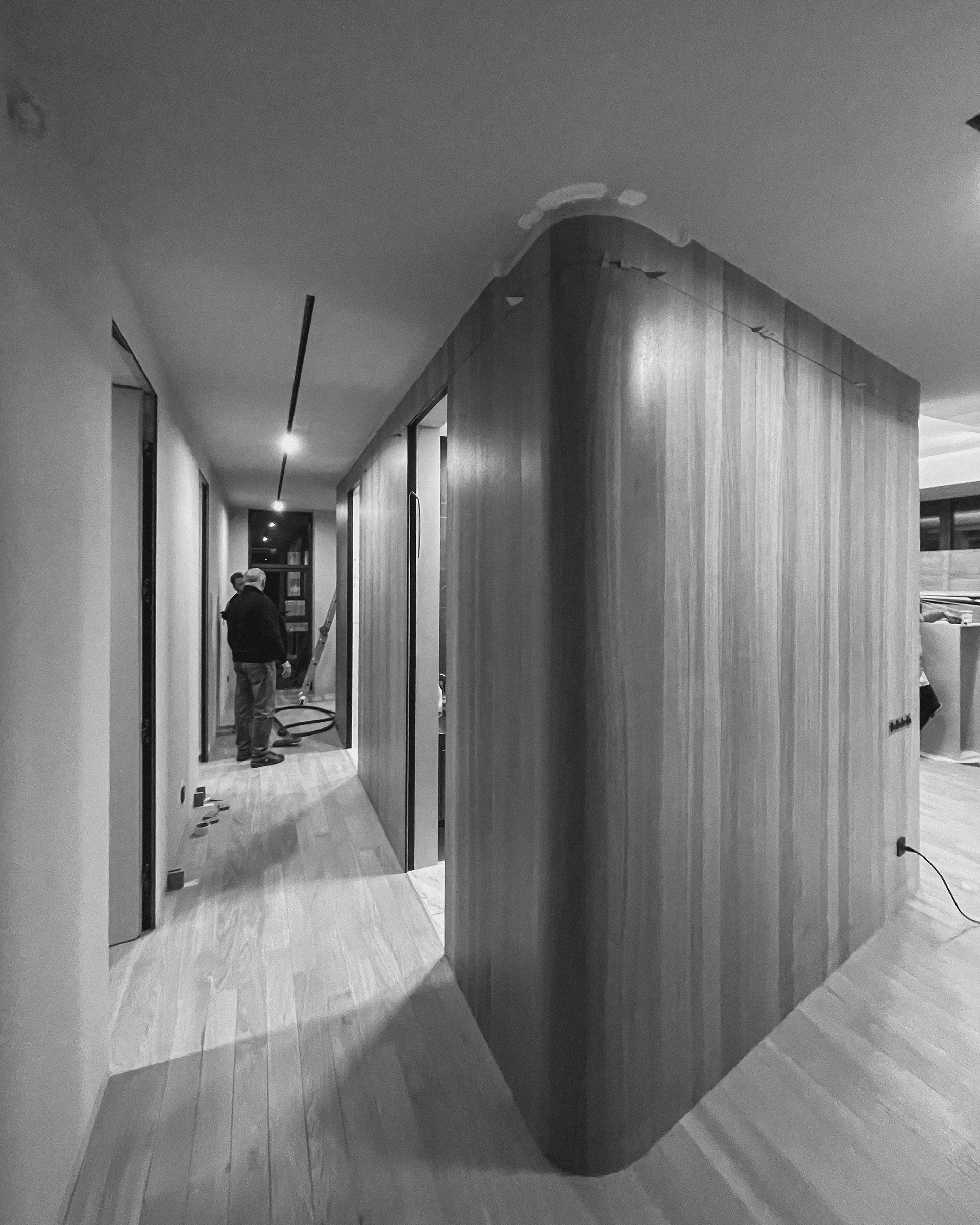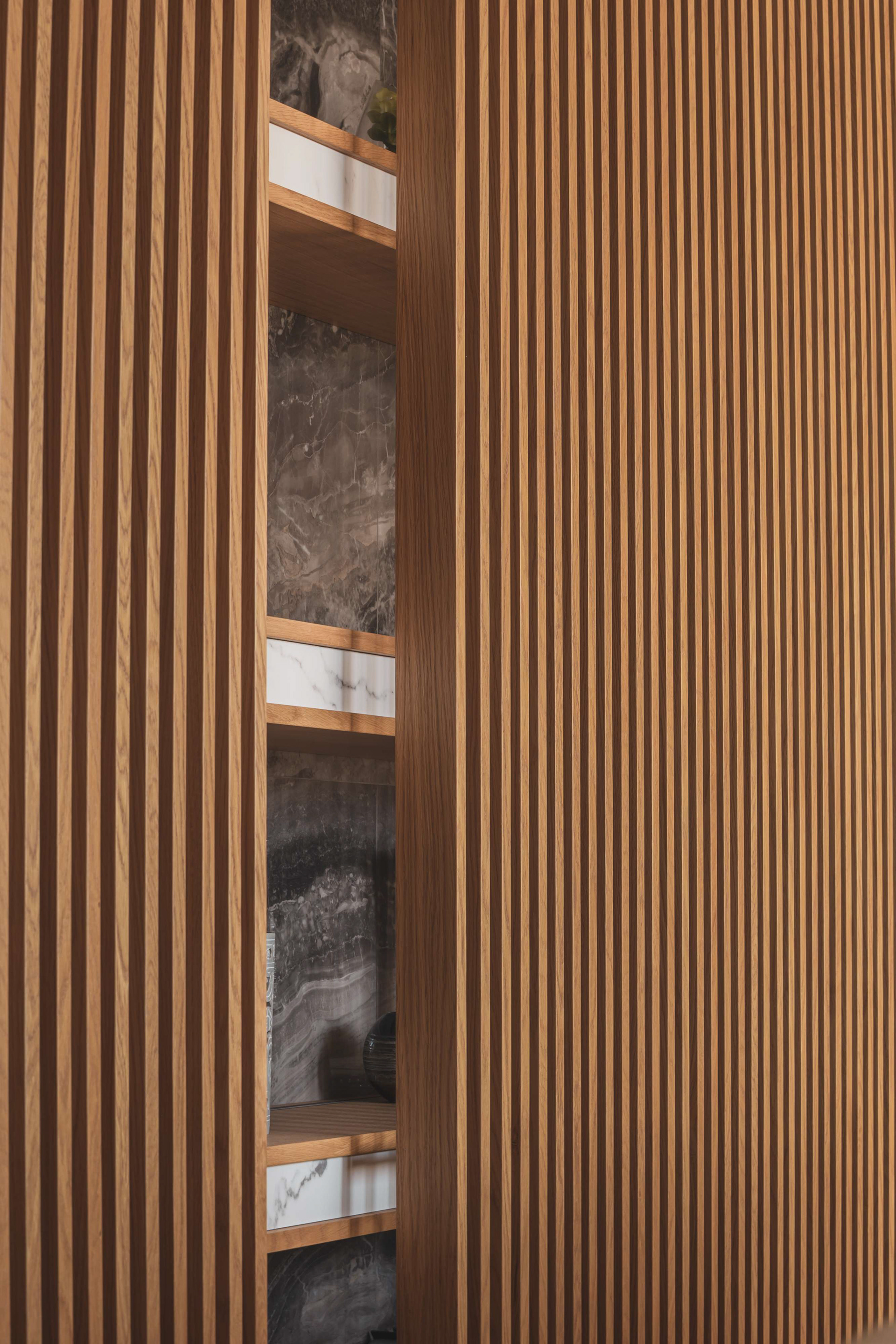 An iteration of the vertical line carvings on a marble kitchen island and a master bathroom wall, and the rounded wooden walls in the kitchen, the living room and the master bedroom mold the distinct aesthetics of the interior