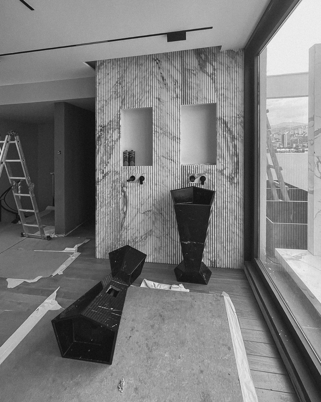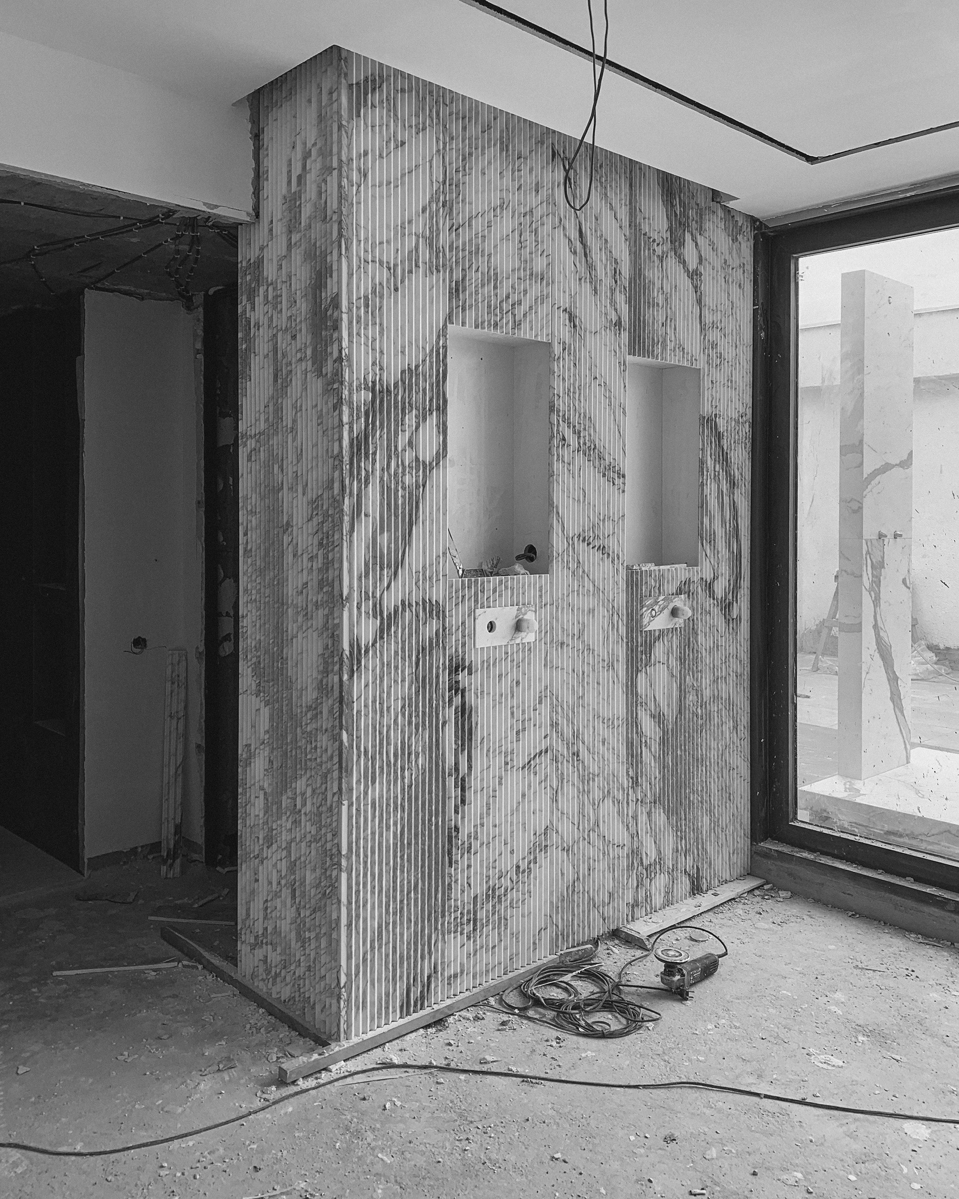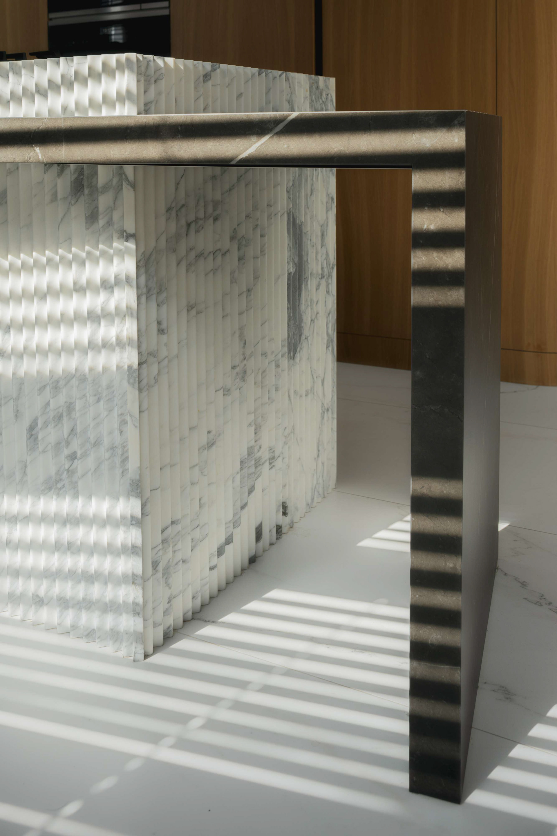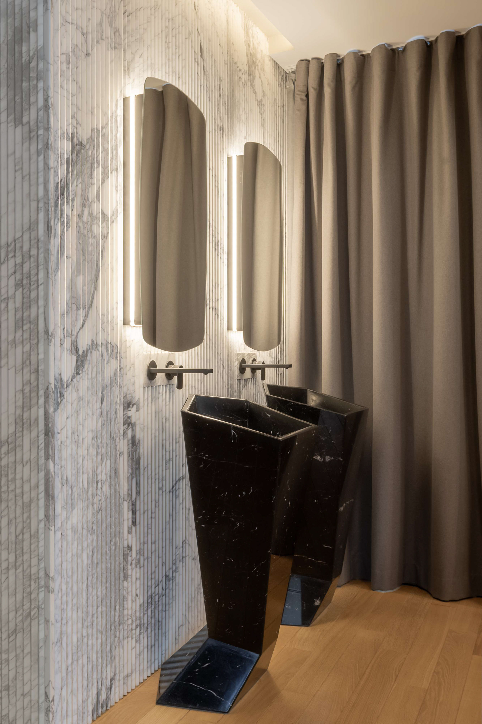 An iteration of the vertical line carvings on a marble kitchen island and a master bathroom wall, and the rounded wooden walls in the kitchen, the living room and the master bedroom mold the distinct aesthetics of the interior