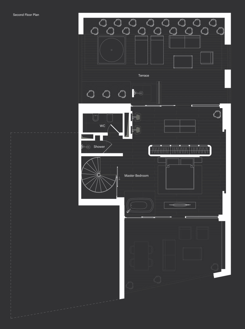The second floor is also allocated to a master bedroom and a bathroom, which also faces the hippodrome.