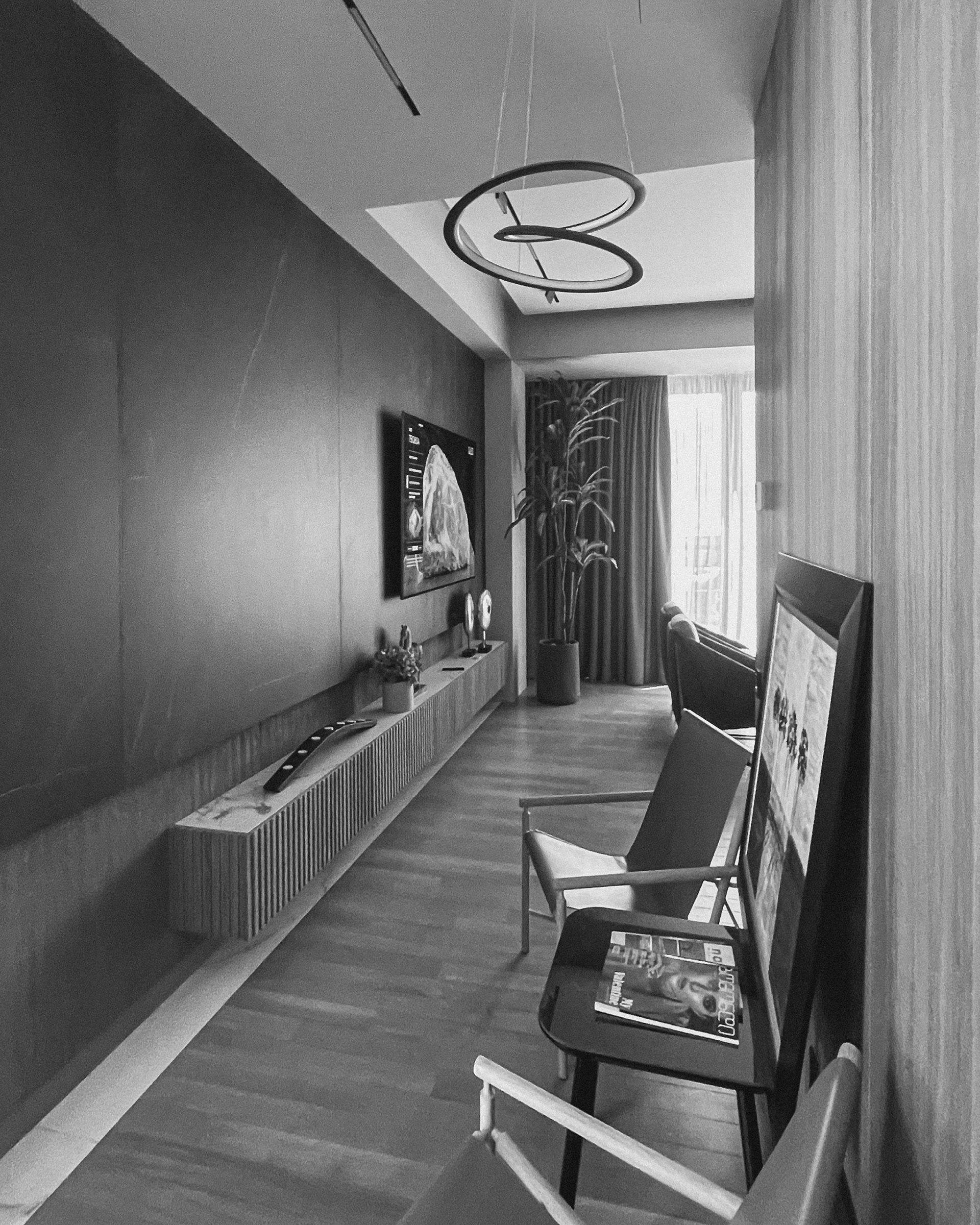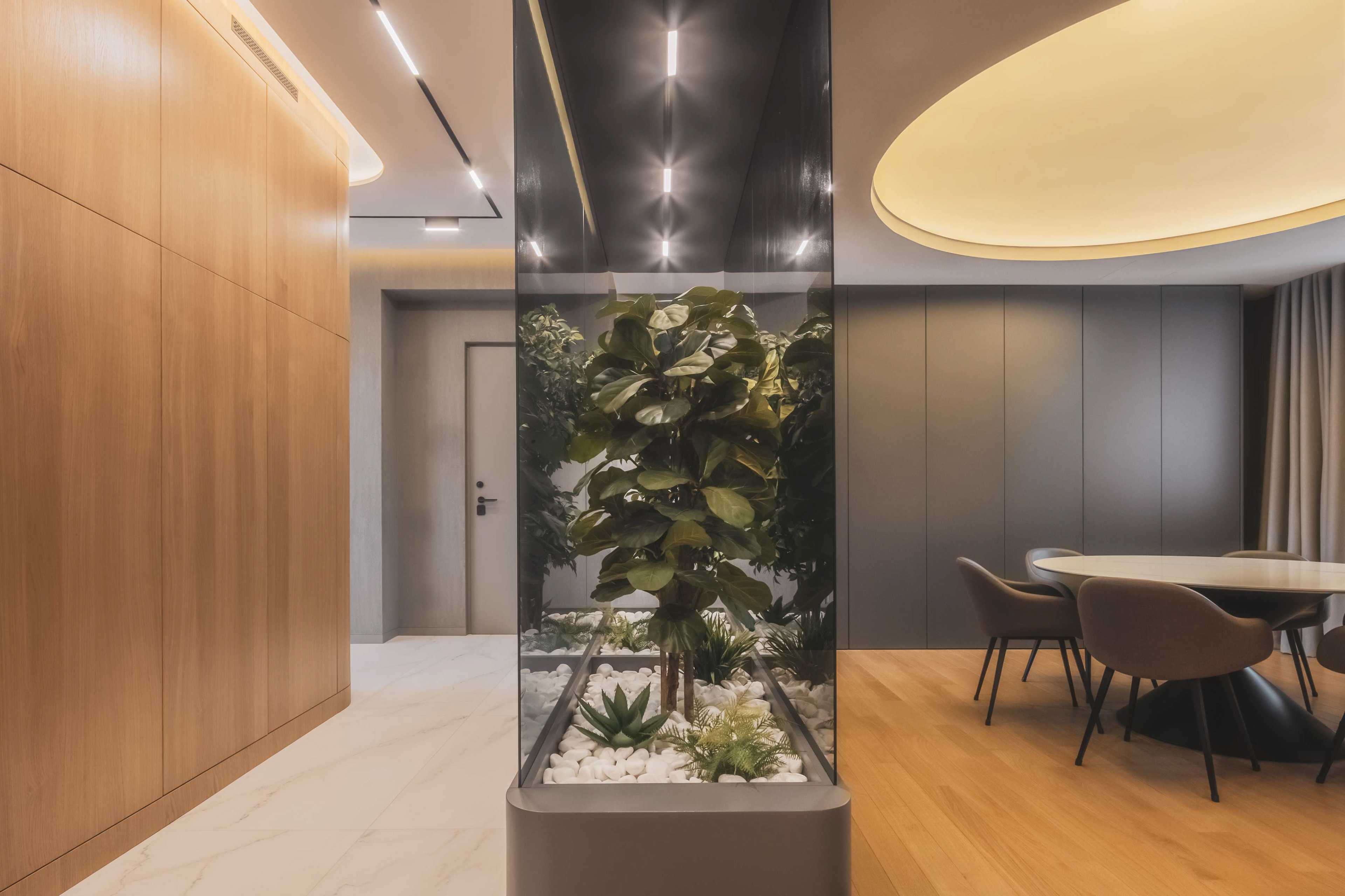 The monotone sequences, the low-profile furniture, and a terrarium wall were the main conducive elements to the development of the placid space