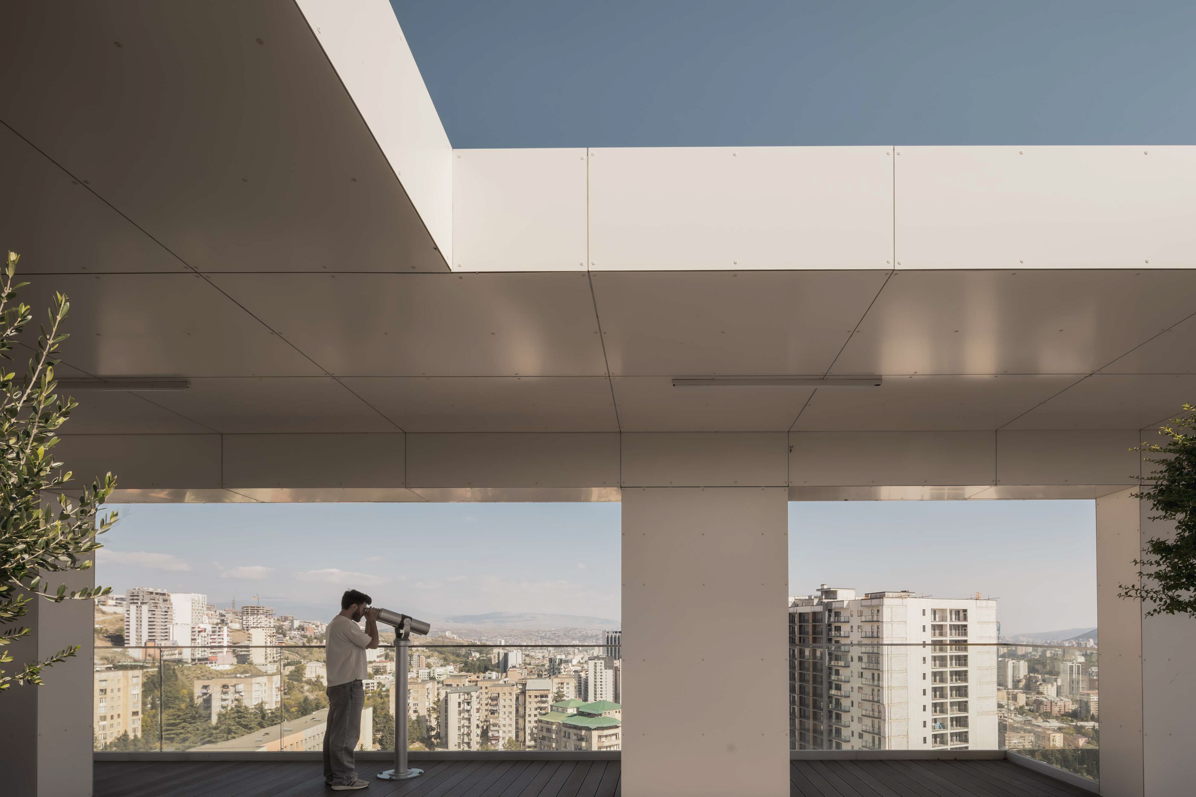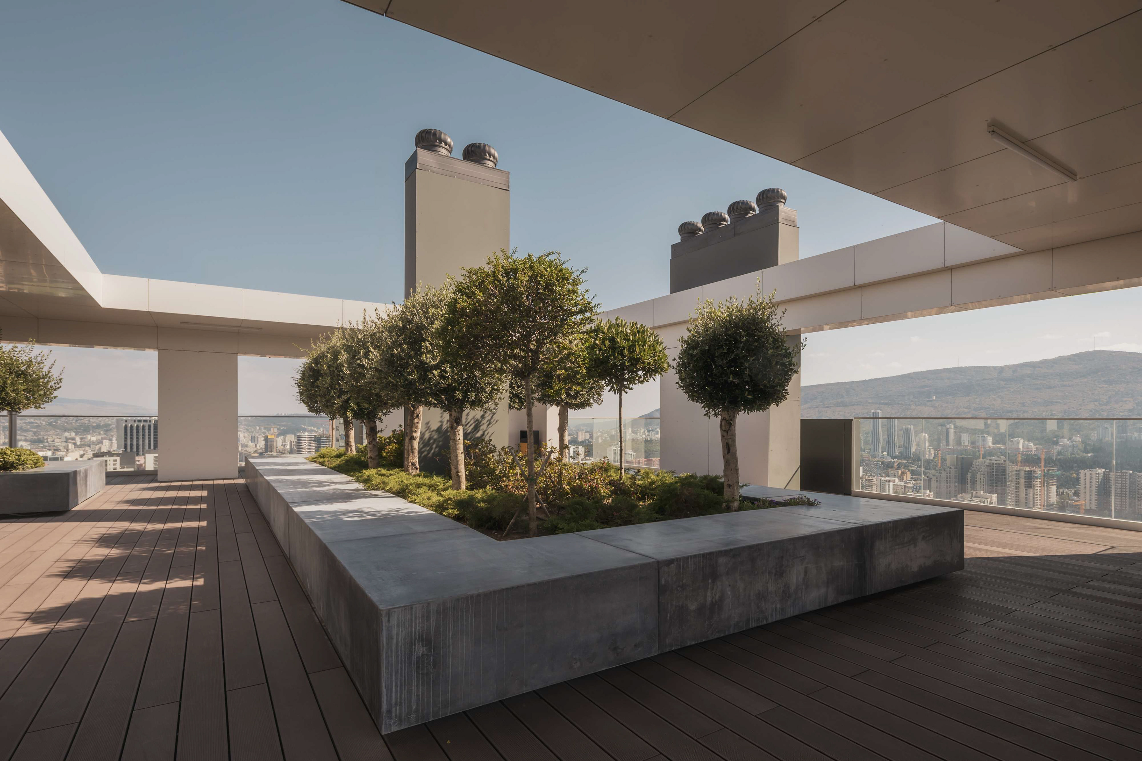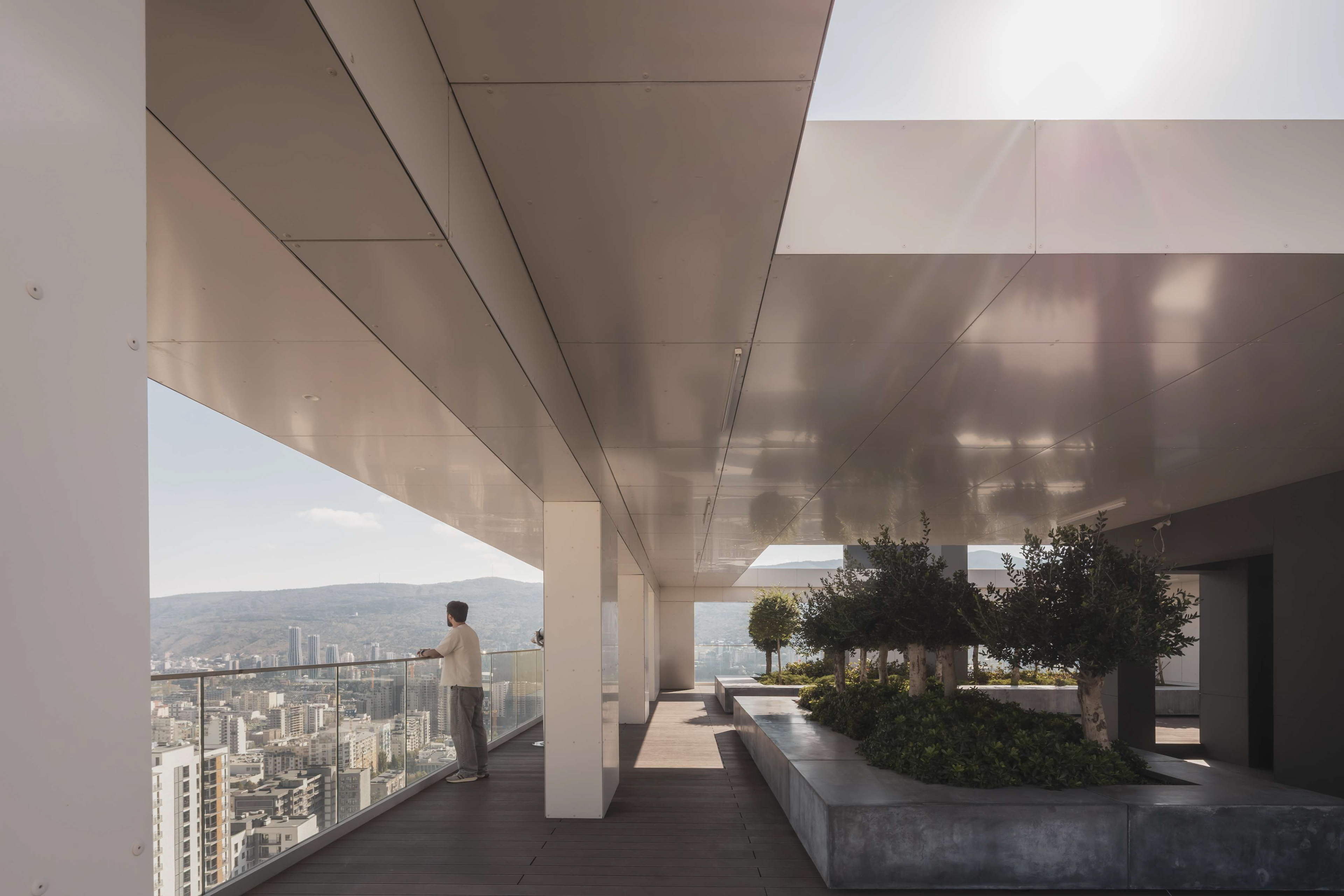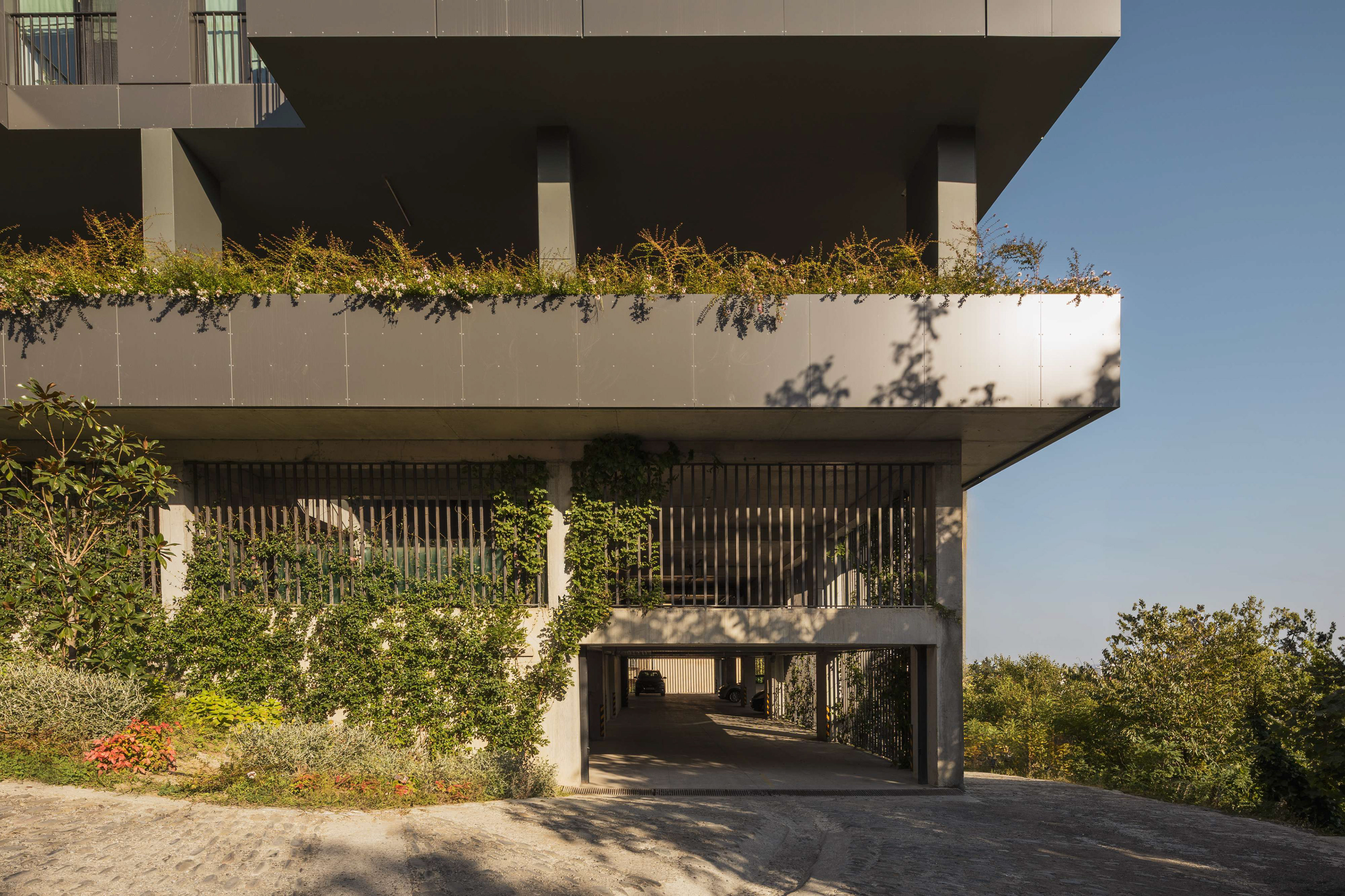 The architecture remains defined by clean geometry and restrained surfaces, allowing greenery and light to become the primary elements of expression. A shared rooftop garden crowns the structure, offering open views across the city and reinforcing the building’s role as a collective space rather than an isolated object.