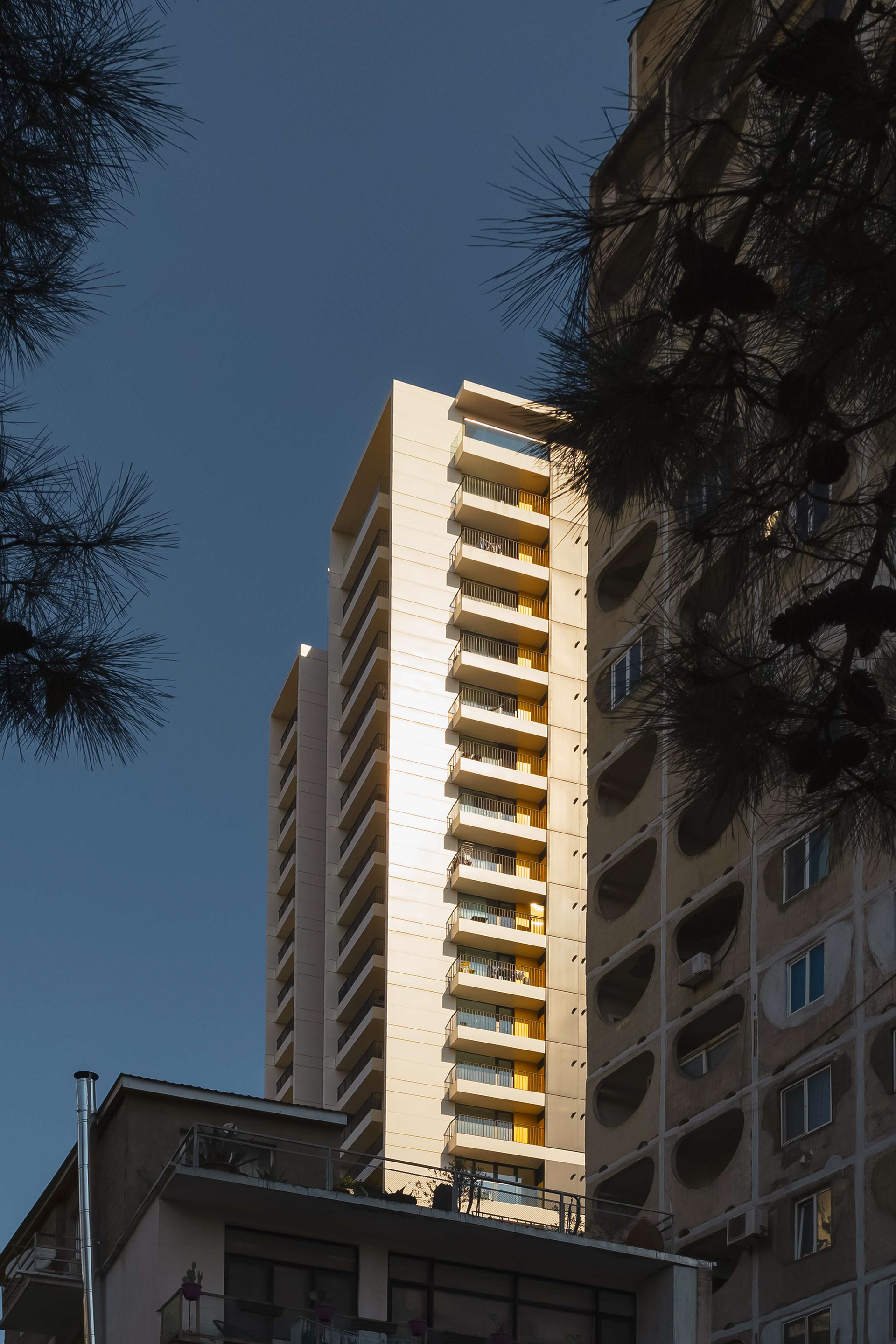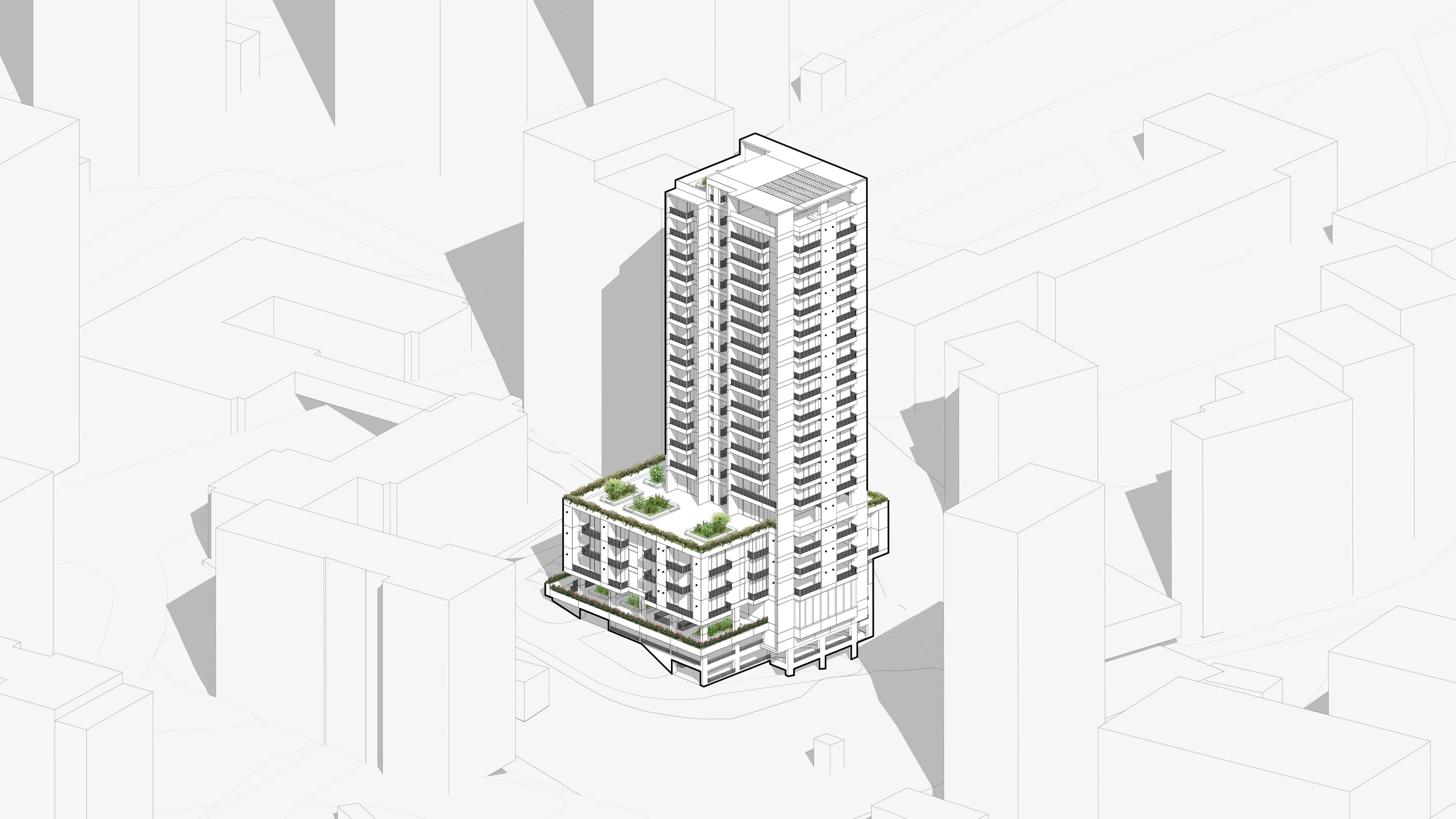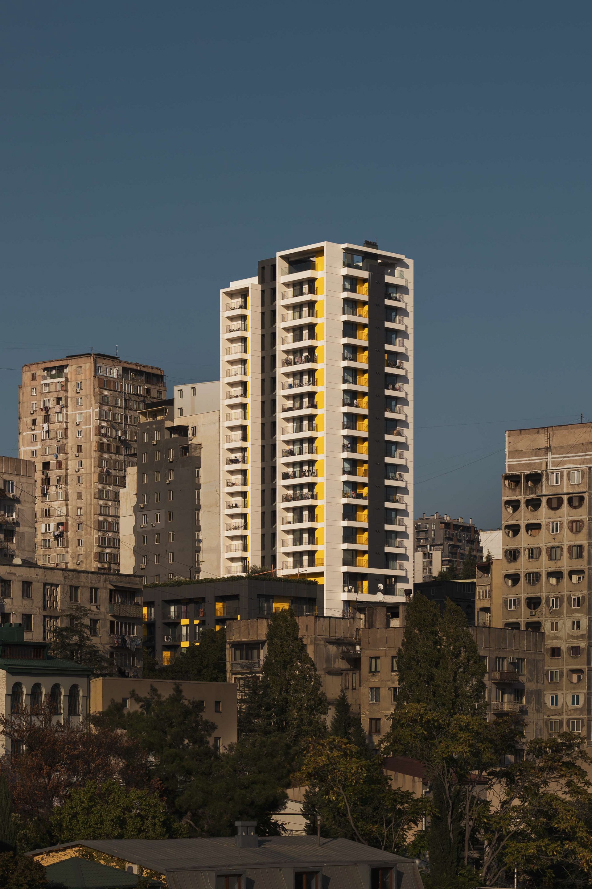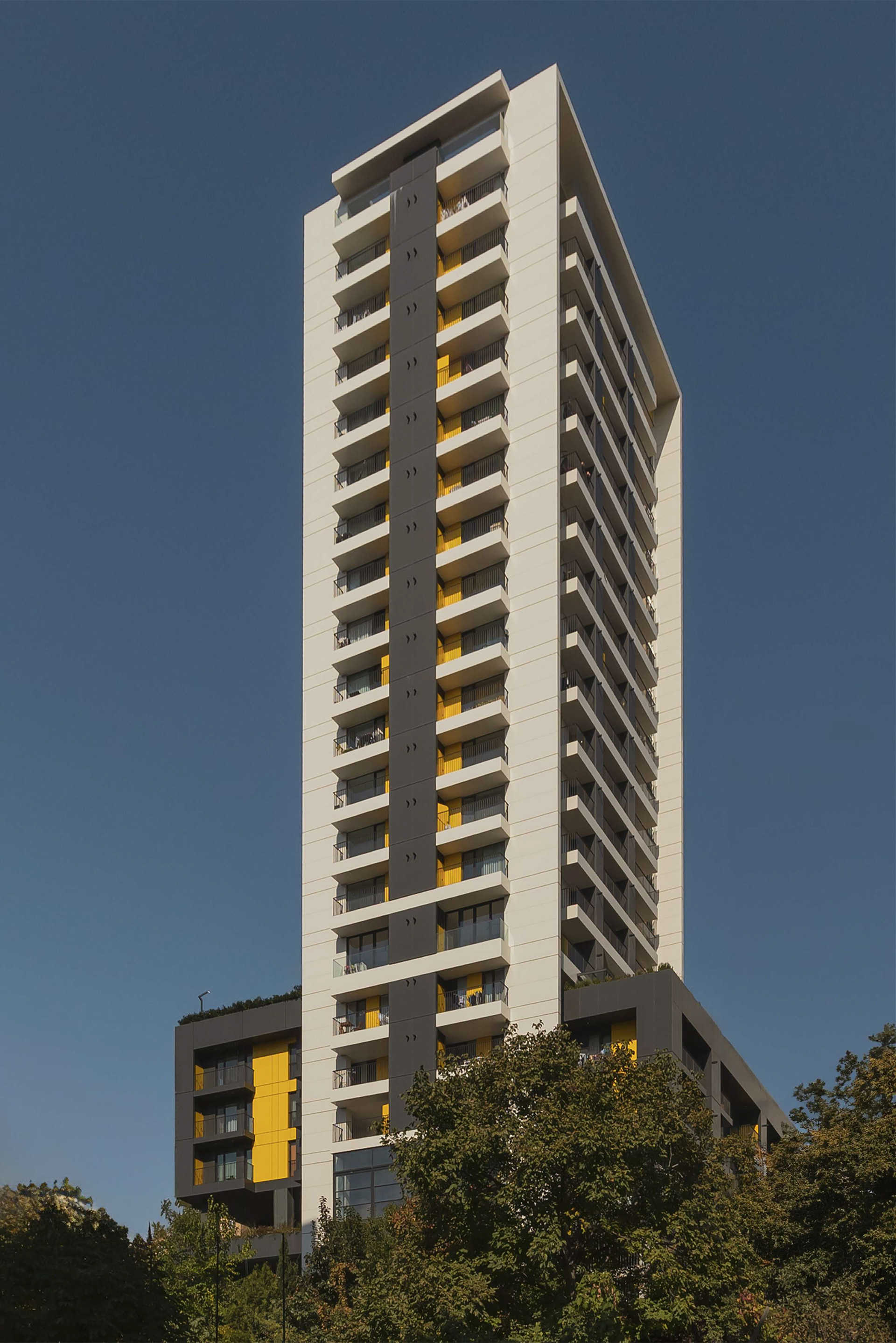 The architecture remains defined by clean geometry and restrained surfaces, allowing greenery and light to become the primary elements of expression. A shared rooftop garden crowns the structure, offering open views across the city and reinforcing the building’s role as a collective space rather than an isolated object.