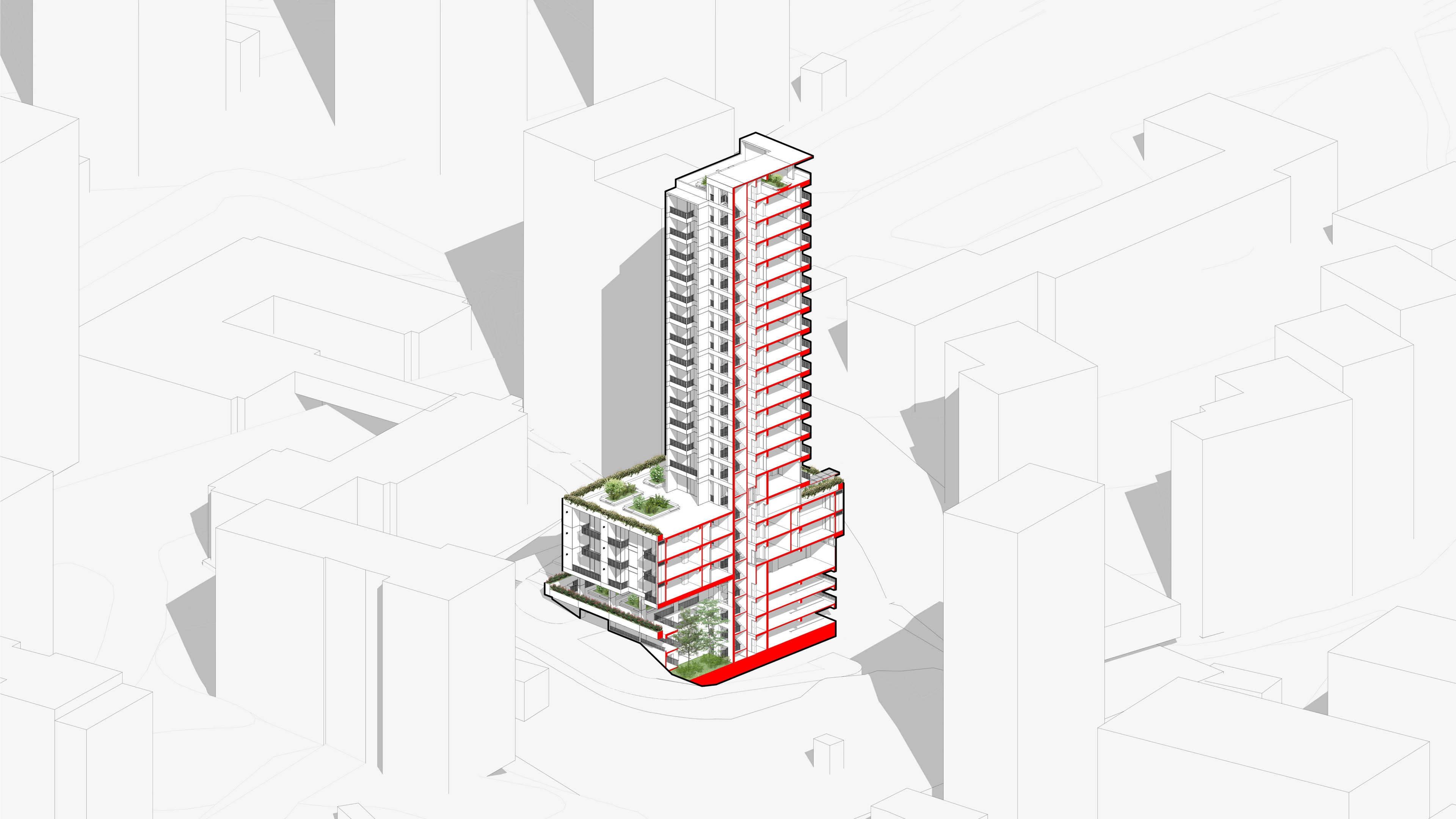 VISSUR is a residential building conceived as a layered urban landscape rather than a closed volume. Green and recreational spaces are integrated throughout the structure, shaping both the architecture and its relationship with the surrounding city.